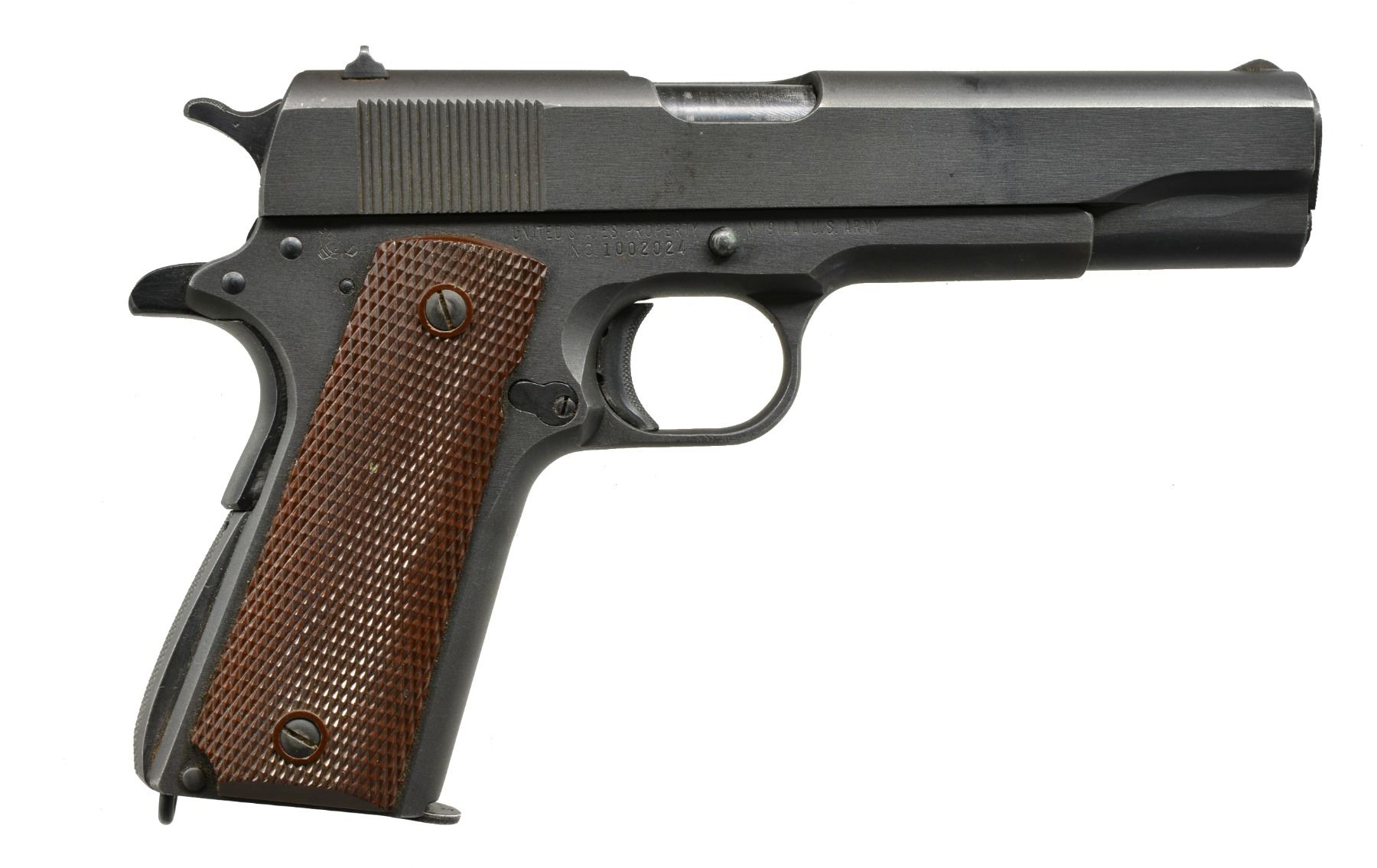 Cal. 45 ACP. S# 1002024. Bbl. 5". Mfg. mid 1943 w/ in group of 125,000 for Army contract. Mid-year features include Colt Type 6 bbl. marked w/ "COLT 45 AUTO" along w/ "P" on left leg & serrated slide lock. Slide w/ Type 3 "N.Y. U.S.A." markings. Balance w/ all correct features including: sandblast blued finish having slight temper line at front of slide, Keyes Fibre sm. ring grips, checkered thumb safety w/out milling cut, Type 2 fine checkered arched mainspring housing w/ lanyard loop, "P" proofs, cross cannons proof & FJA inspector mark. MAGS: 1 good Scovill for Colt 7 rd. w/ pinned base marked "S" on upper side of lip & "C-S" on bottom; normal Remington Rand mags. were by Scovill w/out "C-S" on bottom. CONDITION: very good overall appearance w/ faint high point wear on slide & dust cover of frame along w/ occasional light scratches plus light function wear. Near excellent bore & grips. (20-935/NW). CURIO. $900-1,400.