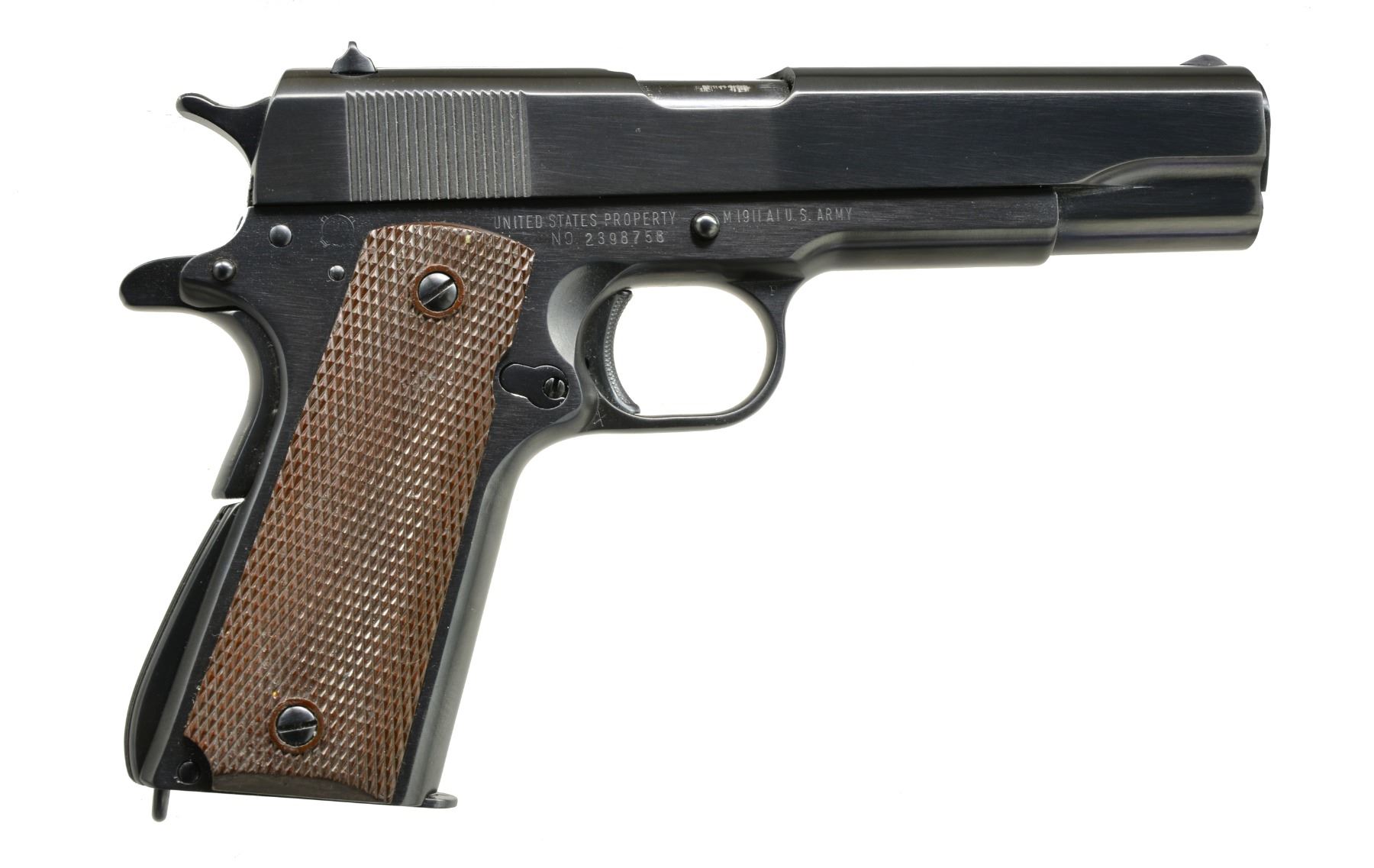 Cal. 45 ACP. S# 2398758. Bbl. 5". Mfg. 1945 w/ correct features including: 8 rib arched mainspring housing, serrated front sight, square notch rear sight, Keyes Fibre ringed grips, Flannery Type 19 bbl. & late grooved slide stop. MAGS: 1 very good refinished M.S. Little 7 rd. CONDITION: very good to excellent appearance as completely refinished including all of bbl. & spring guide. Very good grips w/ slight hand wear. Poor to fair bore w/ dark pitting in grooves. Slide sits somewhat forward on frame & lighter than normal trigger pull. (19-5976/NW). CURIO. $700-1,100.
