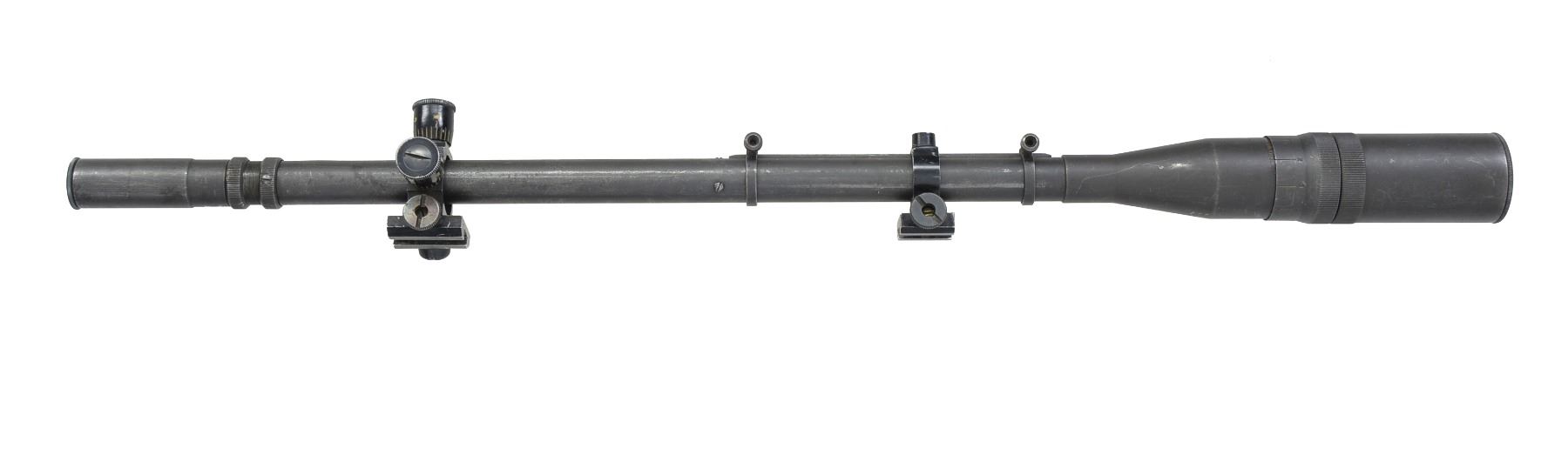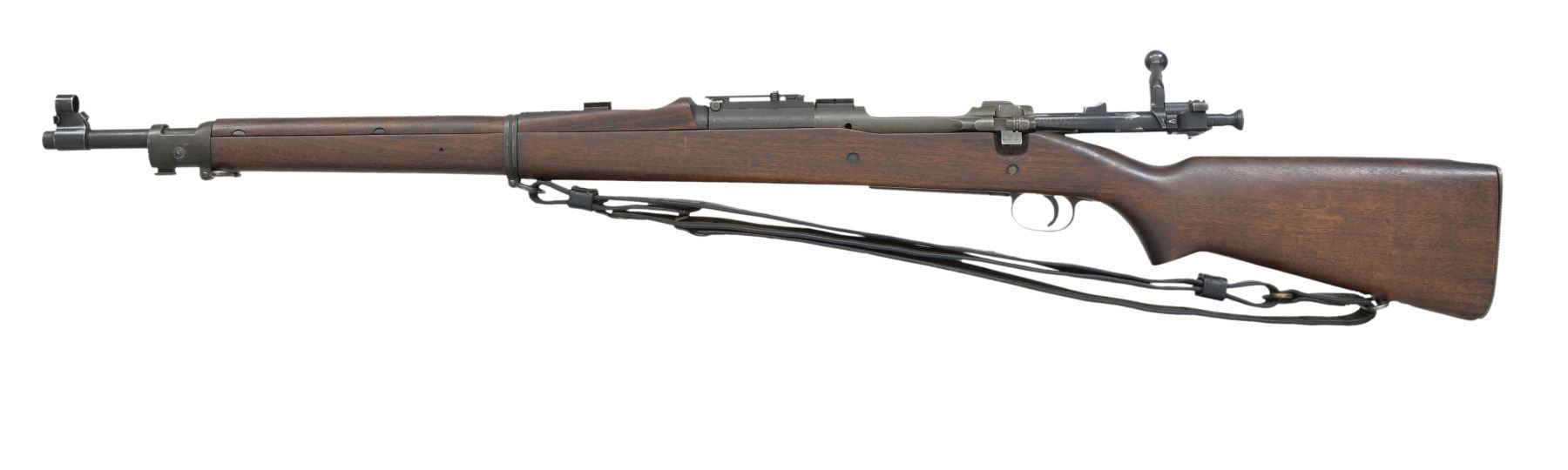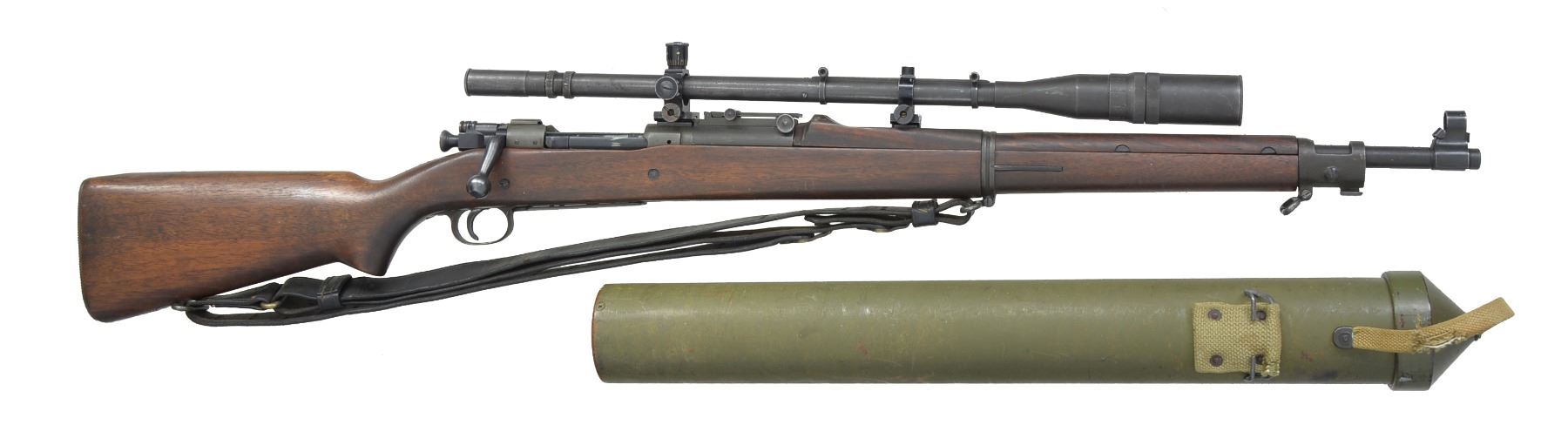 Cal. 30-06. S# 955667. Extremely scarce original World War II era Sniper set w/ scope, scope carrier, correct sling & front sight cover. Rifles were assembled at the Marine Depot in Philadelphia, Pennsylvania as a replacement for the earlier Models using the Lyman 5A telescopic sight. According to "the Model 1903 Springfield Rifle" by Joe Poyer, early models were assembled from National Match rifles, but later models were made from selected 1903A1 rifles. The Unertl scope was recommended for adoption by Marine Corp. Equipment Board after studying various telescopes under field conditions. The sniping combination served in WWII & the Korean conflict until it"s eventual replacement by the M1 Garand Sniper rifle. This rifle has a 24" bbl. marked "SA" flaming bomb "7-42". Late production Remington bolt electro penciled to match S#. Ladder rear sight graduated to 2,850 yds. Dished elevation & windage knobs. Moveable base is marked "R". Fixed sight base made w/out lightening cuts. Blade front sight w/ sheet metal sight protector. Receiver ring & bbl. fitted w/ dovetail scope bases 7.2" on center. All milled furniture. Checkered National Match trap buttplate. National Match type serrated trigger. US 1907 sling marked "J.C.S. CO. C.E.B.". Receiver bridge has been drilled & tapped on right sight for Lyman sight. Matching walnut "C" stock w/ 2 recoil bolts. Stock is unmarked except for "S" in cutoff recess, indicating mfg. by Springfield Armory. Rifle includes correct Unertl 8x power target telescope w/ 3/4" tube. Scope was supplied w/out recoil spring due to concerns that sand from beaches working under the spring could score the tube. Has correct 2nd ring behind front mt. Mounts are blackened duralumin. Scope has AO & screw in lens caps. Fine crosshair reticle w/ dot. UNATTACHED ACCESSORIES: nickel plate oiler in butt. Screw in lens caps for scope. Includes extremely rare Micarta carrying case w/ quick detachable cap retains by strap. Case has inside spring loaded conical mount for objective scope bell. CONDITION: original finish stock set has very nice appearance w/ scattered sm. handling marks. Height reduction of handguard appears to be correctly machine done. Rectangular mortise for forward scope dovetail shows hand type fitting. Metal parts show very lg. % of wartime parkerizing w/ greenish shades, except bolt which is black & shows light wear patterns. Near excellent shiny bore. Scope retains 60% dark parkerized finish w/ thinning, light wear & scattered very fine pitting. Optics are serviceable, but slightly cloudy. Ocular lens has slightly separated appearance. Scope case has thinning OD green paint, but is in otherwise good serviceable condition. There is an approx. 1" abrasion w/ losses on web retaining strap. Rifle sling has light wear & flexing. (20-901/RW). CURIO. $10,000-15,000.