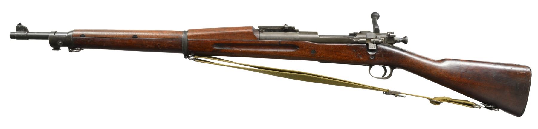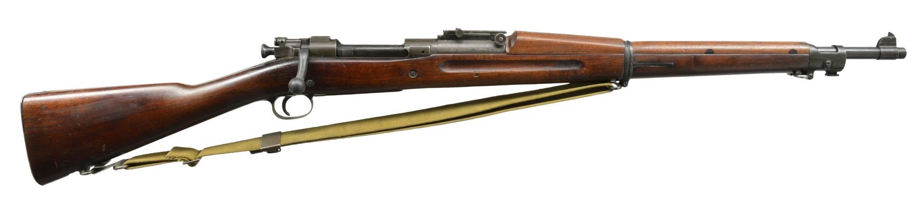 ACTION RIFLES. 1) ROCK ISLAND MODEL 1903. Cal. 30-06. S# 7711. Bbl. 24" marked "SA flaming bomb 8-44". Ladder rear sight graduated to 2,850 yds. w/out volley notch. Flat windage & elevation knobs, windage knob marked "R". Sight base made w/out lightening cuts. Sight base has electro pencil number on left side "H171175 3680550". Replacement 1903A3 bolt w/ swept handle marked on bolt root "HO" &" 18". Marked underneath "SA". All milled furniture. Flat trap buttplate. Straight grip walnut stock set. Stock tip marked w/ "S". Marked on left side over mag. "7K". Marked under grip w/ 2 "P"s. 2 Recoil bolts. Green web sling. CONDITION: stock set has worn original finish w/ scattered scratches & handling marks throughout. Metal has 80% World War II vintage parkerized finish. Good bore w/ strong lands. (20-1084/RW). 2) SPRINGFIELD MODEL 1898 KRAG. Cal. 30-40 Krag. S# 482870. Bbl. 30". 1901 Ladder rear sight graduated to 2,000 yds. Blade front sight. Smooth trap buttplate. Matching walnut stock set. Stock has legible inspectors mark on left side boxed "JSA 1901" & encircled script "P" under grip. Straight cut bolt handle seat. CONDITION: stock has worn thinning original finish w/ scratches & handling marks throughout commensurate w/ long service. Lightly worn receiver retains traces of case colors. Bbl. has thin original blue w/ scattered sm. spots of oxidation. Poor heavily worn bore turning dark in grooves & scattered fine pitting throughout. (20-1134/RW). ALL CURIO. $1,000-1,300.