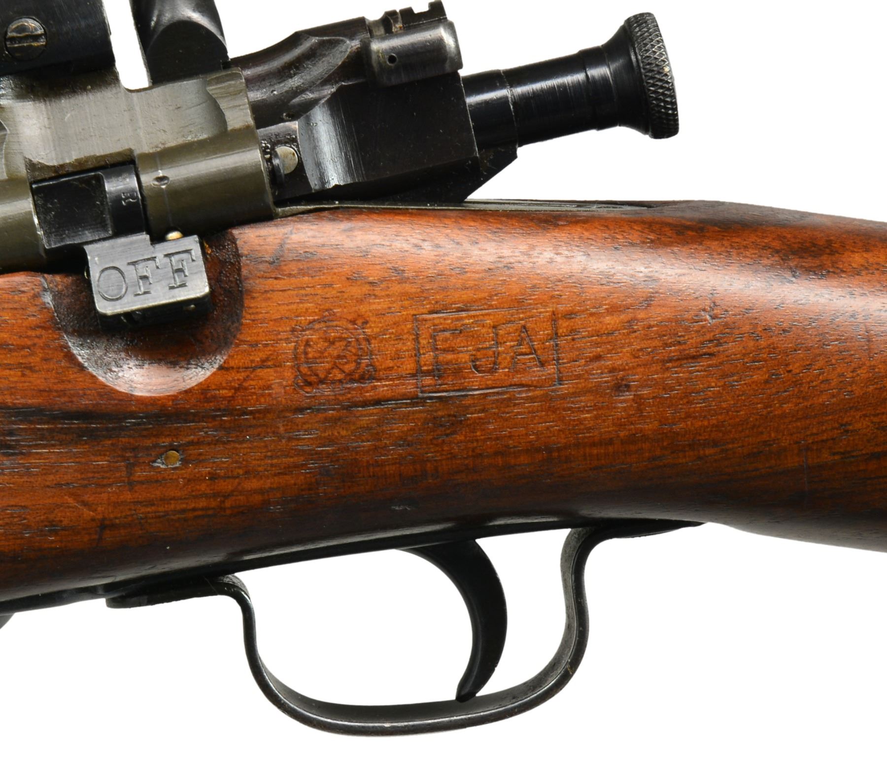Cal. 30-06. S# 3384825. Bbl. 24" is marked behind front sight "RA" & flaming bomb & "1-43". Has adj. aperture rear sight. Blade front sight. Front sight has stamped protective cover. Bolt is marked underneath handle "1". Scalloped bolt sleeve marked "1". Has mag. cut off marked "R". Has all stamped furniture, including fine checkered trap buttplate & sm. trigger guard bow. Matching walnut straight grip stock set w/ cross pins. Stock is marked on left side w/ box "FJA" & crossed cannons. Marked behind trigger guard w/ encircled "P" & "11". Marked ahead of trigger guard w/ numerous inspector marks. Has plastic oiler w/ cleaning thong in butt. CONDITION: stock set has very good original finish w/ light wear & scratches. Has WWII type parkerizing w/ greenish cast. Bolt is black. Stamped parts are finished blue. Near excellent 4 grooved bore. (20-1305/RW). CURIO. $500-700.