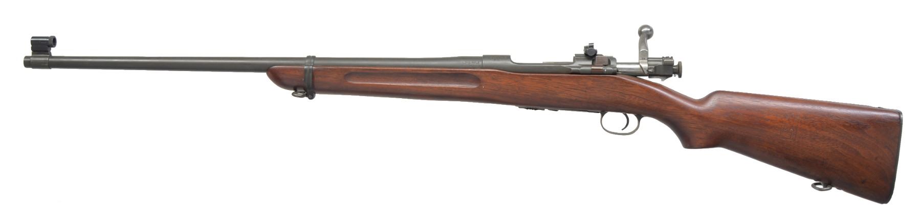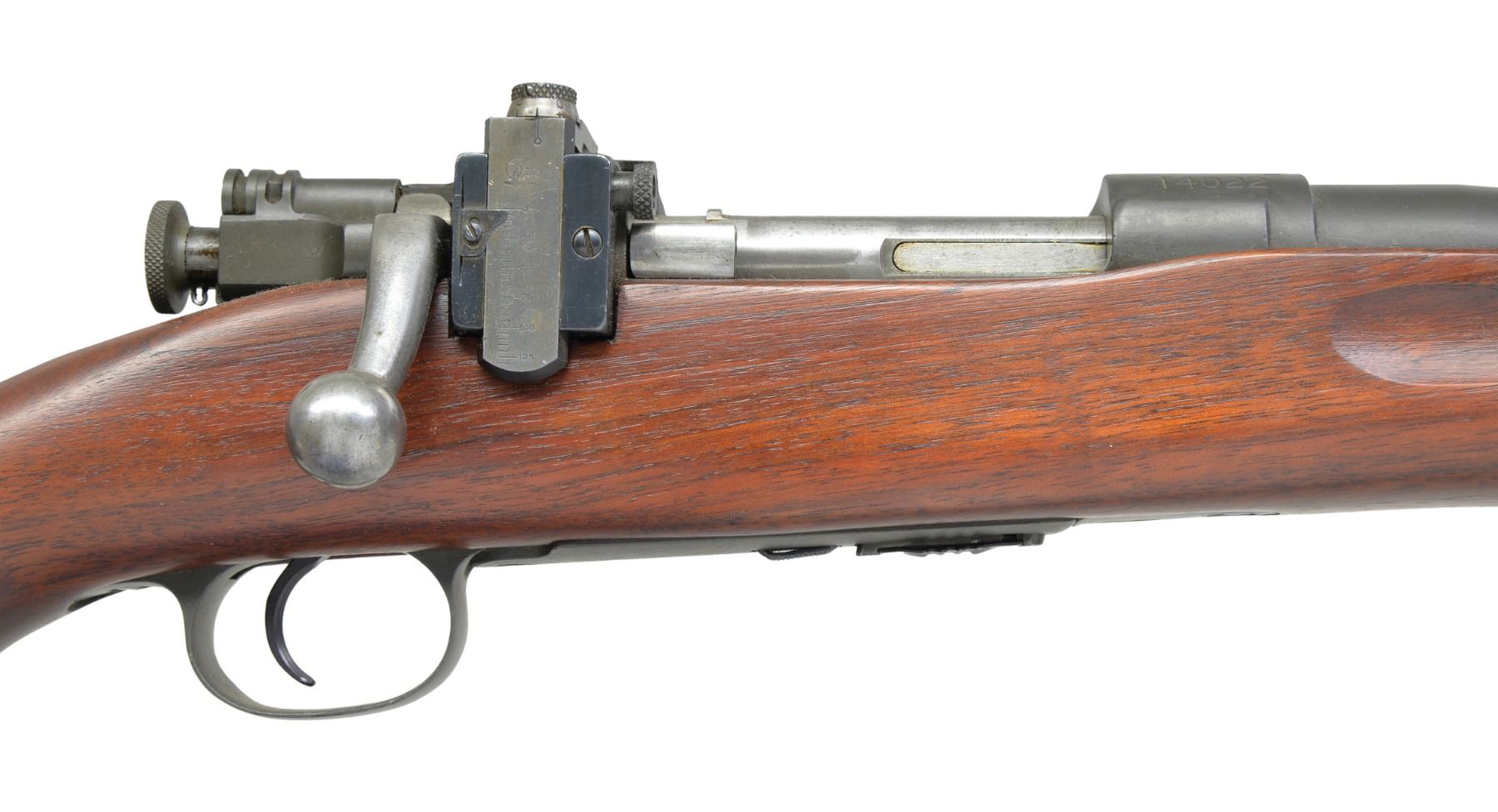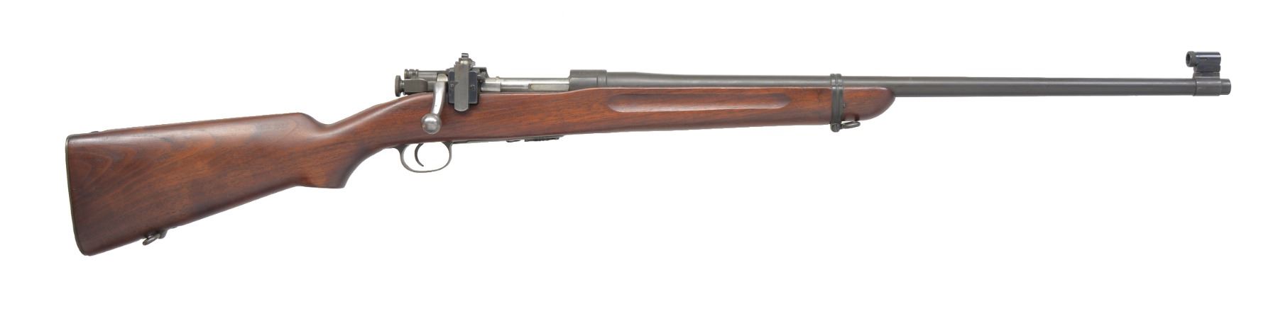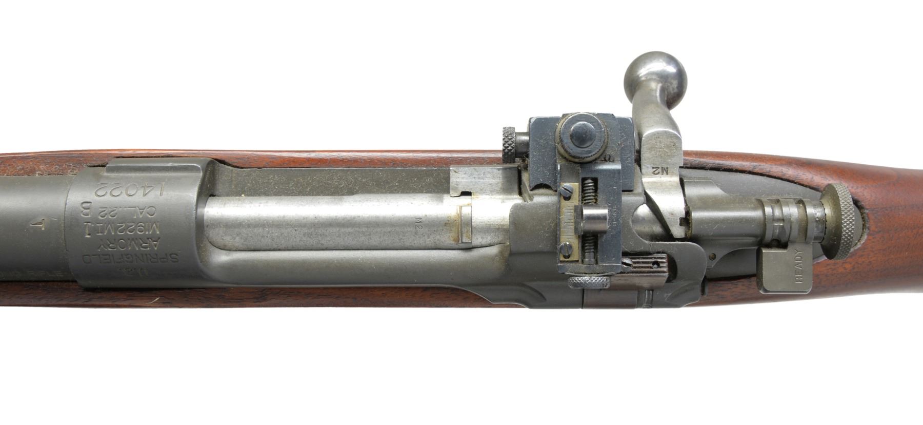 RIFLE. Cal. 22 LR. S# 14022. Bbl. 24" marked "SA" over flaming bomb & 7-27 date. Band mounted Lyman globe front sight w/ Lyman 48C receiver sight. Front receiver ring has original M1922MI marking w/ added "1 / B" marking. M2 service style stock w/ finger grooves & 03 type checkered buttplate w/out trap. Left side of butt has "S.A. / R." rearsenal mark. MAGS: 1 detachable 5 rd. marked "M2". CONDITION: over 95% reparkerized metal finish. Stock shows a few sm. marks. Bore is bright w/ sound rifling. (19-5454/DS). CURIO. $700-1,000.