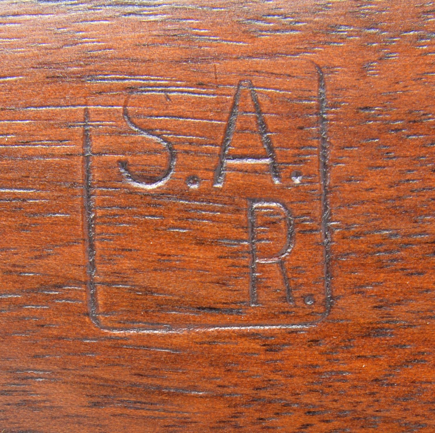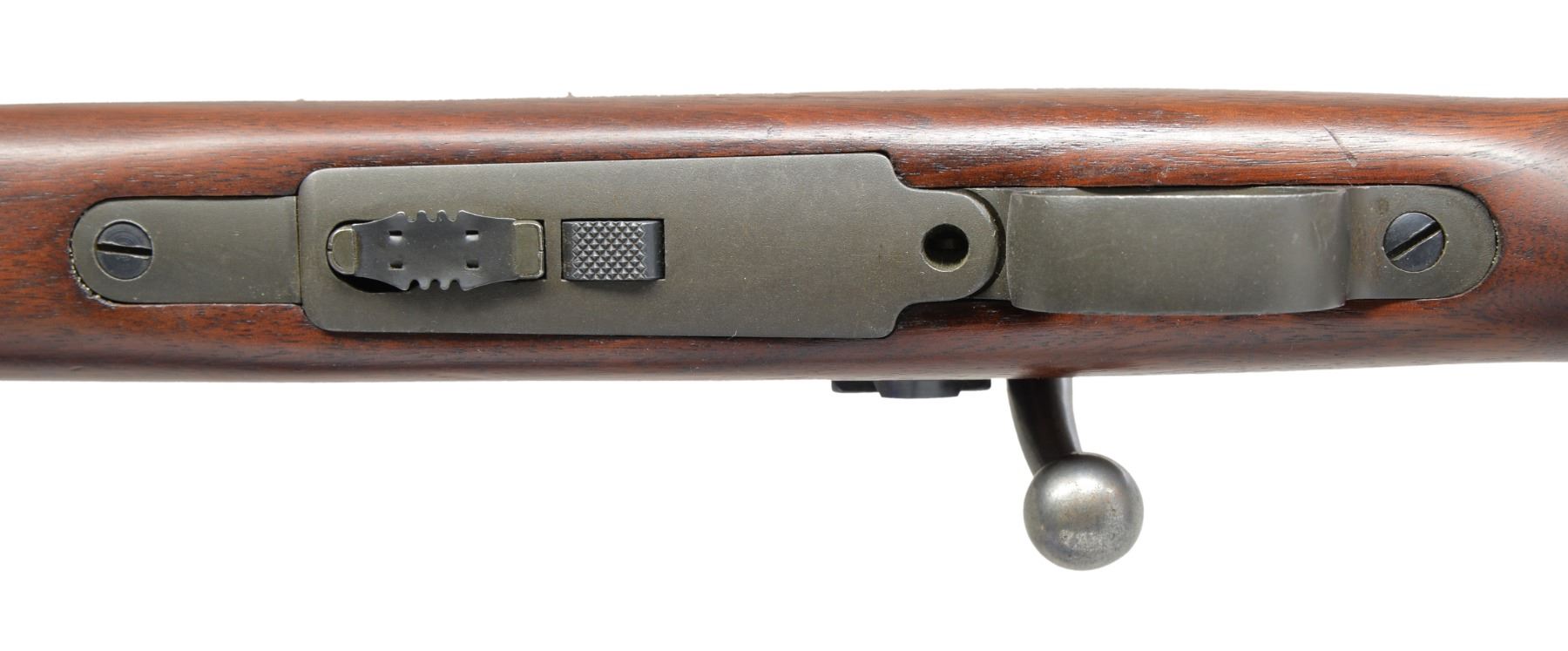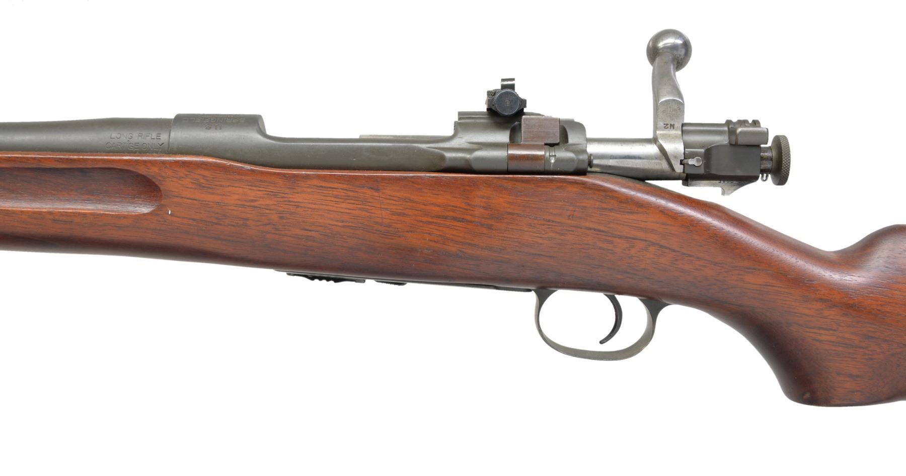 RIFLE. Cal. 22 LR. S# 14022. Bbl. 24" marked "SA" over flaming bomb & 7-27 date. Band mounted Lyman globe front sight w/ Lyman 48C receiver sight. Front receiver ring has original M1922MI marking w/ added "1 / B" marking. M2 service style stock w/ finger grooves & 03 type checkered buttplate w/out trap. Left side of butt has "S.A. / R." rearsenal mark. MAGS: 1 detachable 5 rd. marked "M2". CONDITION: over 95% reparkerized metal finish. Stock shows a few sm. marks. Bore is bright w/ sound rifling. (19-5454/DS). CURIO. $700-1,000.
