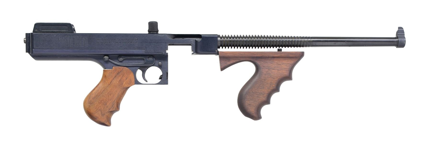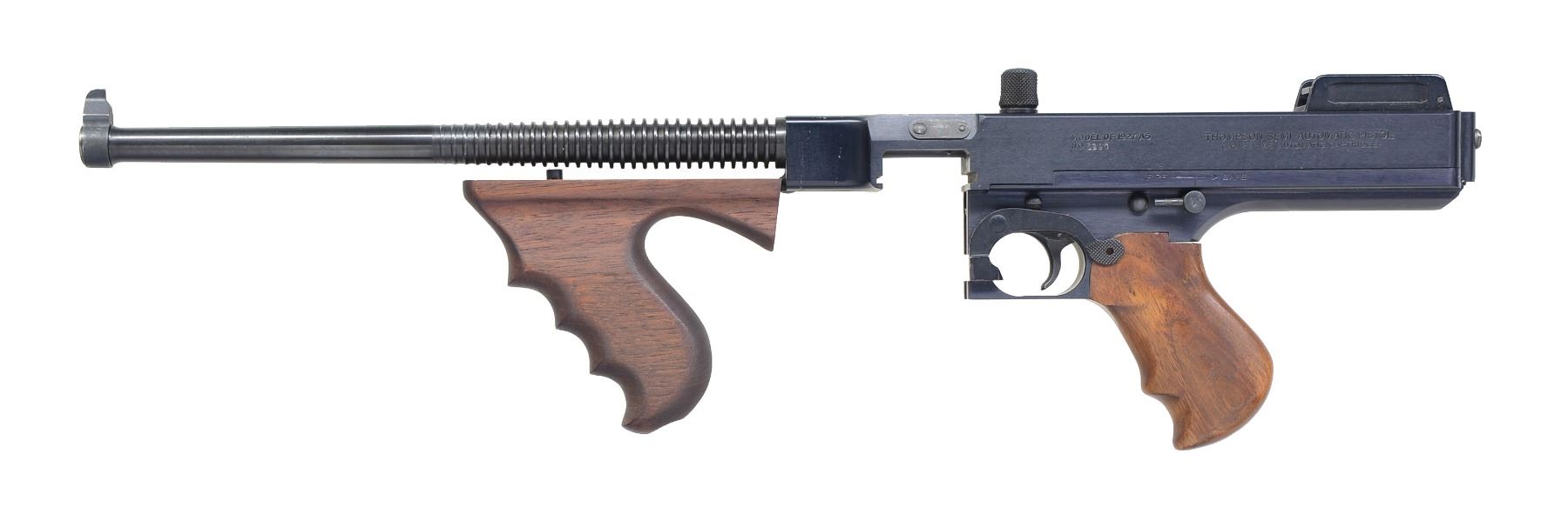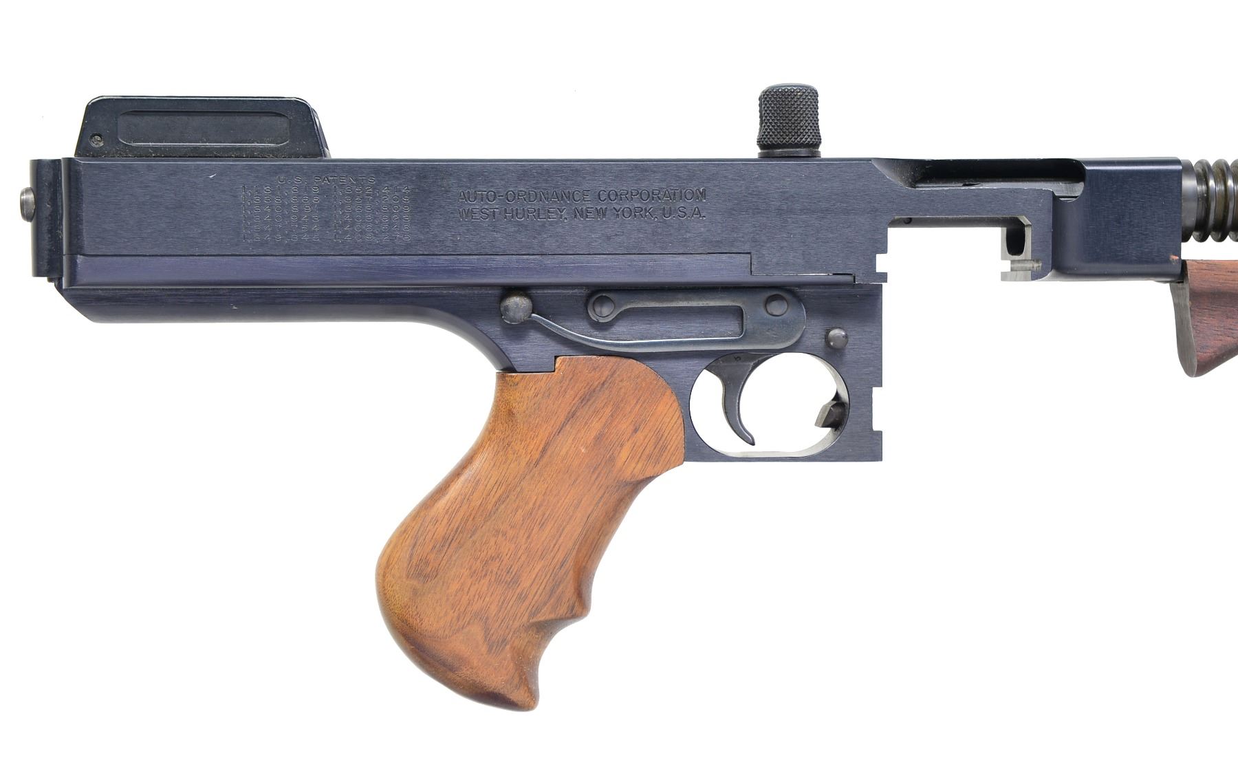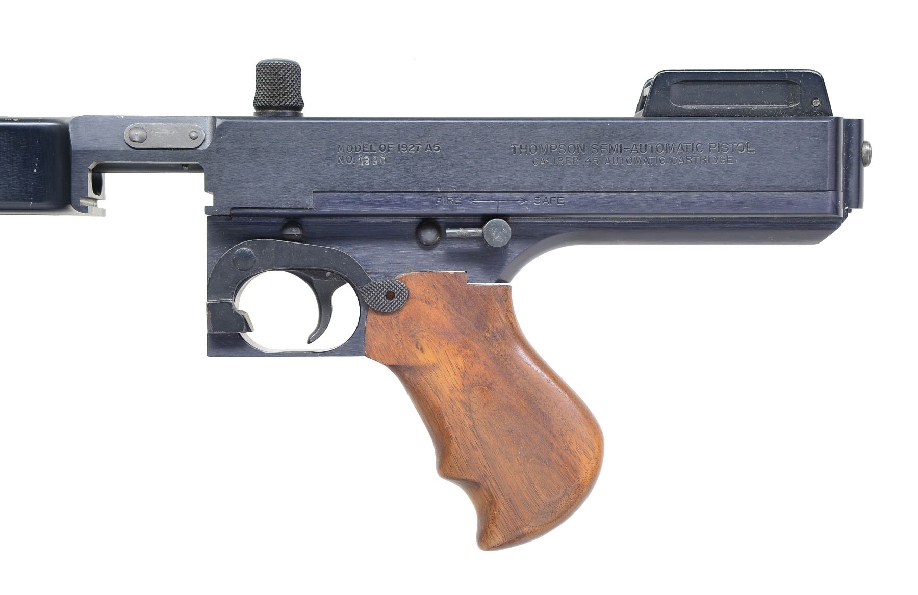 Cal. 45 ACP. S# 1390. Bbl. 13 1/2" ribbed (30 ribs). Blued finish w/ hardwood furniture. This is a pistol version of the Semi-auto 1927 Thompson that is manufactured w/out a stock to meet pistol criteria. It has blade front & ladder rear sights, dual vertical fore grips. The 1927, like the 1928 has the ability to accept both drum & stick mags. Knurled & slotted reciprocating top cocking handle. MAGS: none. UNATTACHED ACCESSORIES: factory cardboard box. CONDITION: both wood grips as well as all exposed metal surfaces are near excellent w/ the exception of a few sm. spots on the receiver around the mag. ejection port that have finish dings. Shiny bore w/ well pronounced rifling. Fire control mechanism appears to function correctly when cycled by hand. (19-5886/JZ). MODERN. $800-1,200.