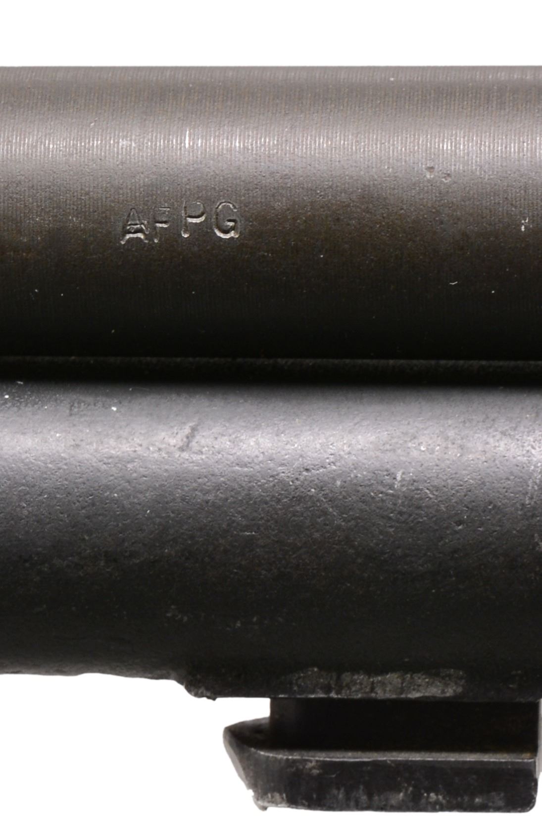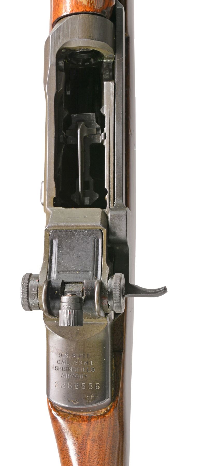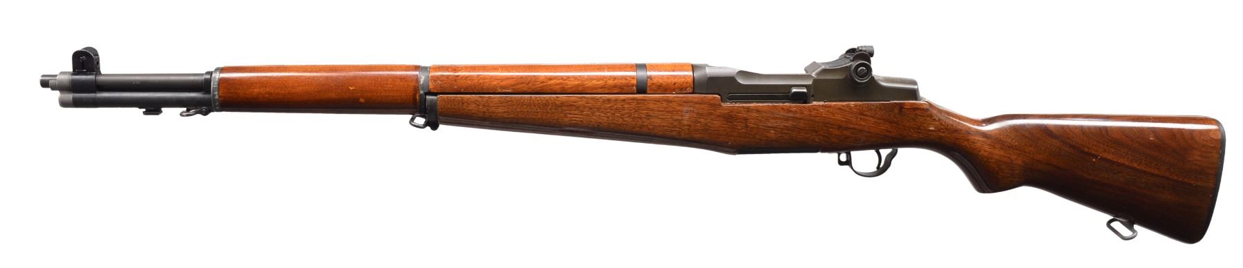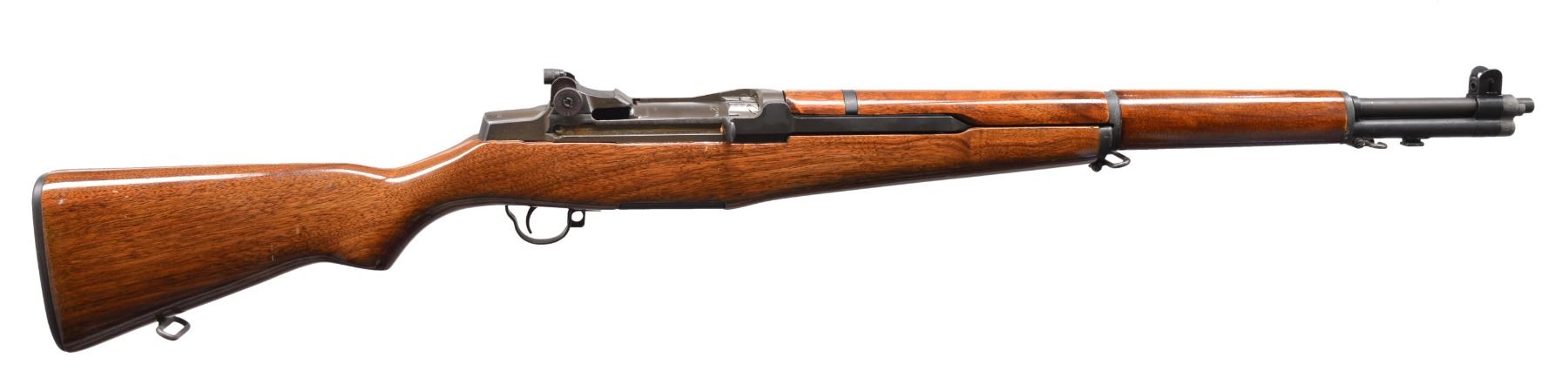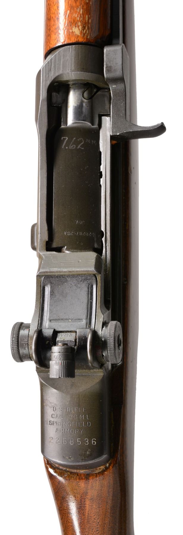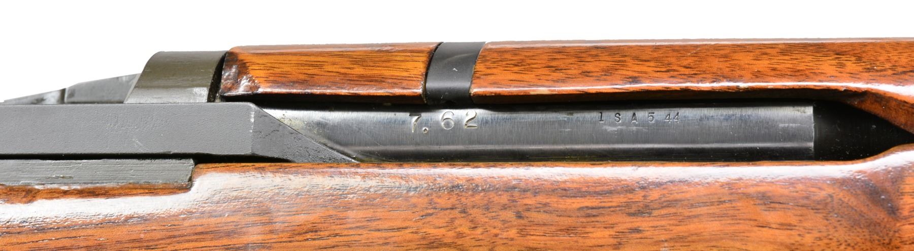 Cal. 7.62 NATO. S# 2268536. Bbl. 24". Selected M1 Garand rifles were converted to match rifles by Air Force Armorers at the USAF Competitive Weapons Shop at Lackland Air Force Base. Consignor states only 15 mfg. in this configuration, making this rifle extremely scarce. Barrel is marked on left side between front sight and front handguard "AFPG" indicating Air Force Premium Grade. Bolt is marked "SA" and additionally electro penciled "7.62MM". Forward end of bolt has been highly polished. Chamber has bushing to convert to shorter NATO cartridge. Barrel has been highly polished when viewed through operating rod slot and is marked "1 SA 5 44" and additionally stamped "7.62" w/out "M" s. Action does not have block for the shorter cartridge. Flush nut rear sight with correct conversion to 1/2 inch windage adjustments. Receiver sight ear polished bright around windage knob. Has National Match marked adjustable aperture rear sight. Front sight assembly number "NM062". Gas cylinder lock marked on right side "M". Single slot gas cylinder lock screw. Stamped trigger guard. Trigger housing and hammer marked "SA". Operating rod marked "SA". Walnut buttstock and rear handguard. Front handguard appears to be hardwood replacement. Stock set is marked with faint boxed eagle Defense acceptance stamp on left side below receiver and encircled "P" proof at bottom of pistol grip. Stock set has added gloss finish. Buttstock marked forward end of right side barrel channel "7 67" and stamped "8536" on left side. Marked in pencil in bottom of barrel channel "6950" and stamped with "2". CONDITION: stock set has light wear and scattered handling marks throughout with areas of small flakes of missing finish notable on rear handguard. Metal has 80% original parkerized finish with light high point wear. Gas cylinder retains most original finish, but area of bayonet lug has missing finish with small dents at bottom. Bayonet lug is also penned slightly at front. Gas cylinder lock has gray coloration. Very good shiny bore w/ sharp lands. (20-12/RW). CURIO. $3,000-5,000