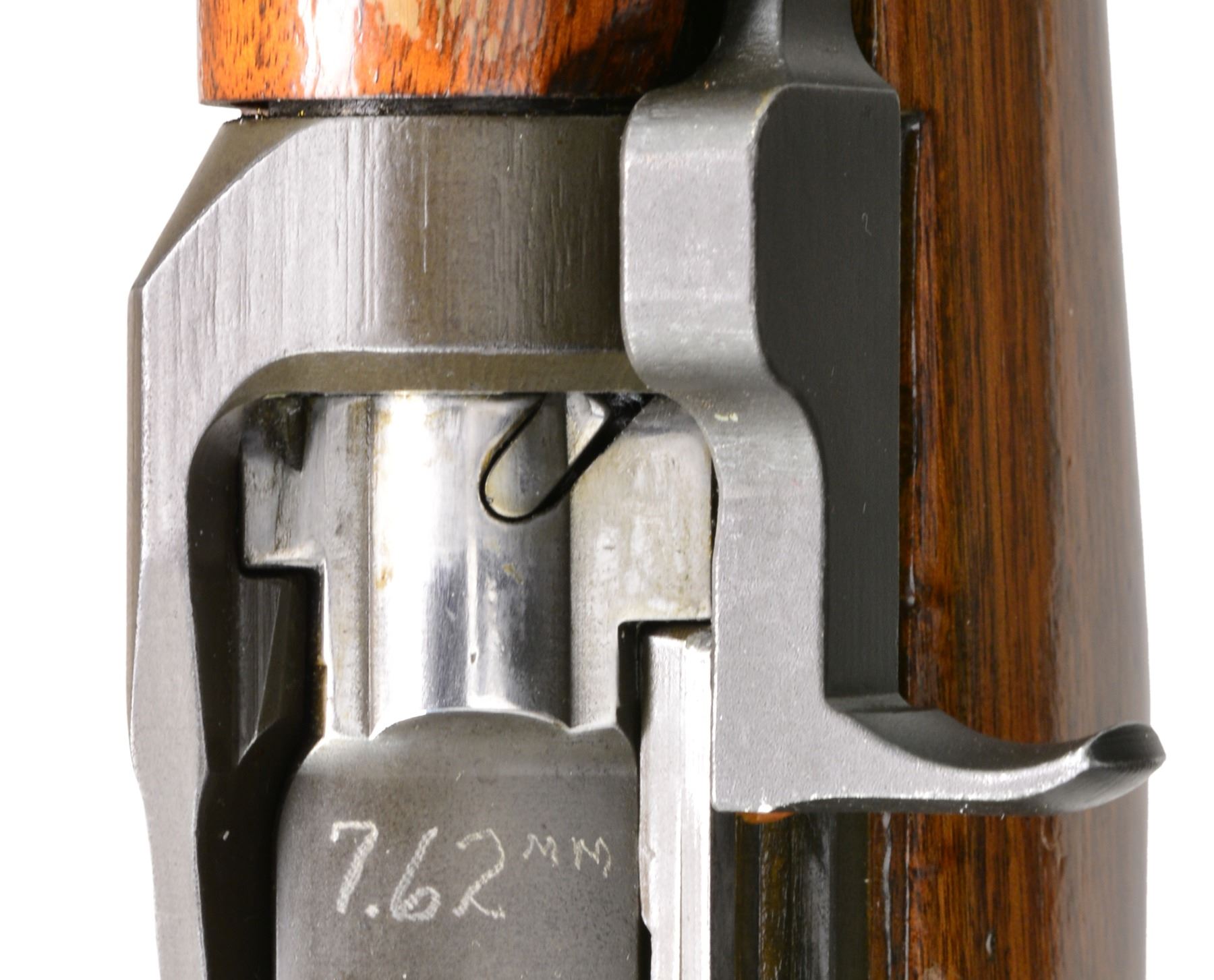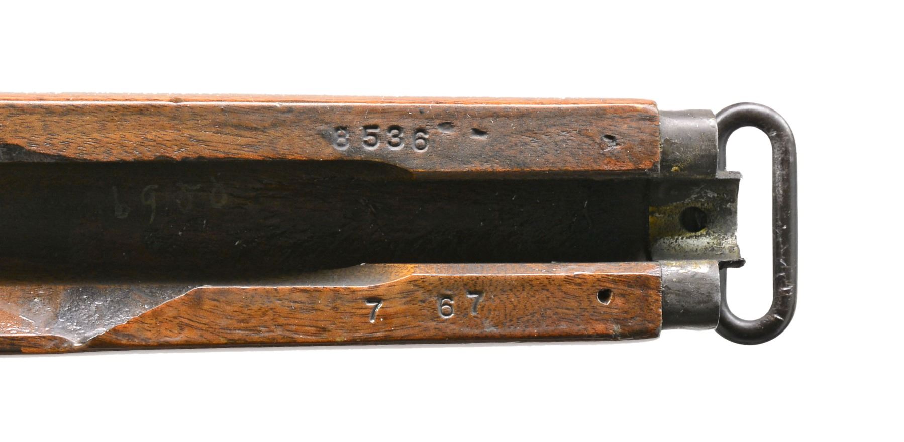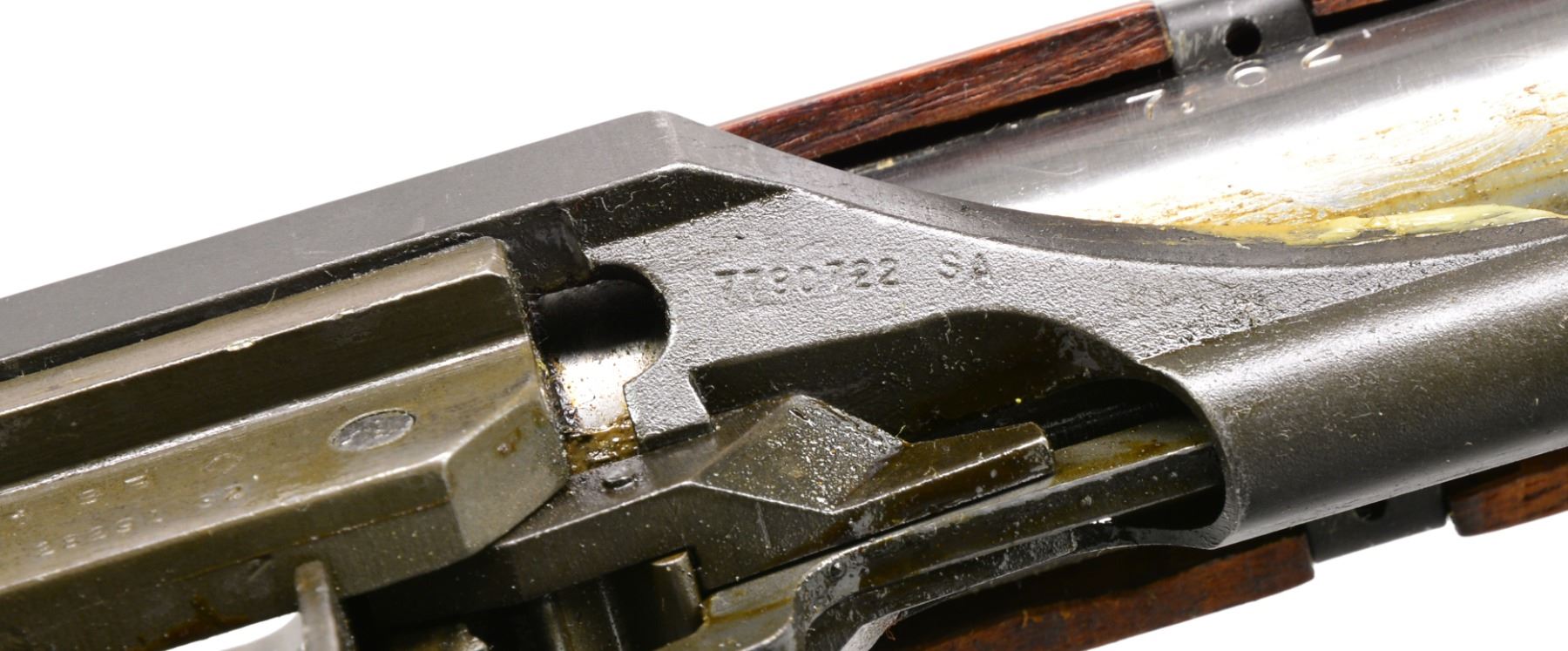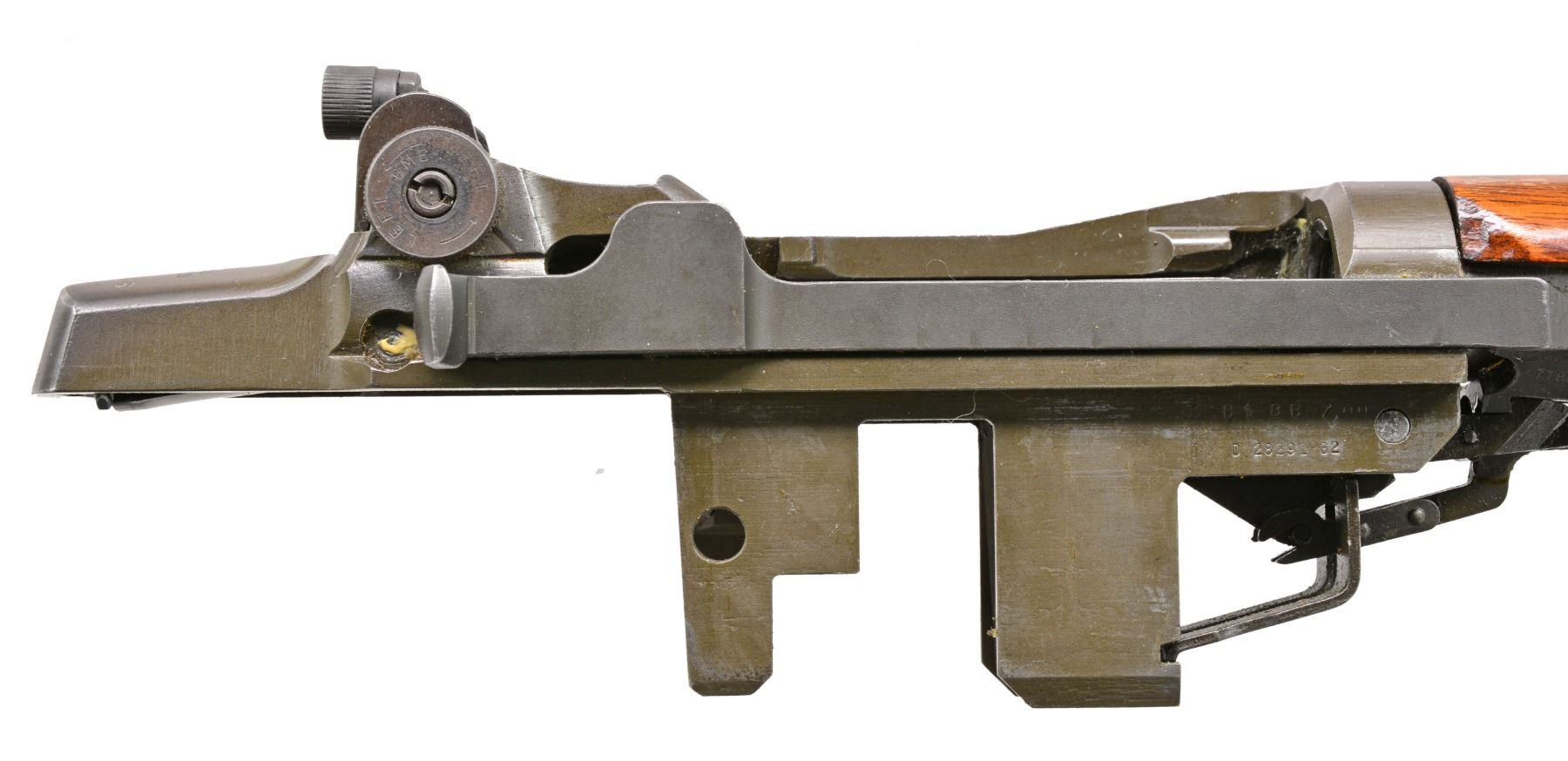 Cal. 7.62 NATO. S# 2268536. Bbl. 24". Selected M1 Garand rifles were converted to match rifles by Air Force Armorers at the USAF Competitive Weapons Shop at Lackland Air Force Base. Consignor states only 15 mfg. in this configuration, making this rifle extremely scarce. Barrel is marked on left side between front sight and front handguard "AFPG" indicating Air Force Premium Grade. Bolt is marked "SA" and additionally electro penciled "7.62MM". Forward end of bolt has been highly polished. Chamber has bushing to convert to shorter NATO cartridge. Barrel has been highly polished when viewed through operating rod slot and is marked "1 SA 5 44" and additionally stamped "7.62" w/out "M" s. Action does not have block for the shorter cartridge. Flush nut rear sight with correct conversion to 1/2 inch windage adjustments. Receiver sight ear polished bright around windage knob. Has National Match marked adjustable aperture rear sight. Front sight assembly number "NM062". Gas cylinder lock marked on right side "M". Single slot gas cylinder lock screw. Stamped trigger guard. Trigger housing and hammer marked "SA". Operating rod marked "SA". Walnut buttstock and rear handguard. Front handguard appears to be hardwood replacement. Stock set is marked with faint boxed eagle Defense acceptance stamp on left side below receiver and encircled "P" proof at bottom of pistol grip. Stock set has added gloss finish. Buttstock marked forward end of right side barrel channel "7 67" and stamped "8536" on left side. Marked in pencil in bottom of barrel channel "6950" and stamped with "2". CONDITION: stock set has light wear and scattered handling marks throughout with areas of small flakes of missing finish notable on rear handguard. Metal has 80% original parkerized finish with light high point wear. Gas cylinder retains most original finish, but area of bayonet lug has missing finish with small dents at bottom. Bayonet lug is also penned slightly at front. Gas cylinder lock has gray coloration. Very good shiny bore w/ sharp lands. (20-12/RW). CURIO. $3,000-5,000