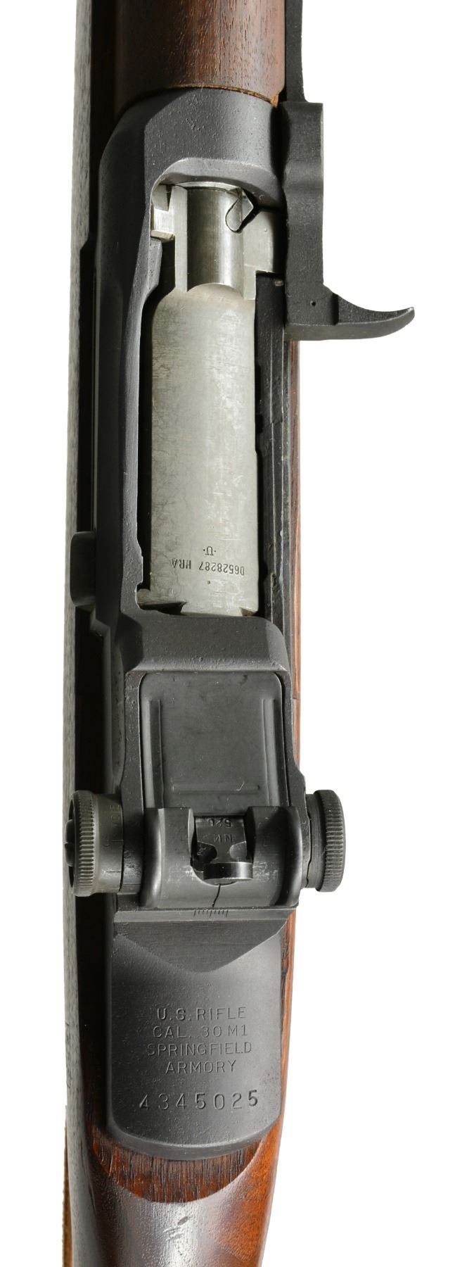 RIFLE. Cal. 30-06. S# 4345025. Bbl. 24" marked "LMR 3-53" & marked on left side "NM". Throat gauges 1.0 & muzzle gauges 1.0. Bolt is marked "HRA". Flush nut rear sight. Fixed aperture marked "NM" & "520". Blade front sight marked "NM 062". High hump gas cyl. lock. Cross slot gas cyl. lock screw. Trigger group w/ stamped trigger guard marked "SA". Operating marked "W.R.A.". Receiver marked inside left rail "36873" in electro pencil. Walnut stock set w/ original finish. Buttstock w/ crisp markings: left side over trigger guard has boxed Defense Acceptance stamp & under grip w/ circle "P". Has "MRT" military type leather sling. CONDITION: stock has scattered light handling marks throughout w/ original finish. Notable scratches on bottom left at end of pistol grip & belly of stock. Metal w/ arsenal rework type dark parkerized finish over scattered fine pitting has light wear & scattered handling marks. Bolt has notable greenish shade. Near excellent shiny bore. (20-574/RW). CURIO. $3,000-4,000.