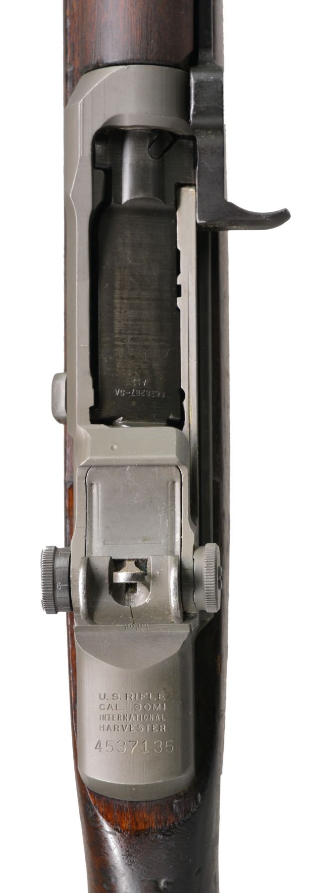 AUTO RIFLE. Cal. 7.62 NATO. S# 4537135. Bbl. 24" marked on right side "LMR D653544? 1 55 A39 P?", & Defense acceptance stamp. Has been overstamped in white enhanced markings "7.62 NATO M11". Internet research indicates this rifle may have been converted in or for Pakistan, although no import marks appear on the rifle. Additionally markings do not appear correct for US Navy conversions. Chamber has bushing to adapt rifle to 7.62 NATO cartridge, also shows coarse reamer marks. Rifle has white plastic spacer in forward end of mag.-well. Flush nut aperture rear sight. Blade front sight w/ protective ears. High hump gas cyl. lock & cross slot gas cyl. lock screw. All visible markings except bolt are "IHC". Stamped trigger guard. Walnut stock set. Stock is marked on left side w/ boxed Defense acceptance stamp & "P" under pistol grip. Stock bedding has not been modified. CONDITION: buttstock has notably more wear, dents, scratches & staining than handguards, but all have original finish. Metal has 75% original parkerized finish w/ light wear & scattered scratches. Very good shiny bore. (20-10/RW). CURIO. $900-1,200.