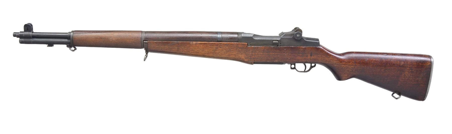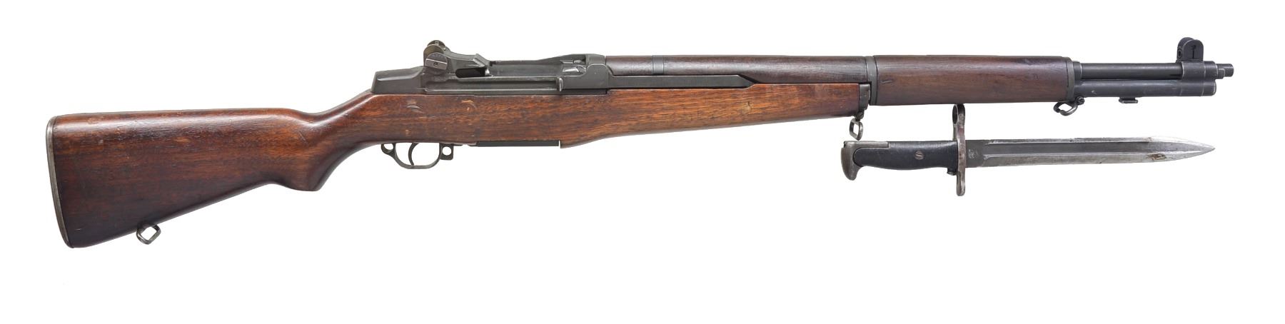 Cal. 30-06. S# 984080. Bbl. 24" marked on right side "SA 11-42". Throat gauges 3.0 & muzzle gauges 2.5. All visible parts markings are "SA". Locking bar & battle range aperture rear sight. Blade front sight w/ protective ears. Cross slot gas cyl. lock screw. Milled trigger guard. All visible markings are "SA". Walnut stock set. Buttstock is marked on left side below receiver w/ faint boxed Defense acceptance stamp. Marked under pistol grip w/ encircled "P" & has vintage taped "184" rack # on end of pistol grip. UNATTACHED ACCESSORIES: 9 3/4" fullered blade bayonet marked "U.F.H US flaming bomb 1942". Bayonet was cut down to this length for use w/ M1 Garand rifles. Grooved composite grips. Scabbard is not present. Bayonet retains little original finish has patina, dents & scratches. CONDITION: stock set has well worn original finish w/ moderate wear, dents & scratches throughout. Front handguard has extensive full length cracks on top left. Metal retains 75% of dark arsenal type reparkerizing w/ thinning & wear. Good shiny bore w/ lightly worn lands. (19-5829/RW). CURIO. $800-1,200.