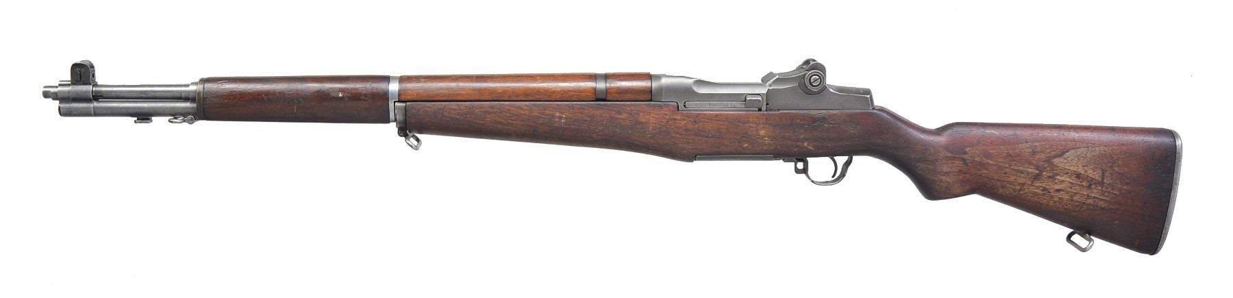 Cal. 30-06. S# 4667147. Bbl. 24" marked on right side "HRA 4-53". Throat gauges 3.5 & muzzle gauges 1.5. Bolt operating rod, trigger housing & hammer are all marked "SA". Safety is marked "IHC". Stamped trigger guard. Flush nut aperture rear sight. Blade front sight. High hump gas cyl. lock & cross slot gas cyl. lock screw. Walnut stock set. Buttstock has faint boxed Defense acceptance stamp on left side & encircled "P" under pistol grip. UNATTACHED ACCESSORIES: retains arsenal hang tag. CONDITION: stock set has wear, staining, dents & scratches. Buttstock has been lightly cleaned on left side in cheek area. Front handguard has sm. crack on right rear & left front. Metal has well worn thinning original finish. Good shiny bore w/ light wear to lands. (19-5908/RW). CURIO. $600-1,000.