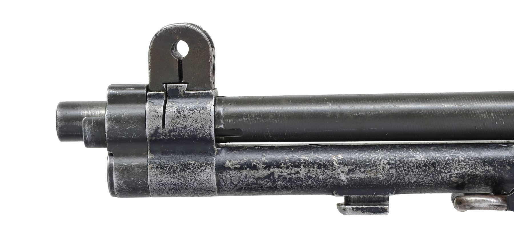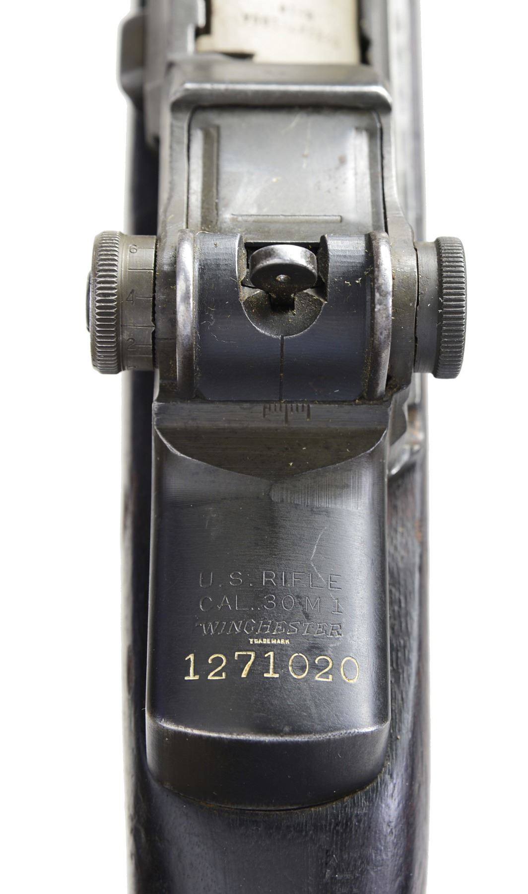 Cal. 30-06. S# 1271020. Bbl. 24". Throat gauges 3.0 & muzzle gauges 1.5. Bbl. has "WP" in oval proof visible in slide cut. Gas. cyl. is marked "W" on bottom of bayonet lug. Balance of parts are marked "SA" including trigger housing w/ stamped trigger guard. Flush nut aperture rear sight. Blade front sight w/ protective ears. High hump gas cyl. lock w/ cross slot gas cyl. lock screws. Walnut stock set including trap buttplate marked around pistol grip w/ 2 boxed "P" & 1 circle "P". UNATTACHED ACCESSORIES: cardboard shipping box & arsenal hang tag. CONDITION: stock set has extensive wear, staining, & dents throughout. Metal has 60% worn thinning original finish. Gas cyl. has notably thin blue/black finish. Good bore w/ strong lands turning slightly dark in grooves. (19-5909/RW). CURIO. $600-1,000.