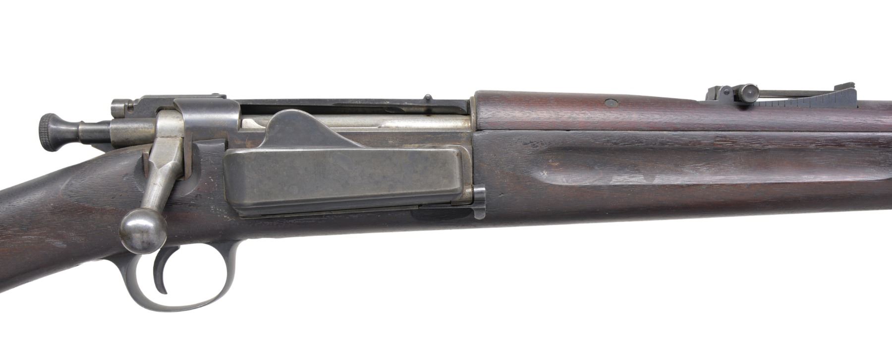 Cal. 30-40 Krag. S# 60894. Bbl. 30". Pinned blade front sight w/ Model 1896 rear sight. Walnut stock w/ finger grooves & handguard that extends over the front receiver ring. CONDITION: 70% dull fading blue. Refinished stock has dark appearance. Bore has slightly darkened appearance w/ worn rifling. (01-17004/DS). ANTIQUE. $500-750.