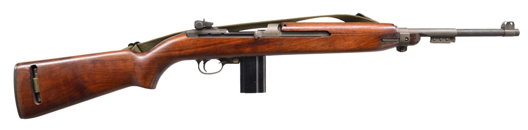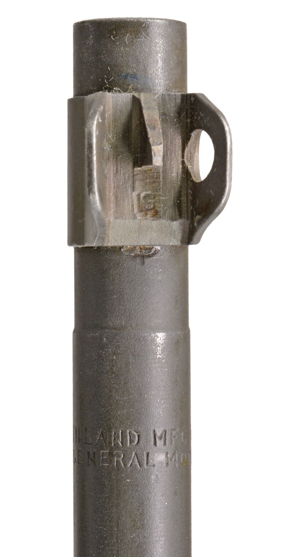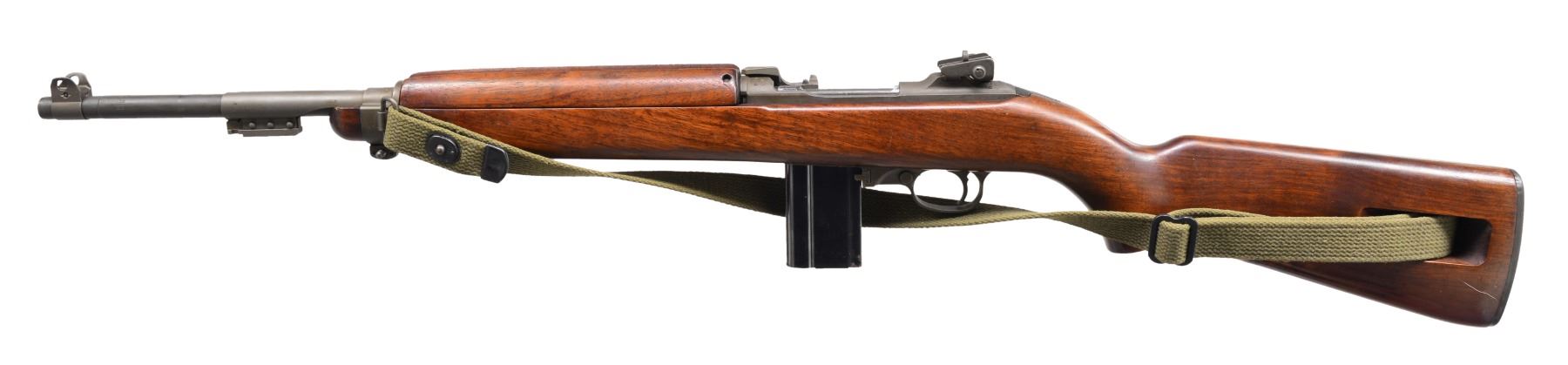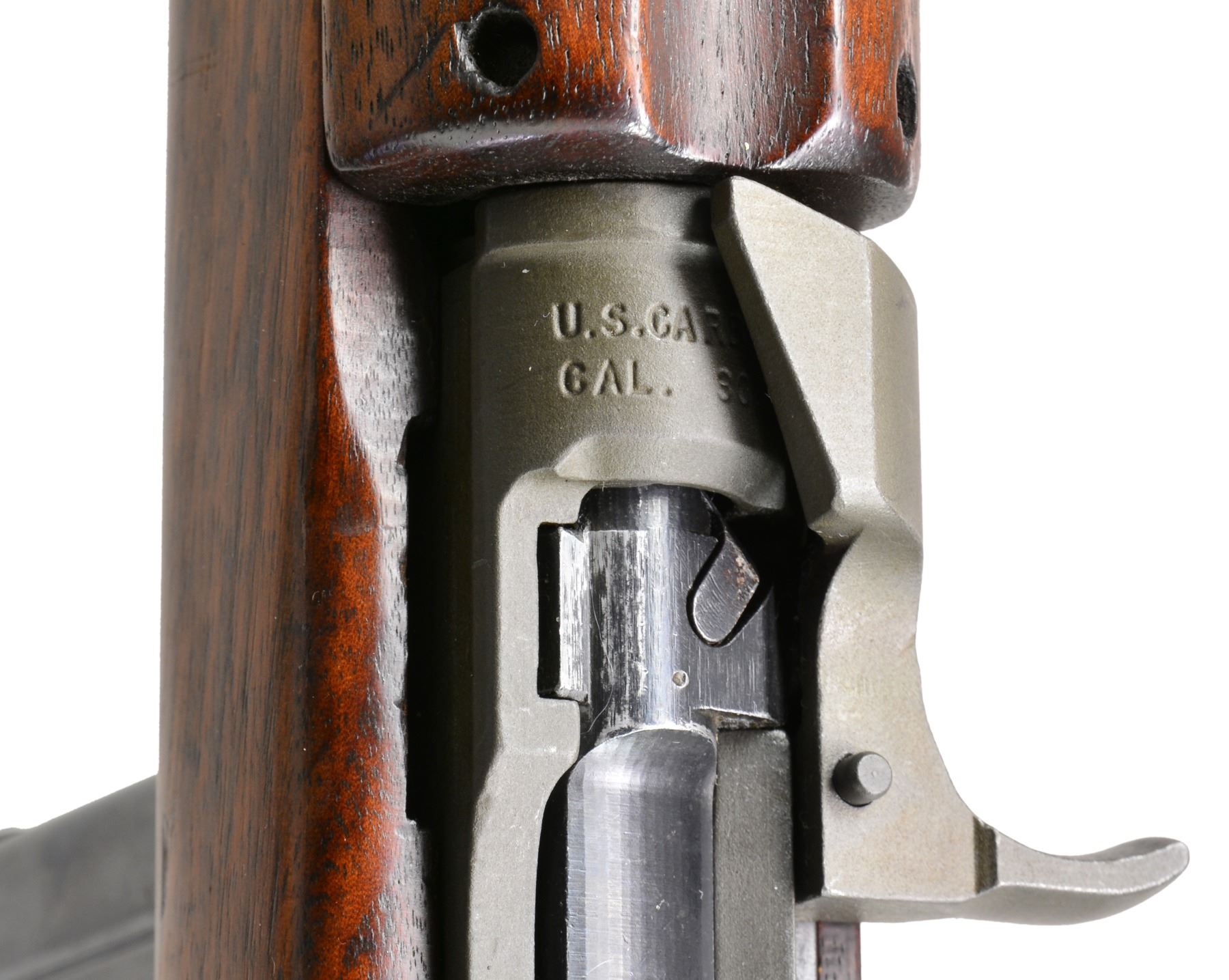 Cal. 30 Carb. S# 6307605. Bbl. 18" marked behind front sight "INLAND MFG. DIV. GENERAL MOTORS", not dated. Stamped adj. rear sight marked "L.I.R. CO.". Blade front sight w/ protective ears marked "LS". Bbl. band & bayonet lug marked "J.M.Q.". Flat bolt marked "IO". 6 O'Clock slide marked "IO" & "Z". Milled trigger guard marked "INLAND". Rotary safety. Mag. catch has 30 rd. mag. extension. Straight cut hammer marked "W" (?). Walnut stock set. Low wood buttstock w/ faint "IO" in sling slot. 2 Rivet handguard marked "HI". MAGS: 1-15 rd. CONDITION: stock set has arsenal rework finish w/ light wear, dents & scratches. Very good shiny bore. (19-5633/RW). CURIO. $600-900.