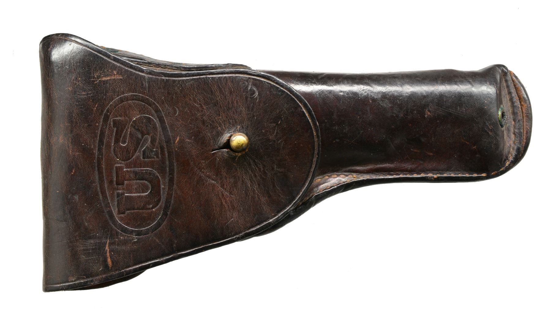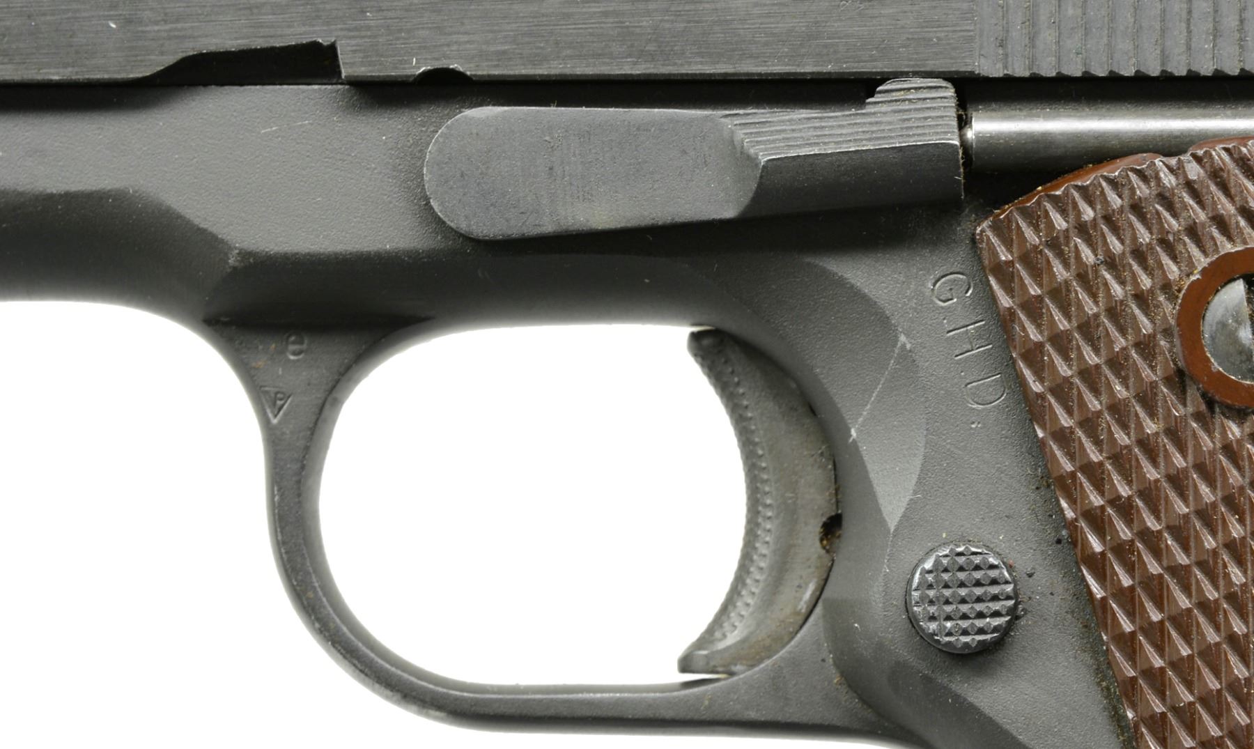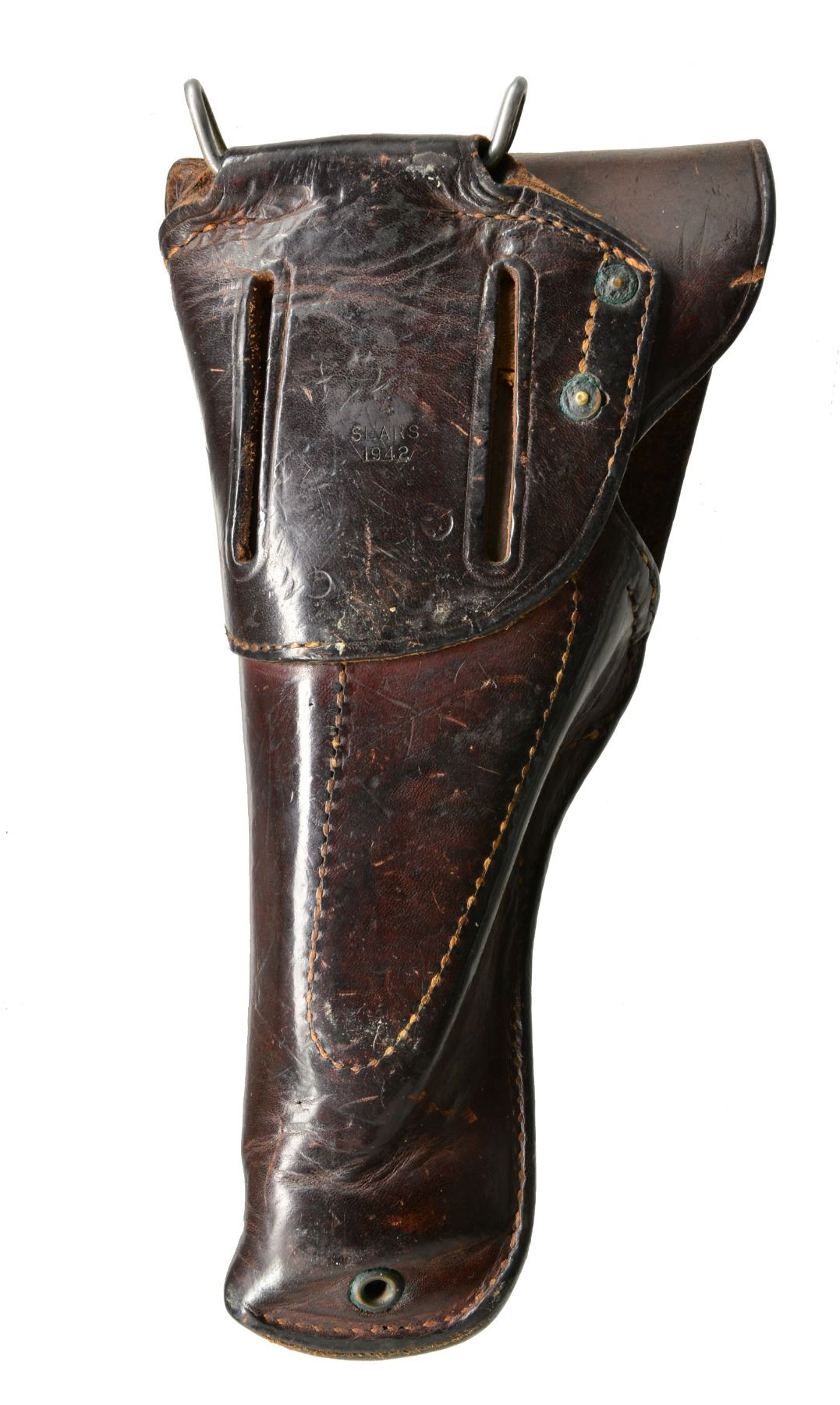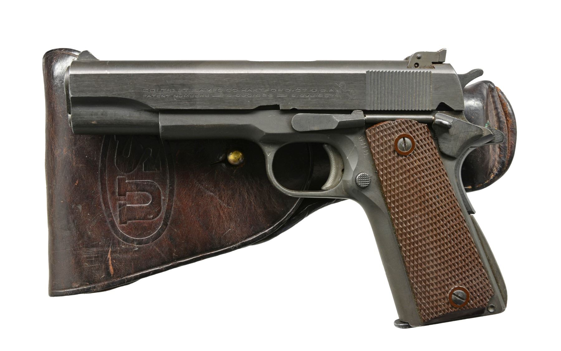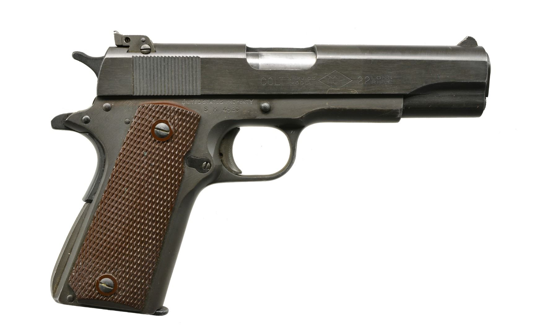 Cal. 22 LR. S# SM4520. Bbl. 5". Mfg. 1945 (1935-1945) as service pistol training aid utilizing floating chamber designed by D.M. "Carbine" Williams to increase 22 LR recoil approximately 4 times to replicate 45 ACP. Coltwood Type 7 ribbed grips w/ large rings. Parkco-Lubrite (parkerized) finish. Type 4 serrated front sight & Stevens adj. rear. 7 Rib arched mainspring housing correctly w/out lanyard loop or provision for same. Correct checkered hammer & safety tab w/out milling undercut. Slide stop serrated; correct would be checkered. "G.H.D." proofed. Left front of trigger guard has "e" over VP proof; opposite side has "77". Uncommonly Marked "UNITED STATES PROPERTY" above S#. MAGS: 1 good 10 rd. w/ correct aluminum follower & Ace Service Model marked pinned base. Sm. spots of light oxidation on right side near spine. 1" area of heavy oxidation on left side on bottom half near spine. UNATTACHED ACCESSORIES: good, brown, Sears 1942 dated flap holster w/ US in oval on front. Web belt hooks on back along w/ belt loop having unused appearance. CONDITION: very good overall appearance w/ some very slight high point thinning; most visible on slide near muzzle, trigger guard & butt area. Light scratch on frame through finger recess due to improper slide stop installation. Slight impact marks around front sight; especially face. Two symmetrical rub marks on top of slide just behind front sight & perpendicular to bore. Slide appears original finish, but frame is re-parkerized. Slight wear on tops of grip screws; very good to excellent grips; near excellent bore. (20-310/NW). CURIO. $3,000-5,000.