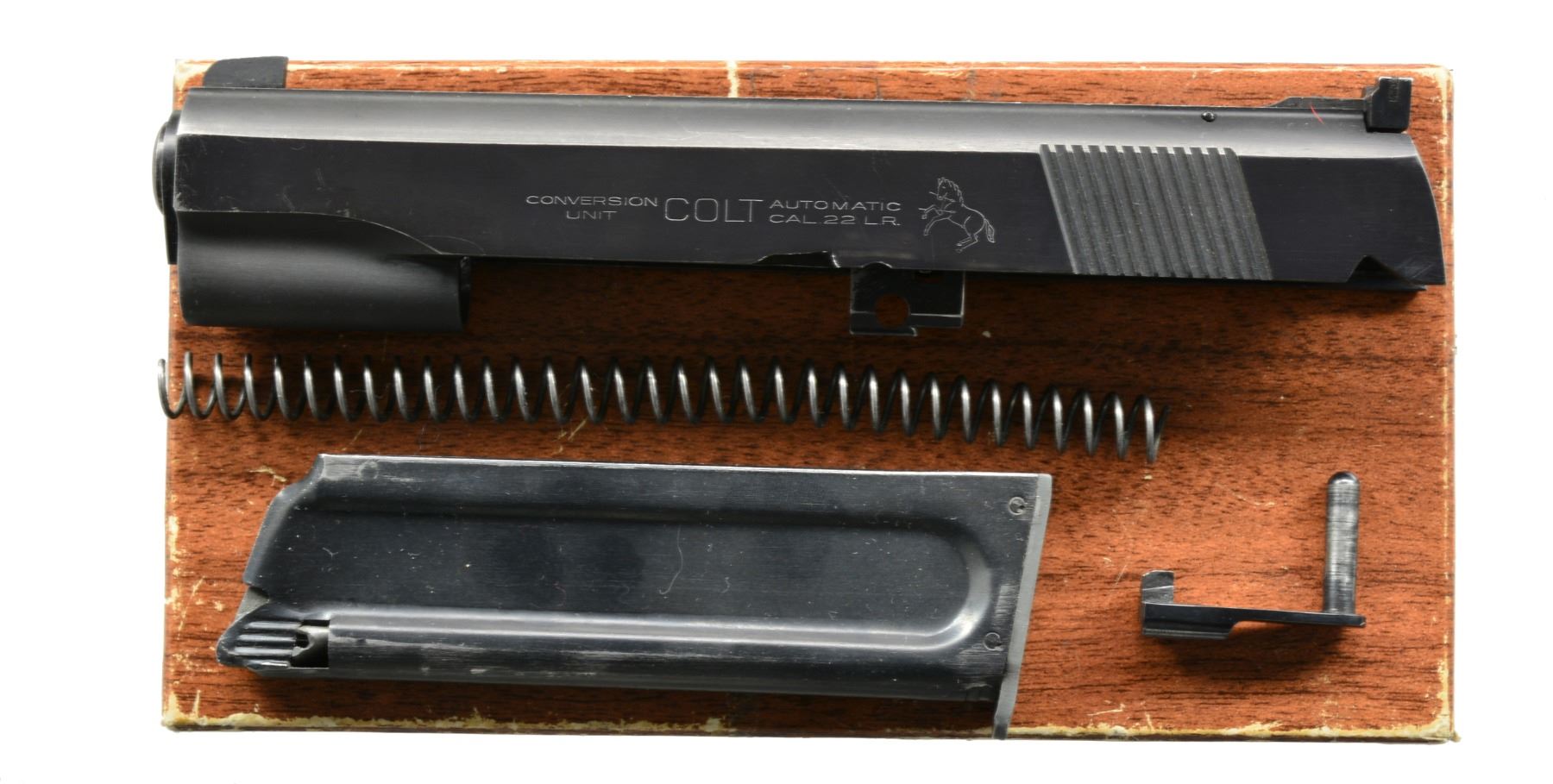 Later style w/ Gold Cup profile having squared slant cut cocking grooves & raised rib (matte w/out grooves). Patridge front sight & Accro rear. Stamped ejector plus standard floating chamber to promote functioning & simulate 45 ACP recoil. Includes bbl. bushing, conversion specific slide stop, recoil spring & early 10 rd. mag. w/ aluminum follower having matte Colt marked pinned base. Contained in fair to good (broken corner & peeled wood grain) original 2 piece wood grained box w/ yellow label, warranty card & 5/67 dated yellow instruction sheet. Conversion unit very good to near excellent (near excellent bore) w/ minimal faint high point & slight use wear. Very good mag. w/ slight use wear at front & on spine; thin base finish. (02-13478/NW). $350-500.
