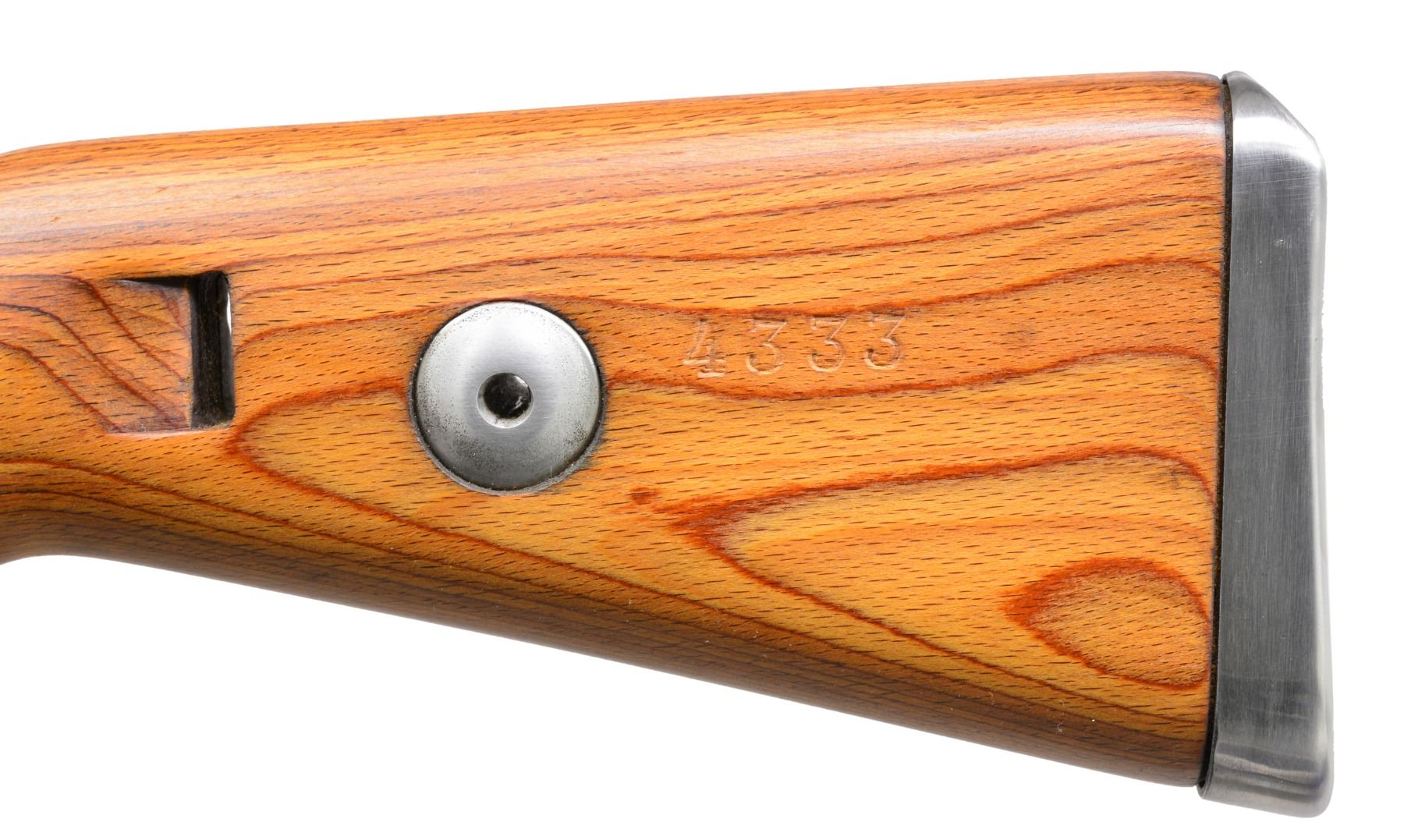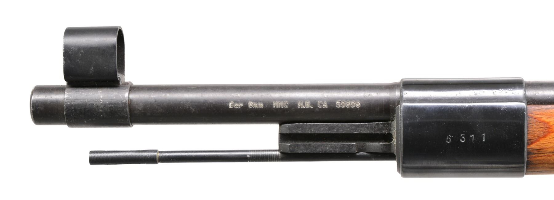 Cal. 8mm Mauser. S# 4333a. Bbl. 24". Receiver has 2 "X" Russian inspection marks. Receiver, bolt body, cocking piece, floorplate, trigger guard & stock have matching numbers. Forearm cap has non matching number "5311". Bbl. band has non matching number "4365". Rear sight has non matching "3234". Breech end of bbl. has number "58542 CYW". Bbl. has MMC import marking on left side near muzzle. Laminated stock & hand guard. CONDITION: refinished rifle w/ metal parts have black coated finish. Sanded & refinished stock has clean fresh appearance. Bore has rough dark appearance retaining intact rifling. (19-5739/DS). CURIO. $400-600.