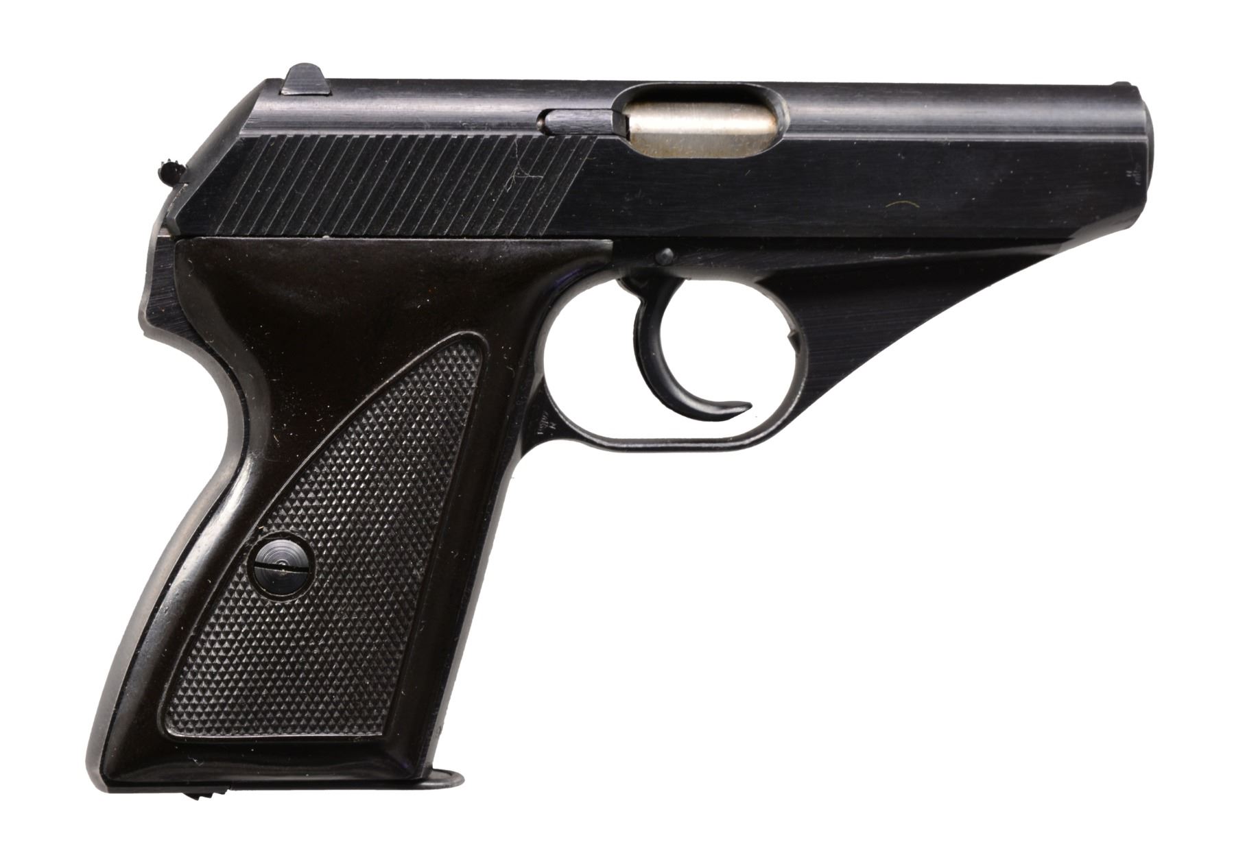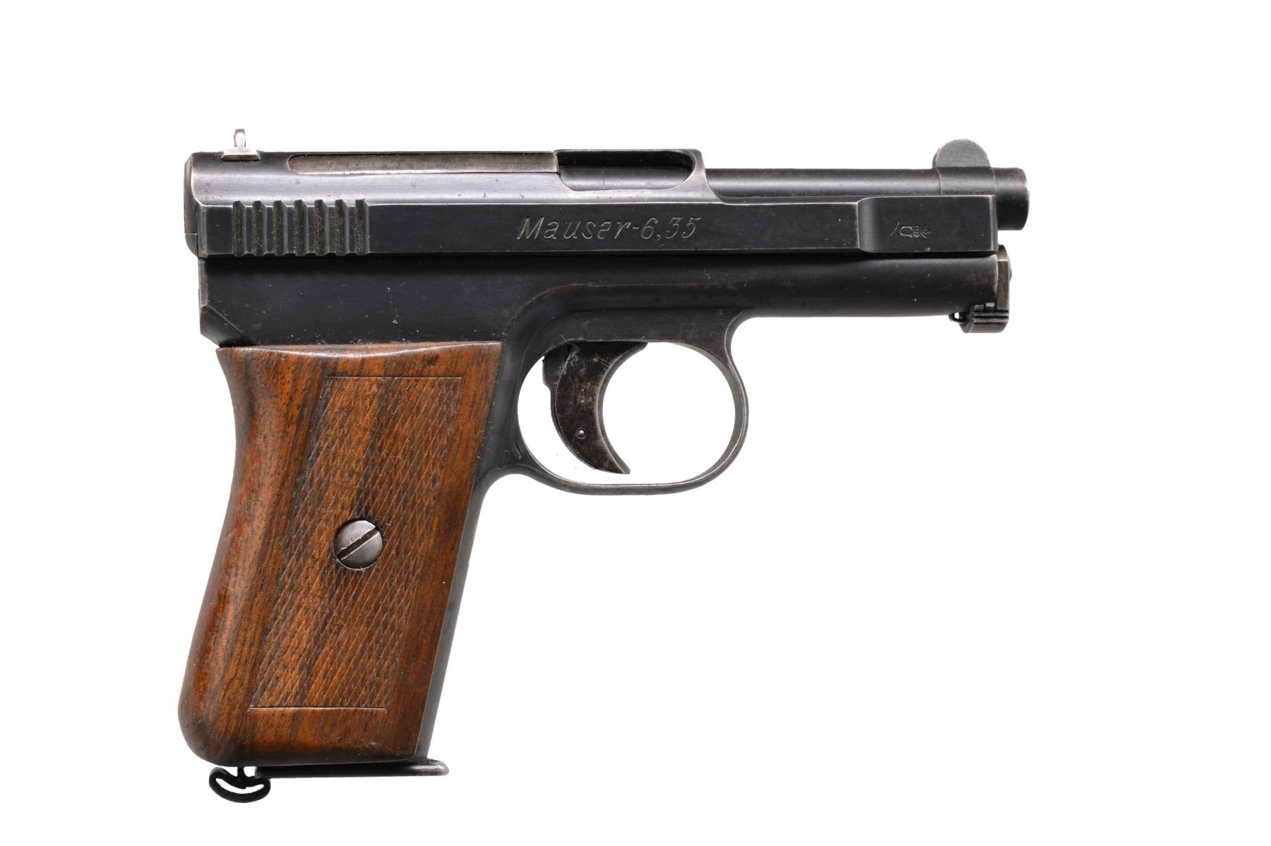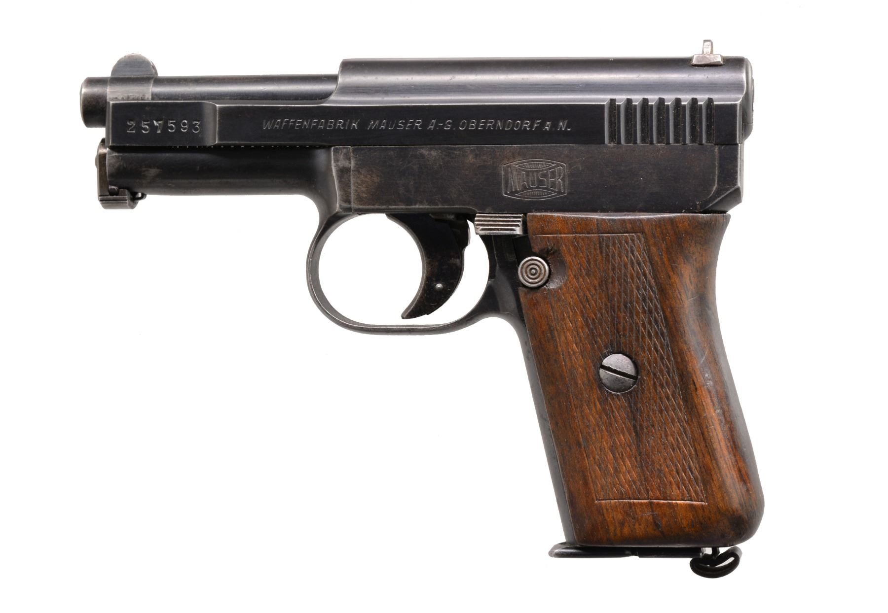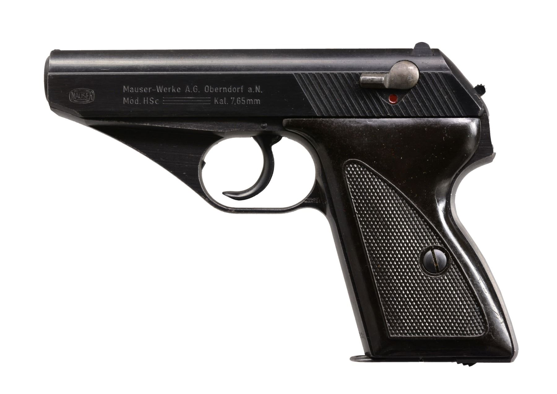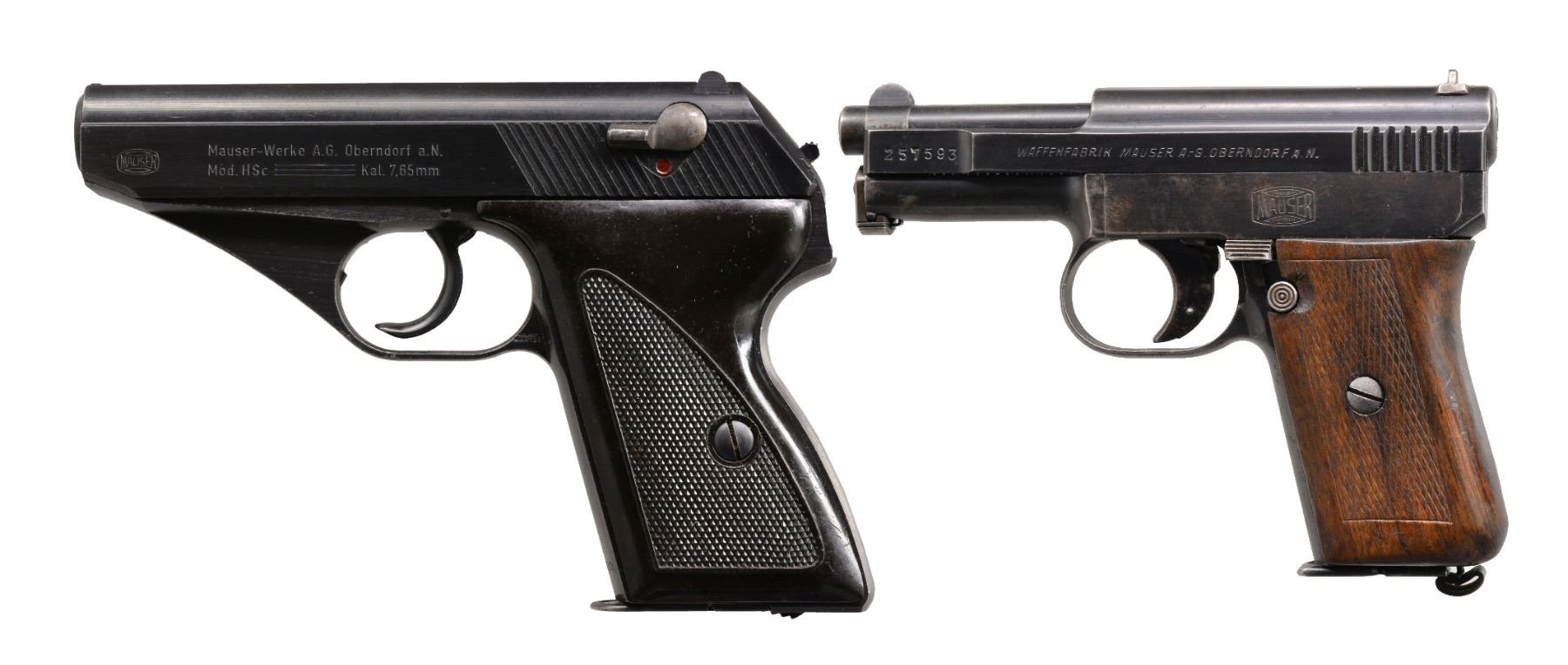 1) MODEL HSc WWII WARTIME GERMAN ARMY MFG. Cal. 7.65mm (32 ACP). S# 949382. Bbl. 3 1/4". Fixed sights. Left side of trigger guard has "WaA 135" proof. Right side of slide at muzzle has eagle "N" proof. Wartime blue finish. 2 Piece checkered brown plastic grips. MAGS: 1 detachable 8 rd. CONDITION: 95% lightly worn blue showing slight edge wear. Grips show light wear. Bore is bright w/ sound rifling. (20-159/DS). 2) MODEL 1910. Cal. 6.35mm (25 ACP). S# 257593. Bbl. 3". Semi circular front sight w/ fixed V notch rear sight. Blue finish w/ fire blue trigger. 1 Piece checkered walnut grip. MAGS: 1 detachable 9 rd. CONDITION: 80% dull lightly faded blue showing spots of freckling. Trigger retains 80% fire blue. Grips have worn finish & checkering showing light handling marks. Bore has lightly frosted appearance w/ worn rifling. (20-160/DS). BOTH CURIO. $700-1,000.