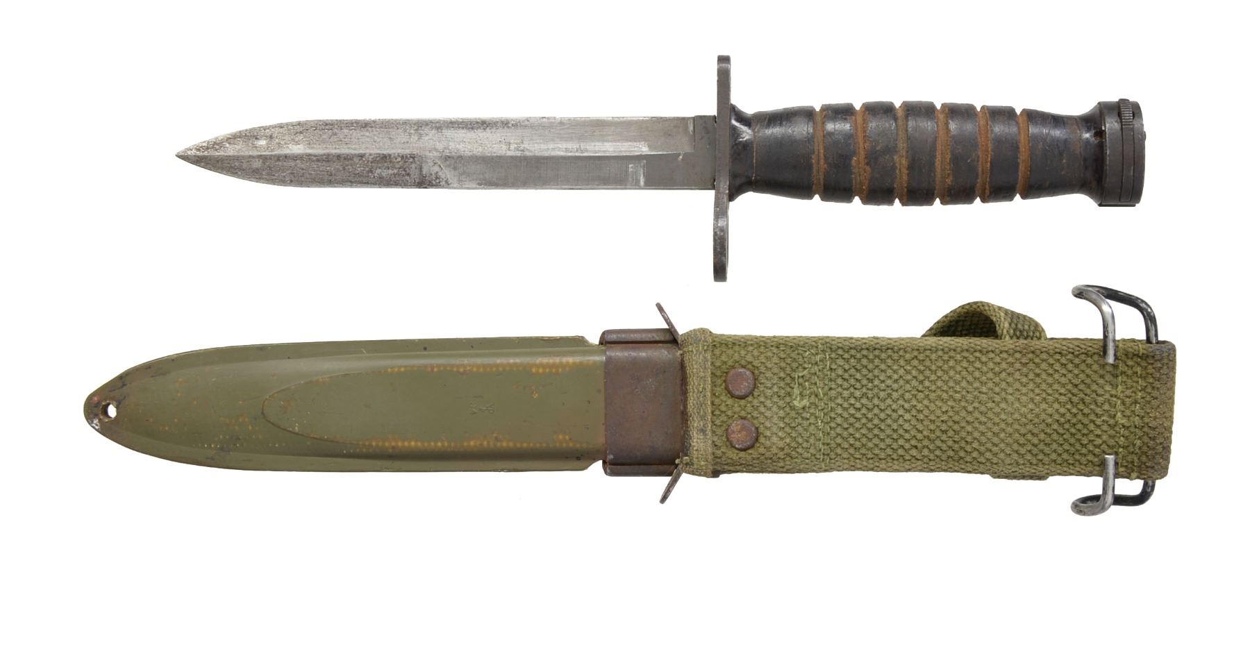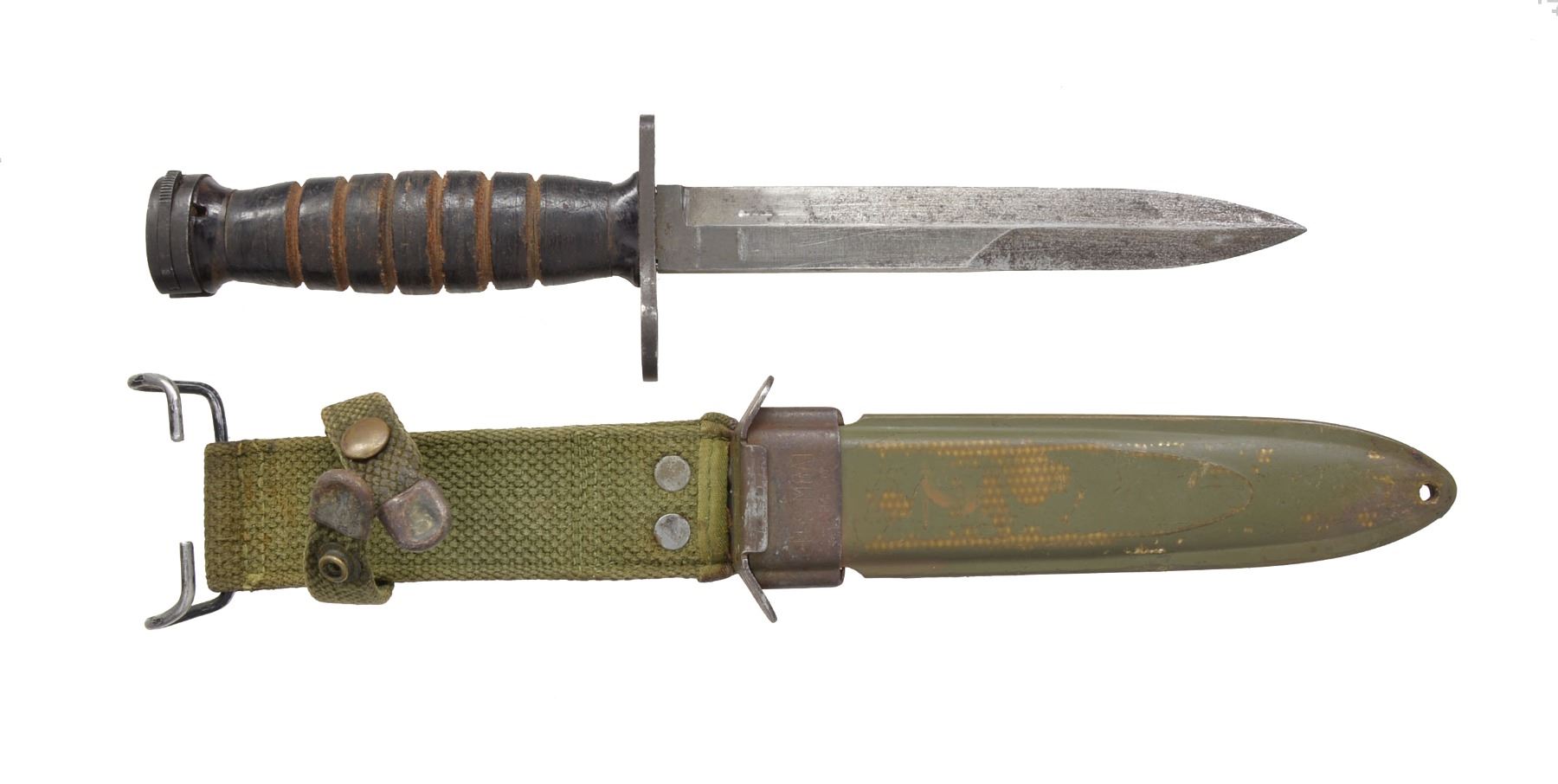 6 11/16" Spear point blade. Crossguard is marked on forward side "U.S. M4 IMPERIAL". Grooved leather washer handle. Green plastic scabbard marked "US M8A1" w/ green web frog. CONDITION: blade has been lightly sharpened shows traces of original parkerized finish w/ light wear & peppery oxidation. Leather handle has light scuffing & wear. Scabbard shows wear, throat has light oxidation, but in good serviceable condition. (02-13412/RW). $30-50.