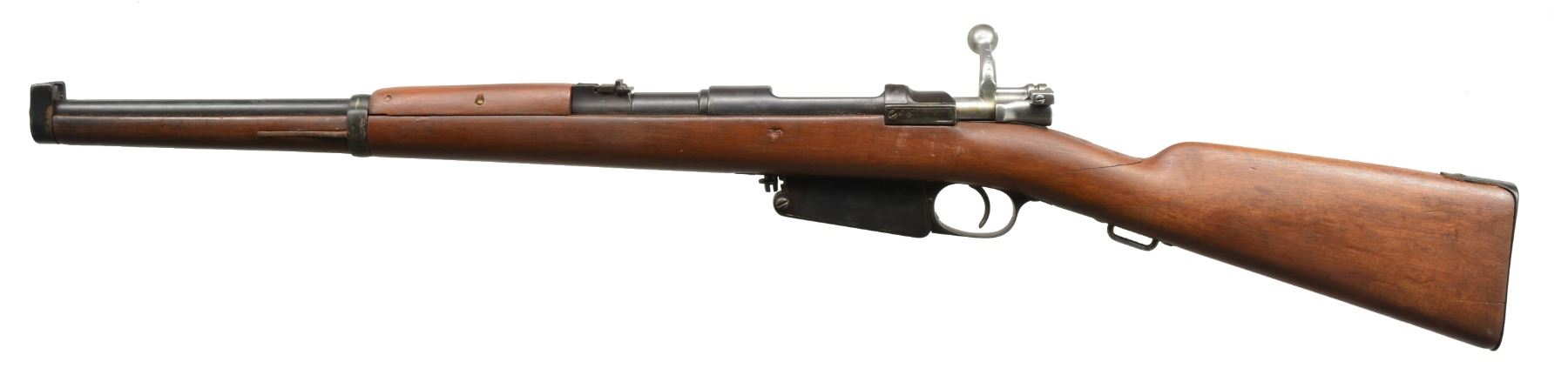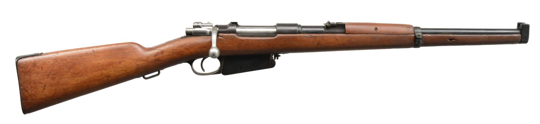 Cal. 7.65 Argentine. S# C7563. Bbl. Numbers match on receiver & bolt. Receiver has faint DWM markings on left rail. Argentine crest has been removed. Has turned down bolt handle. Ladder rear sight graduated to 1,200m. Inverted V front sight w/ protective ears. Walnut stock & handguard. Stock retains sling bar underneath grip. CONDITION: refinished stock has extensive cracks in grip area w/ vertical reinforcing screw. Has significant loss of wood in inletted areas. Handguard retained by sm. screws. Metal has been heavily polished & given arsenal type refinish w/ wear & pitting. Fair worn bore turning dark in grooves. (20-1315/RW). CURIO. $150-225.