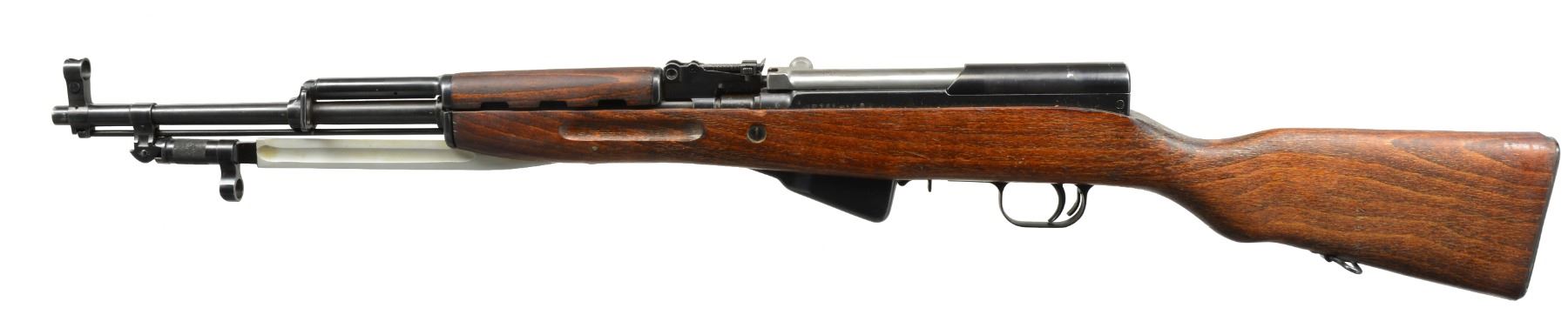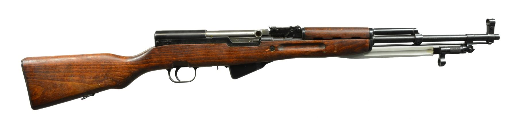 Cal. 7.62x39. S# GN751-1959. Bbl. 20 1/2" import marked on right side. Receiver marked w/ arrow in triangle & dated 1959. All visible numbers match. Tangent rear sight graduated to 1,000m. Hooded post front sight. Cleaning rod is present. Folding bayonet w/ 9 1/2" fluted blade. Hardwood stock set. Trap buttplate. CONDITION: stock set has light wear & scattered handling marks. Stock finish has crazed flaking finish. Metal retains 90% blue w/ light wear & scattered handling marks. Very good shiny bore. (20-778/RW). CURIO. $400-600.
