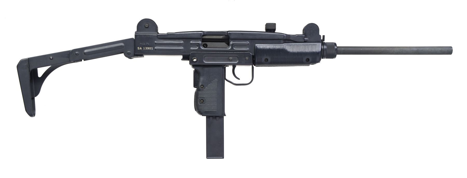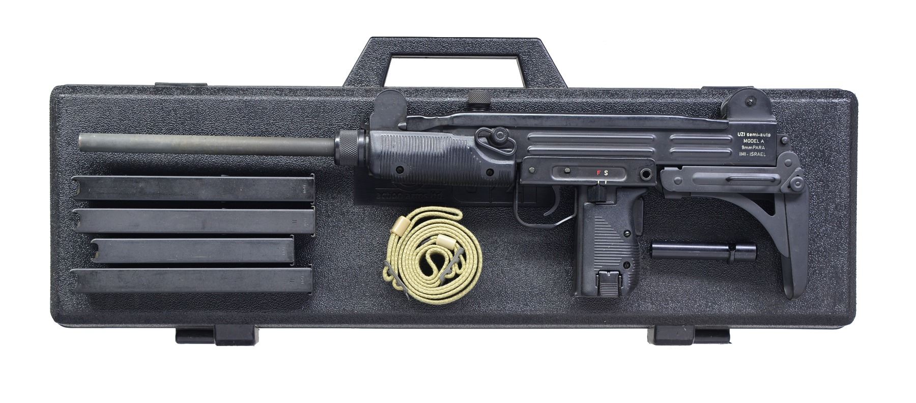 Cal. 9x19mm. S# SA13901. Bbl. 16.125". Very desirable Action Arms Ltd./IMI UZI model A semi automatic carbine. The first closed bolt semi automatic version of the world-famous SMG. Fitted w/ factory collapsible stock & including a 3.5" bbl. blank, almost resembling the SMG to a "T". Front sight elevation & windage adj. protected post. Non adj. rear sight, flip up L type peep sight marked "100" & "200". Classic black painted finish on most exposed metal parts. F-S trigger group. Rotating sling swivel on left side of receiver. Black plastic furniture. The Model A is a bit more elusive & sought after than the more common Model B, though the differences are quite subtle. They include a bolt mounted firing pin safety block & the sling swivel rotates only 90 degrees compared to 180 degrees on most Model Bs. The only other notable differences are in the sighting system where the front sight is also adj. for windage in the Model A and the rear sight has no adj. beyond selecting the proper aperture. MAGS: 1-25 rd. & 3-32 rd., all IMI. UNATTACHED ACCESSORIES: black factory plastic storage/shipping box, beige canvas sling, mag. loader & 3.5" faux display bbl. CONDITION: has had very little use, if any at all. No noticeable major blemishes on finish of any exposed area. Fire control mechanism appears to function properly when cycled by hand. (19-5961/JZ). MODERN. $800-1,200.