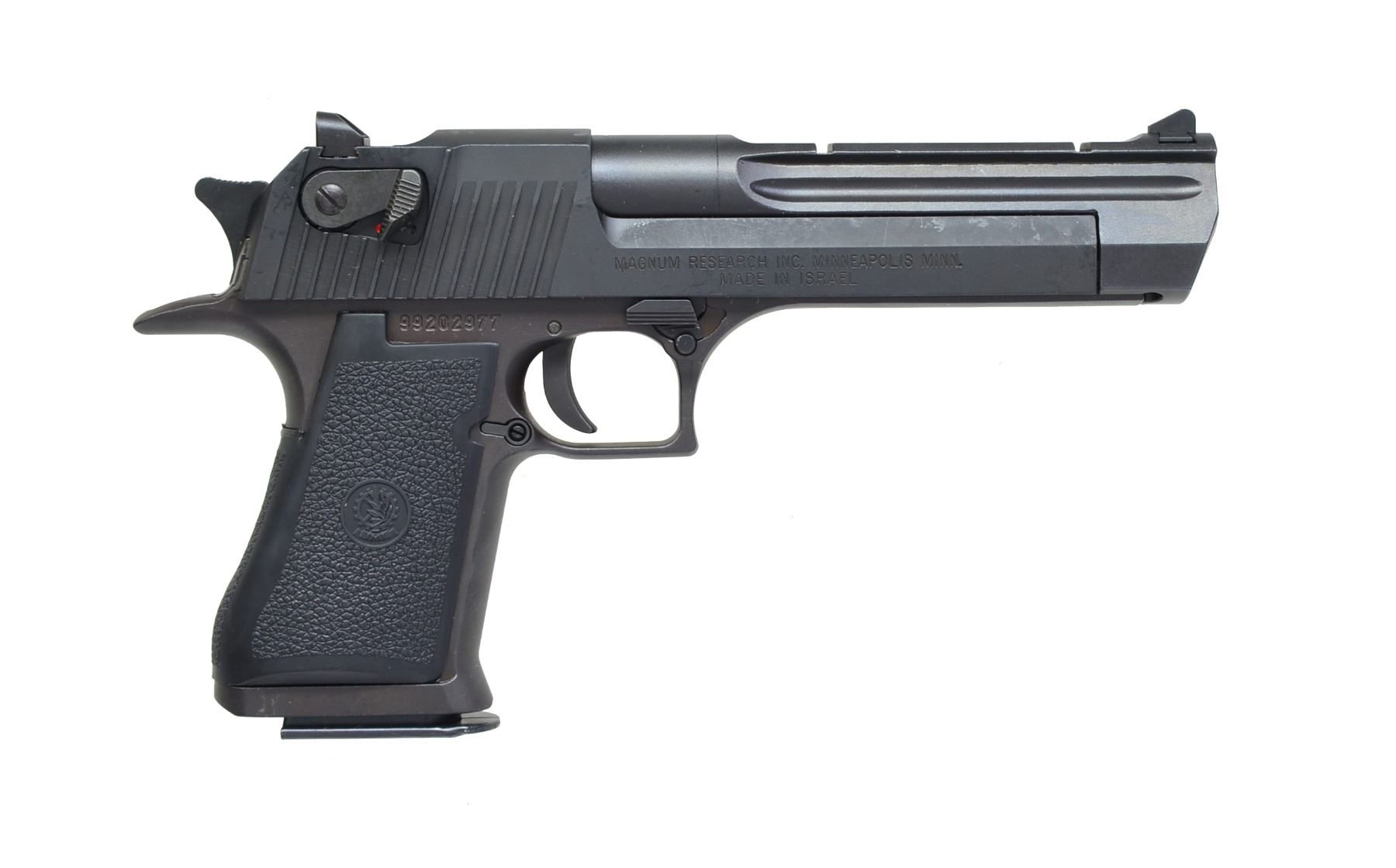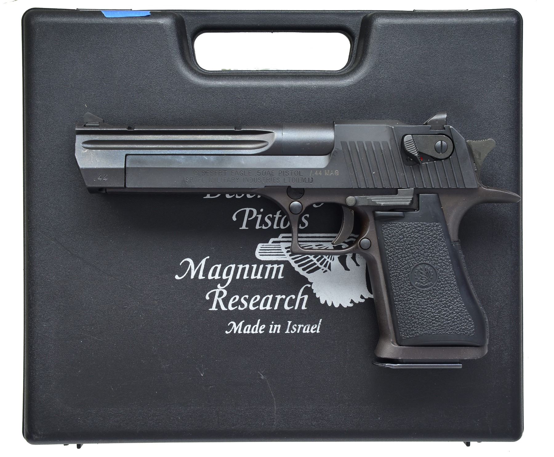 Cal. 44 Mag. S# 99202977. Bbl. 6" w/ dovetailed serrated ramp front blade & integral weaver style rail having 2 slots for scope mounting. Slide w/ dovetailed fixed notched rear sight. Mfg. 1998-2009 by IMI of Israel & distributed by Magnum Research of MN. Mark XIX variation w/ 50 cal. frame plus 50AE marked slide additionally stamped "/ 44 MAG". Matte black finish w/ pebble grained black synthetic grip. Multi grooved slide stop & ambidextrous slide safety w/ tear drop shaped levers. MAGS: 2 near excellent factory 8 rd. marked "7-95 / 44". UNATTACHED ACCESSORIES: factory black plastic case & packaging to include blank warranty card. CONDITION: all aspects including bore near excellent appearing new & unfired. (20-1335/NW). MODERN. $900-1,400.