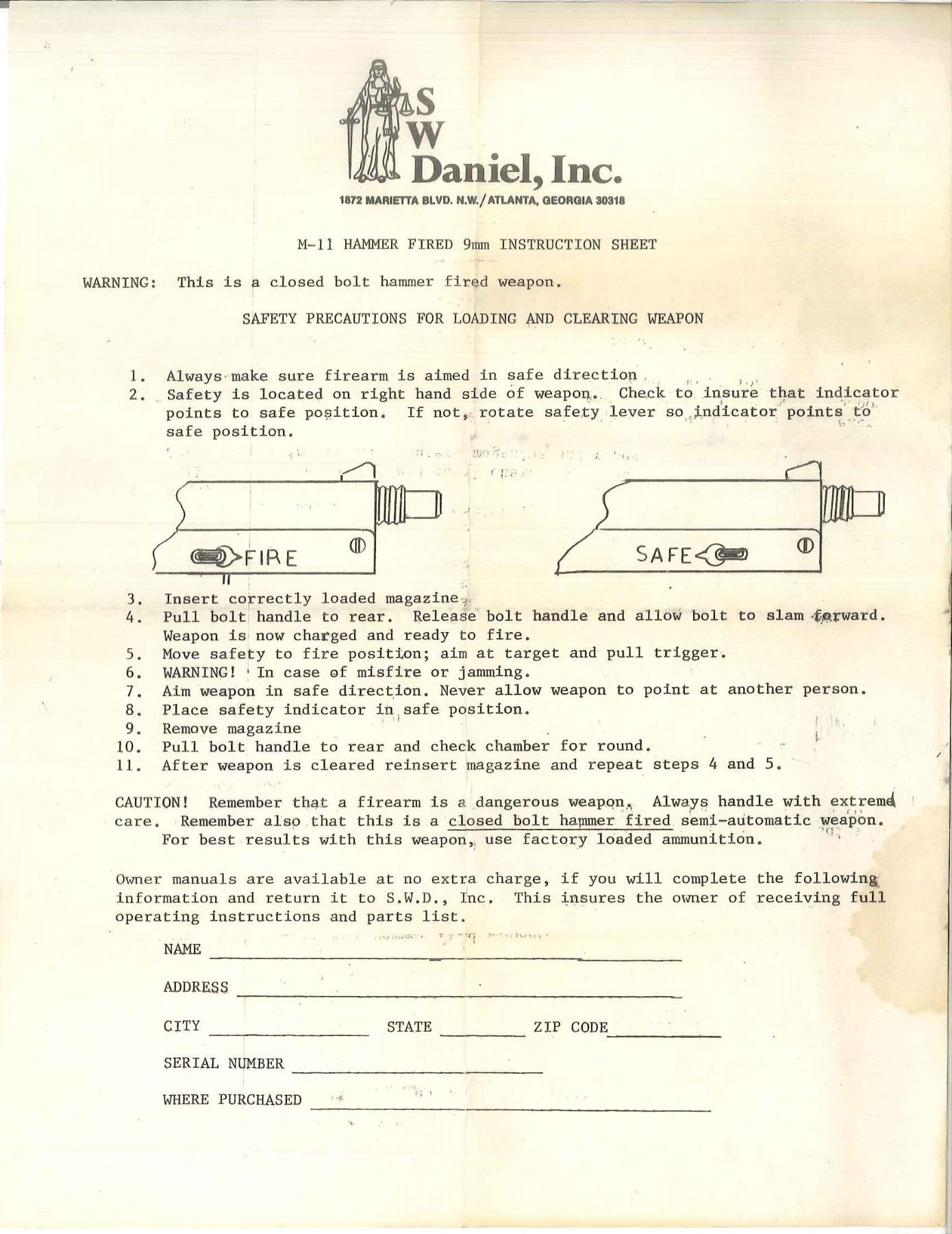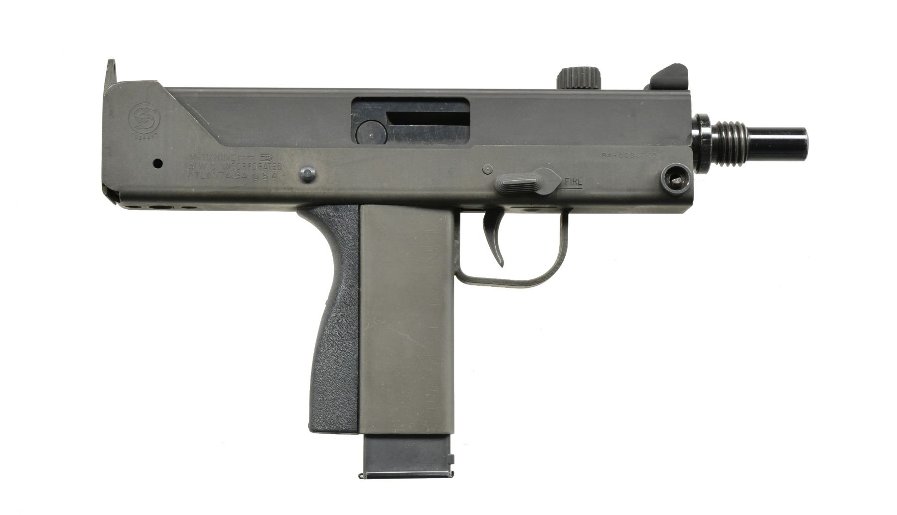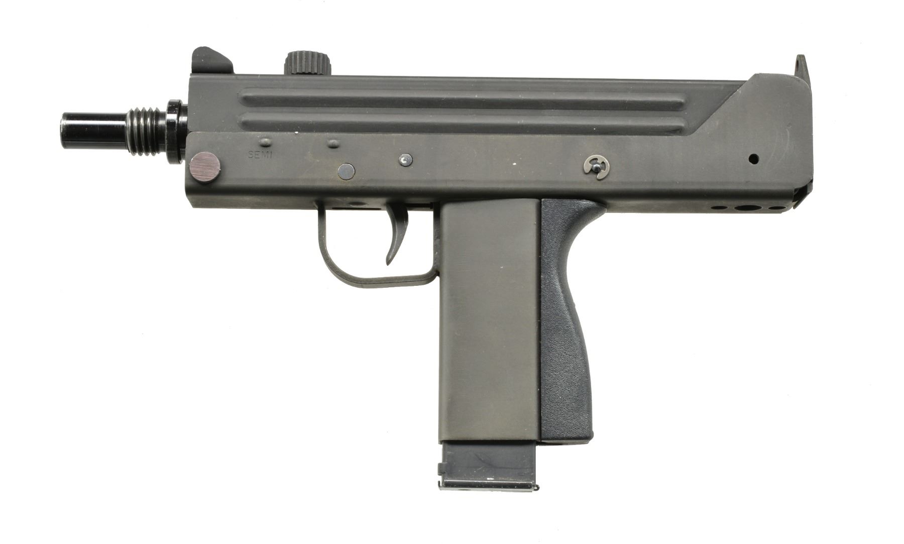 Cal. 9x19. S# 84-0002805. Bbl. 5.1/4". A closed bolt hammer fired semi automatic version of the infamous M11 SMG. Black parkerized finish. Protected post non adj. front sight. Non adj. rear peep sight. Other than a few subtle differences such as the absence of stock slots & a selector on the left side of the receiver, it is almost indistinguishable from its famous sibling. Emblemized w/ the Cobray logo on the right side of the lower receiver & top portion of upper receiver, this particular gun was manufactured by S.W.D. Inc. in Atlanta, GA. MAGS: 1-12 rd. Zytel. UNATTACHED ACCESSORIES: cardboard & styrofoam factory packaging, cleaning rod, original S.W.D. instruction sheet. CONDITION: by all appearances, appears to be as new, possibly only test fired. Finish on all external areas is complete & uniform w/ only light scuff marks. Fire control mechanism appears to function normally when cycled by hand. (19-5960/JZ) MODERN. $400-700.