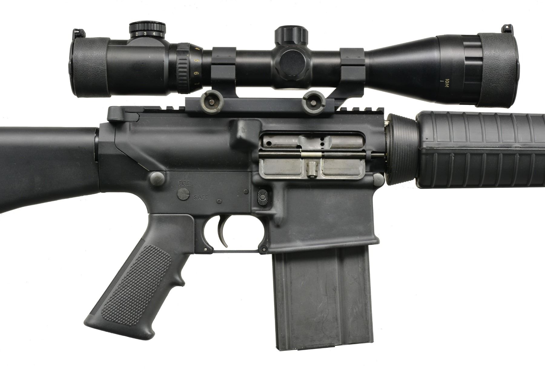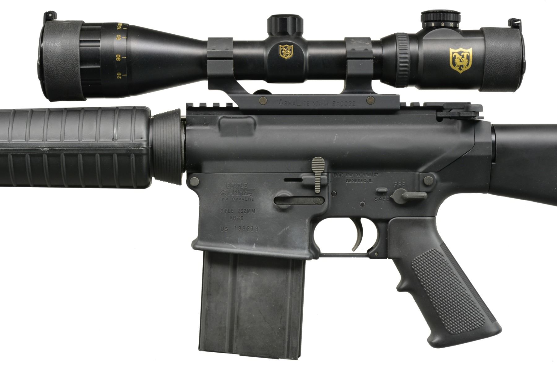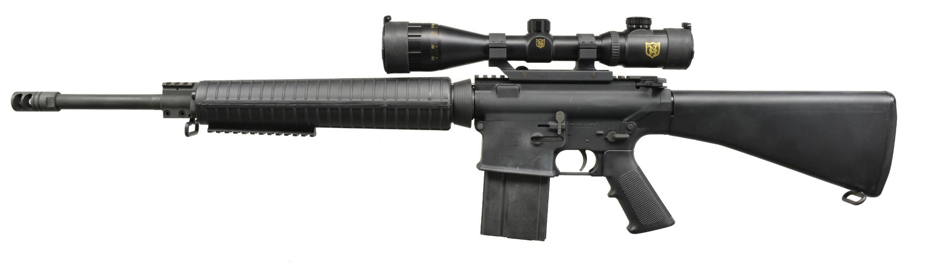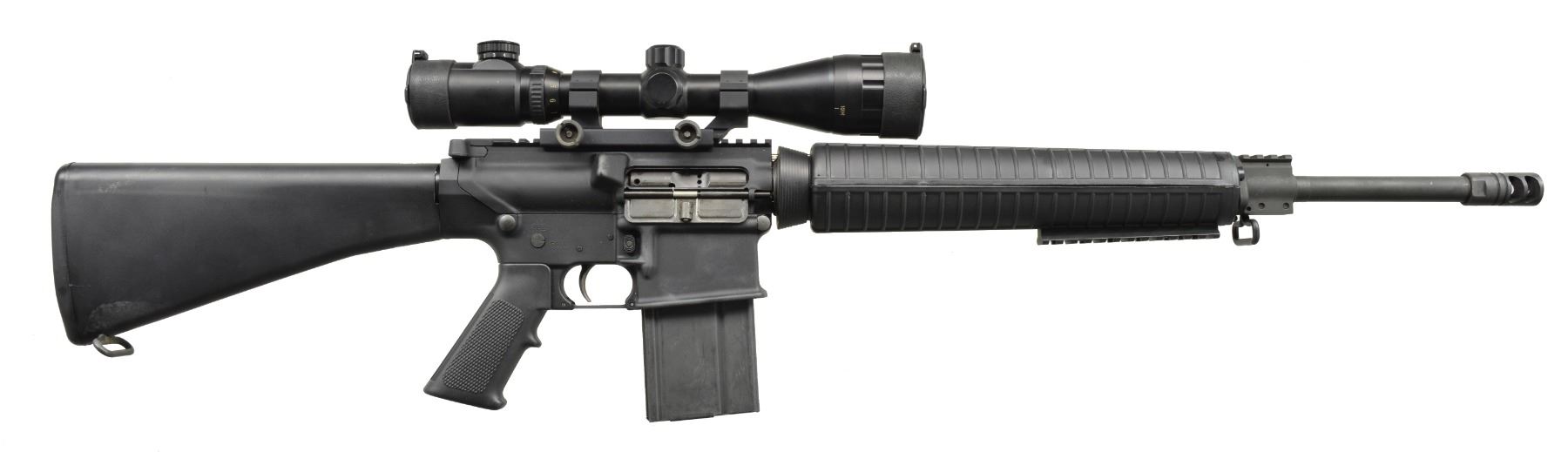 Cal. 308. S# US199213. Bbl. 21" over muzzle break. A2 style flat top AR10 design mfg. under contract from Armalite, Geneseo, IL. Armalite style muzzle break, low profile gas block, w/ 1.5" picatinny rail section & no bayonet lug. A2 rifle circular handguards w/ 5" picatinny rail section mounted at 6 o"clock. Flat top upper receiver w/ brass deflector, no forward assist. Full length A2 rear stock w/ trap door. This AR10 variant utilizes the modified M14 style mag. Armalite EX 0022 30mm scope mt. w/ gold crown 3-9x44mm scope w/ illuminated reticle. UNATTACHED ACCESSORIES: CONTICO hard case; includes extra as new buttstock, 1 extra new pistol rip, 1 extra set of A2 rnd. handguards, OD Green. MAGS: 4-20 rd. steel. & 2-10 rd. steel. CONDITION: dark black finish on both receivers w/ light handling marks, furniture appears as most mil spec furniture of the period looked, shiny bore w/ good rifling, fire control mechanism appears to function correctly when cycled by hand w/ extremely light trigger. (20-731/JZ). MODERN. $900-1,100.