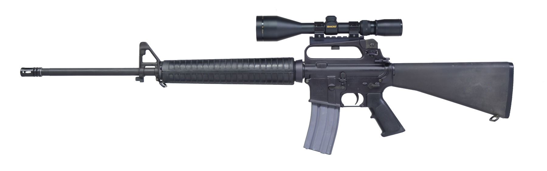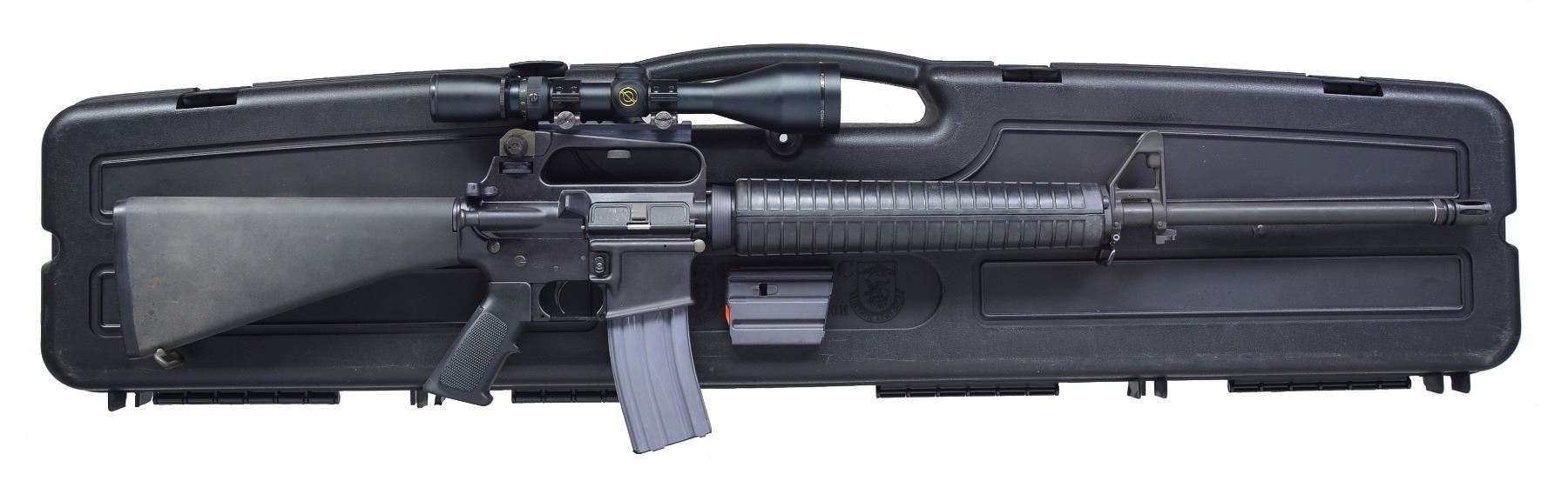 Cal. 5.56. Bbl. 20". S# L041215. Bbl. 20". A Windham, ME variant of the desirable XM-15 rifle. It is an A2 variant H-Bar w/ a threaded muzzle & A2 flash hider. Protected post front sight w/ bayonet lug, carry handle w/ E2 sights adj. for windage & elevation. Brass deflector & rnd. forward assist. Full length A2 buttstock w/ trap door. A2 style rnd. handguards. Matching black finish on receivers. Bbl. marked "B MP 5.56 NATO 1/9 H BAR". MAGS: 1-10 rd. aluminum & 1-30 rd. aluminum. UNATTACHED ACCESSORIES: Simmons 2.5-10x50 pro 50 scope w/ rings, base & caps; an Olympic arms styrofoam lined plastic case. CONDITION: finish on all exterior metal surfaces is complete w/ only light handling marks, furniture appears to be mil spec standard furniture, bright bore w/ strong rifling, fire control mechanism appears to function properly when cycled by hand. (20-707/JZ). MODERN. $500-1,000.