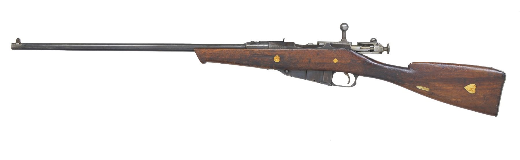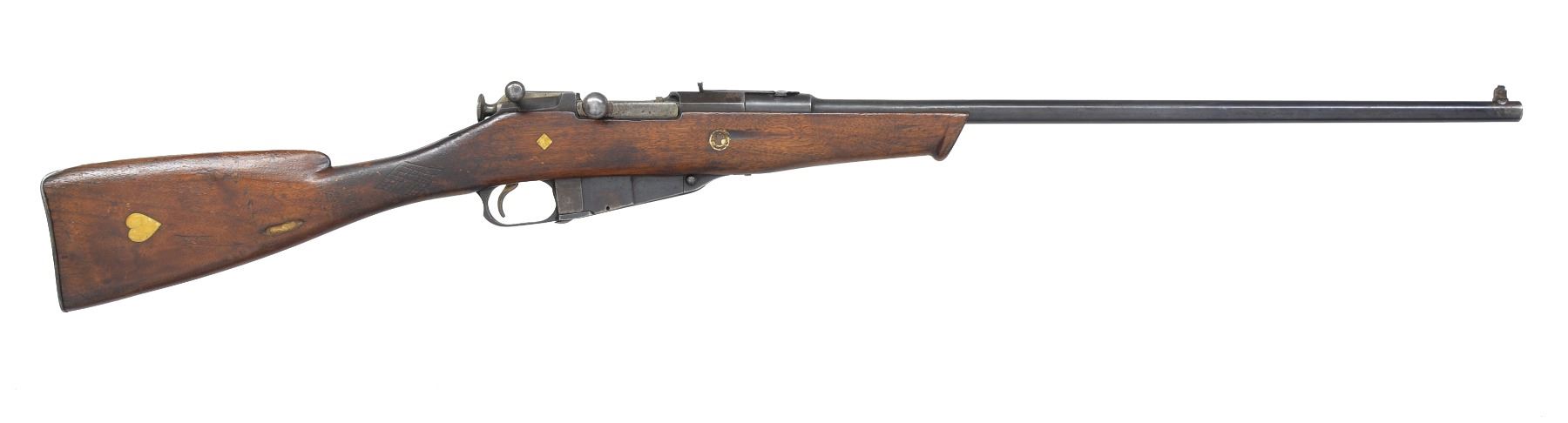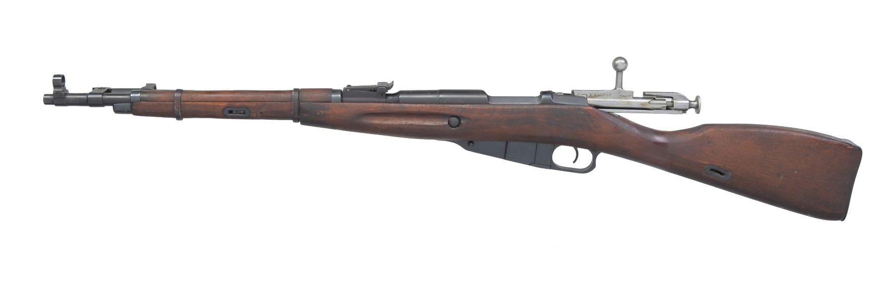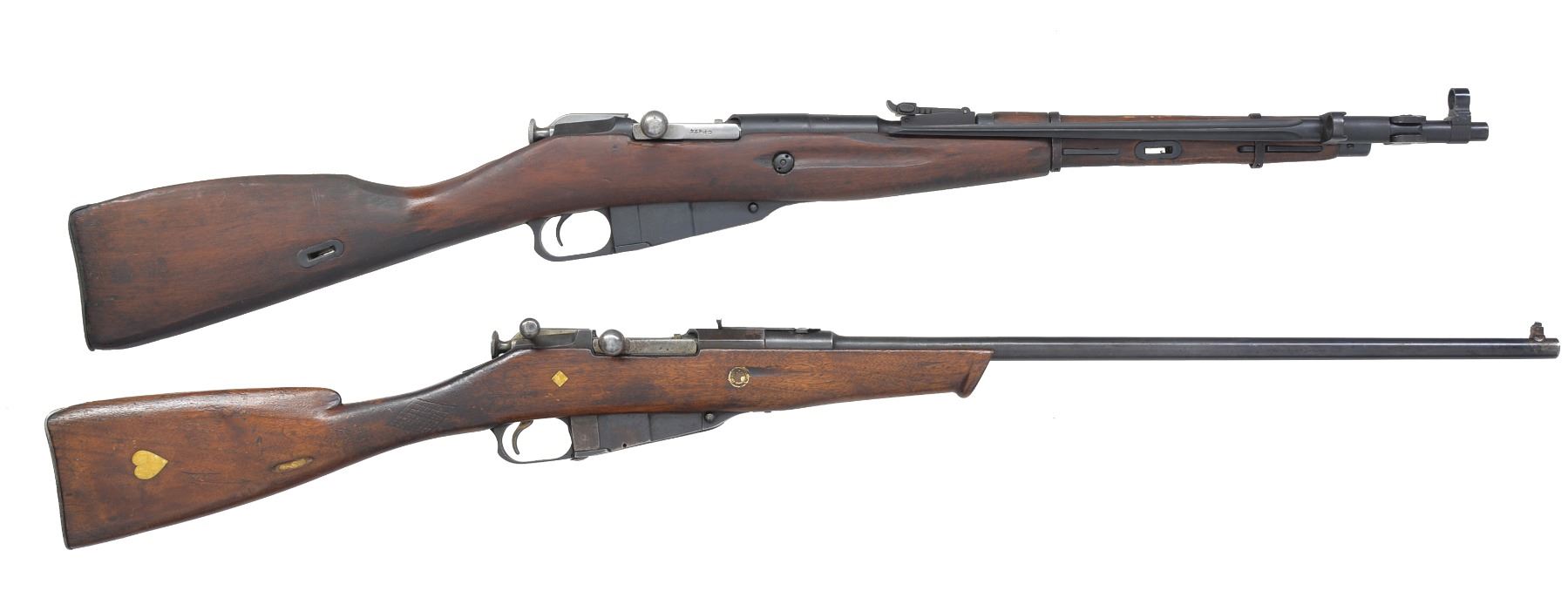 RIFLE. 1) POLISH MODEL 44 CARBINE. Cal. 7.62x54R. S# KT01120. Bbl. 20 1/4". Matching #s on receiver, bbl., floorplate & bolt. Straight bolt handle. Rnd. profile receiver. Bbl. marked "11" in oval, indicating Polish mfg. Bbl. dated "1953". Tangent rear sight graduated to 1000 meters. Post front sight w/ protective hood. 12 1/8" Folding spike bayonet. Hardwood stock set w/ sling slots. CONDITION: markings removed by arsenal reworked stock finish. Metal retains 90% arsenal reworked finish w/ light wear & scattered scratches. Fair worn bore turning dark in grooves. (20-1298/RW). CURIO. 2) REMINGTON MOSIN NAGANT CUSTOM RIFLE. Cal. 7.62x54R. S# ATF7620138. Bbl. 24 1/8". Markings visible on top of bbl. indicate mfg. by Remington. Hex receiver. Straight bolt handle. Cocking piece has been modified w/ additional handle to allow safety to be easily operated. Bbl. has dovetail cut over chamber & sporting rear sight installed. Has blade front sight w/ white bead installed on bbl. Walnut stock has been extensively modified, shortened w/ white inlays. CONDITION: stock has refinish w/ extensive wear, staining, dents, scratches & flaking finish. Metal has traces of blue turning gray patina w/ thinning, wear, scratches, light oxidation & fine pitting. Good bore w/ wear to lands. (20-1300/RW). MODERN. $150-300.