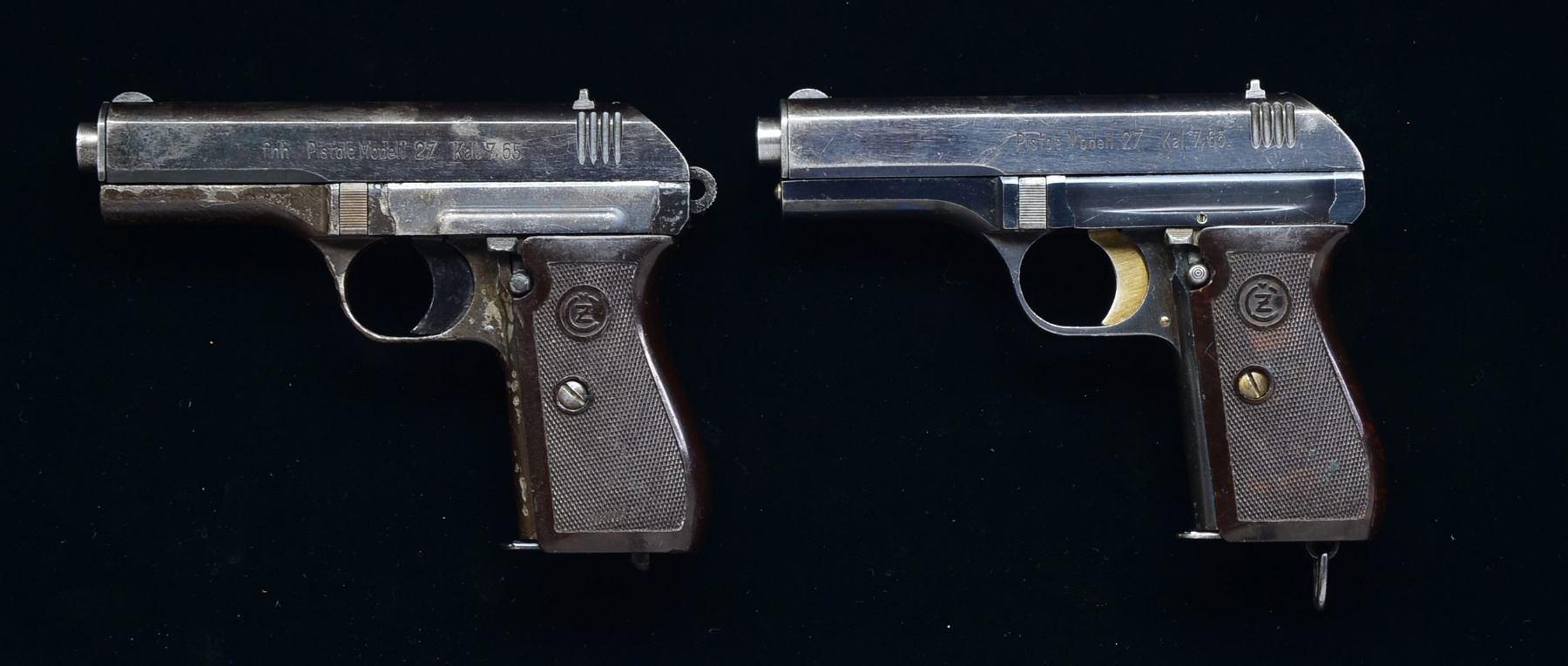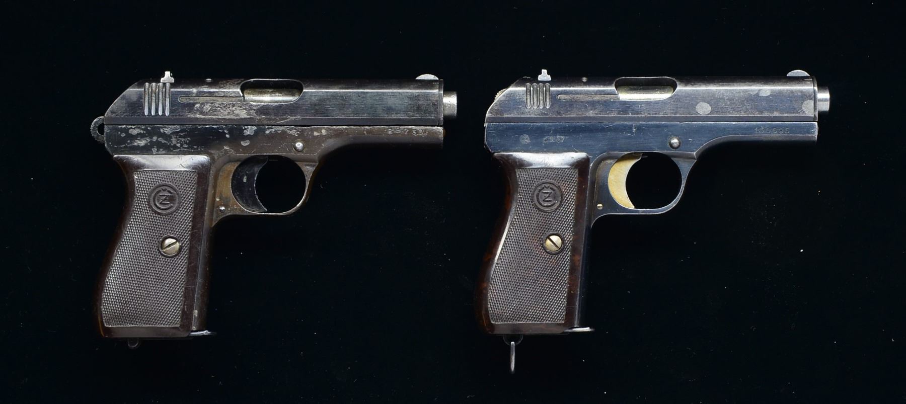 BOTH: cal. 7.65mm (32 ACP). Bbls. 4". Semi circular front sights w/ fixed V notch rear sights. Rounded hammers, blued finish. 1 Piece checkered Bakelite grips w/ CZ logo. 1) S# 89730. Slide has non matching #382333. MAGS: 1-8 rd. CONDITION: 60% dull fading blue showing scattered spots of deep pitting & corrosion. Grips show moderate wear. Bore has slightly dull appearance & retaining sound rifling. (20-803/DS). 2) S# 130695. Slide is marked "BOHMISCHE WAFFENFABRIK A.G. IN PRAG" & non matching #112147. Bright finish trigger. Mag. release has lanyard ring. MAGS. 1-8 rd. numbered 230802. CONDITION: 80% lightly worn & faded blue showing spots of finish loss on slide & edge wear. Grips show light wear. Bore has darkened appearance retaining sound rifling. (20-804/DS). BOTH CURIO. $500-700.