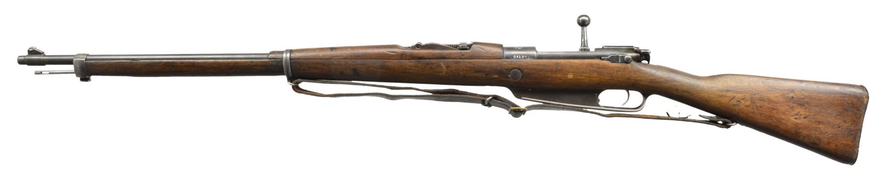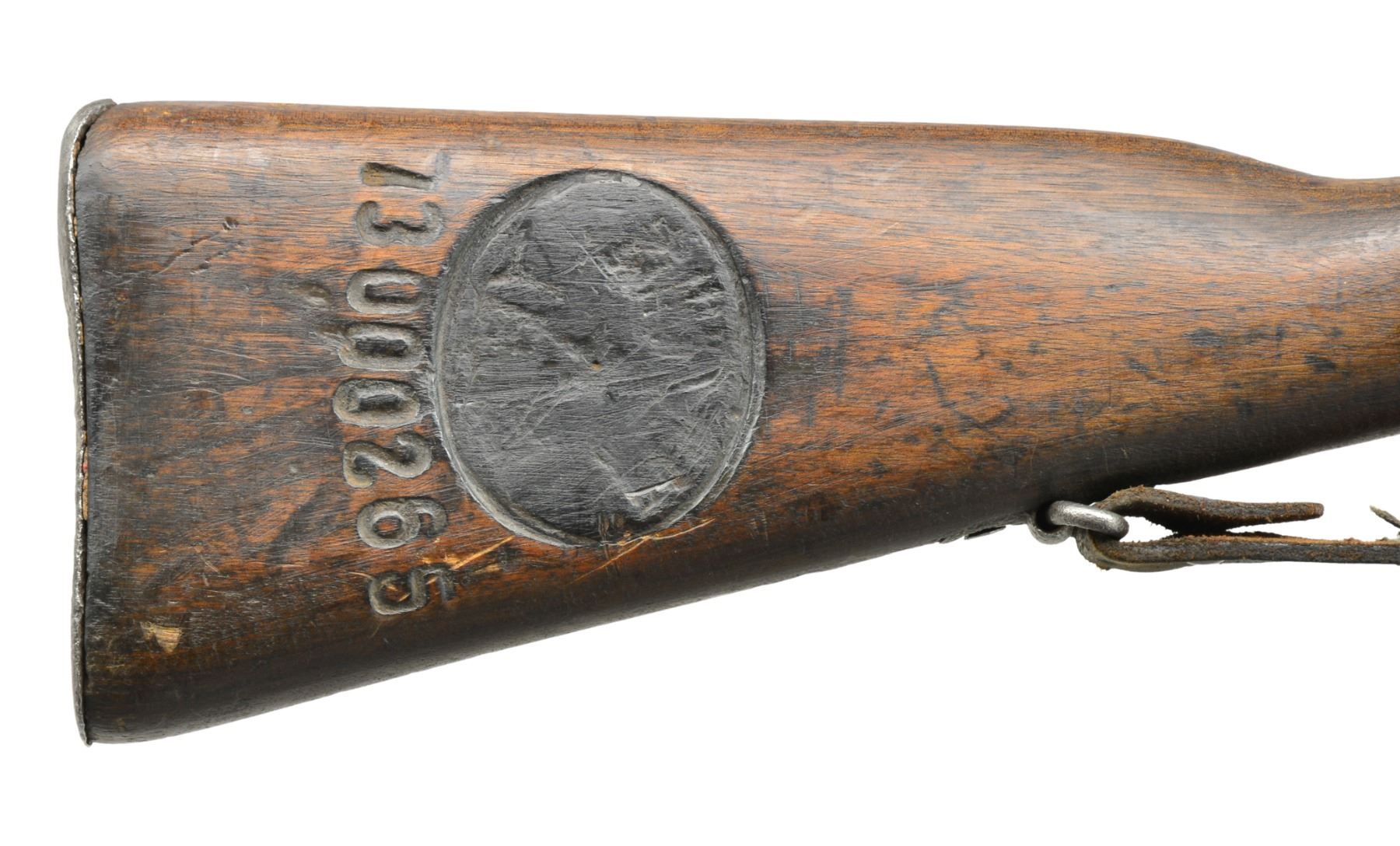 Cal. 8mm Mauser. S# 5A1368. Receiver marked on top w/ unknown Chinese crest. Markings enhanced in white. Chinese version of Model 88 Commission rifle made w/out bbl. jacket. Straight bolt handle. Tangent rear sight graduated to 2,000m. Inverted V front sight. Cleaning rod is present. Bottom swivels. Has vintage military sling. CONDITION: stock set has arsenal rework type finish w/ staining, wear, dents & scratches. Lg. oval marking on right of butt has been removed, 8 digit number is remaining. Stock has lg. crack behind receiver tang. Has cracks around recoil bolt, underneath forend. Handguard has several cracks ahead of rear sight. Heavily worn metal has been cleaned leaving fine pitting & overall gray finish. Poor worn oxidized bore. (20-788/RW). CURIO. $400-600.