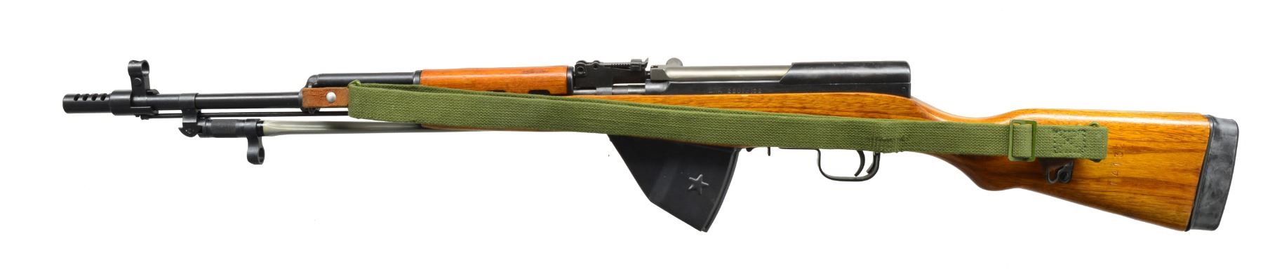 Cal. 7.62x39. S# 23014132. Bbl. 20 1/2. An excellent example of an early Chinese SKS as imported through KFS, Atlanta, GA. Triangle factory code 306 on left side of receiver w/ unknown Chinese characters & serial #. Folding spike bayonet, hooded post front sight, rear tangent sight marked "100 to 1000m". Stock is correct orange tinted variant, numbered to rifle. Someone has added a 1" rubber recoil pad but it may not interfere w/ restoring the rifle to original configuration if the attachment points line up w/ the original metal plate which is still there. Original trapdoor is still accessible & contains cylindrical cleaning kit. Non detachable mag. has been modified to 20 rds. & a slip on muzzle break has been added as well. Original cleaning rod is present. Left side mounted green canvas sling. CONDITION: original metal finish enjoys complete coverage on all exposed surfaces w/ only light scratching on the top cover. Wooden stock has normal impression marks but no obvious defects. Bore is shiny w/ very well pronounced rifling. Bayonet locks solidly both in open & closed position. Fire control mechanism appears to function correctly when cycled by hand. (20-1082/JZ). MODERN. $300-400.