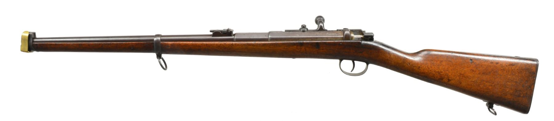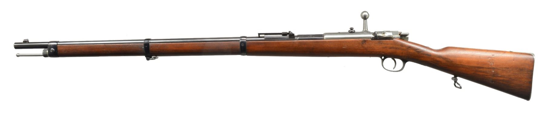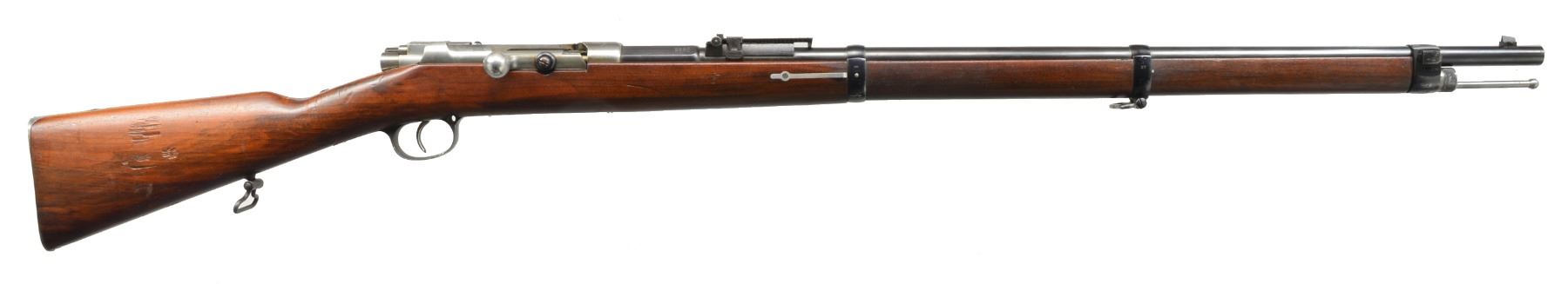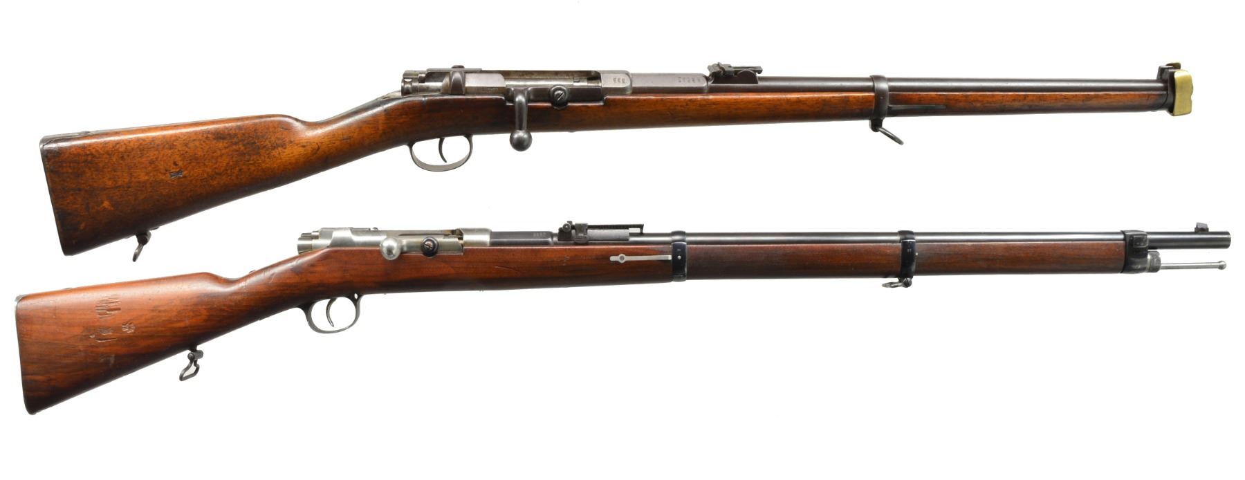 BOTH: cal. 11x60R. 1) SPAND GENBERG & SAUER MODEL 71 CAVALRY CARBINE. S# 1258. Bbl. 20". All visible numbers match. Single shot bolt action. Receiver marked on top left flat "K.Mod.71". Marked on right rear "1877" & right front w/ Imperial German proofs. Oct. bbl. reinforce marked on top flat w/ Imperial Eagle "Sp & Sr SUHL". Reinforce has Imperial proofs. Ladder rear sight graduated to 1,200m. Inverted V front sight. Nosecap has protective ears. Walnut stock extends to muzzle. Stock marked w/ Imperial acceptance marks on right side of butt & behind trigger guard tang. Buttplate marked w/ unit marking "B.2.R.I.D.F.4.38". Bbl. band made w/ saddle ring, buttstock has sling swivel. Made w/out bayonet lug. UNATTACHED ACCESSORIES: non matching brass muzzle cap & sight protector. CONDITION: stock has sm. crack behind receiver tang & sm. crack in front of action screw escutcheon. Stock has worn original finish w/ moderate wear, dents, scratches & staining. Metal has traces of blue turning gray & patina w/ scattered very fine pitting. Shiny bore w/ sharp lands has several scattered pits (01-17053/RW). 2 ) SPANDAU MODEL 71 / 84. S# 4627. Bbl. 31.5". All numbers match. Fine example of early German service rifle. Rnd. receiver marked on left wall w/ "I.G.Mod.71/84". Marked on right side w/ "1888". Oct. bbl. reinforce marked on top flat w/ Imperial crown & "SPANDAU". Left flat marked w/ Crown "F.W.". Right flat marked w/ Imperial proof marks. Ladder rear sight graduated to 1,600m. Inverted V front sight. Mag. cap has stacking rod. Bottom sling swivels. Parade swivel is not present in trigger guard. Buttplate marked at heel "G.R.J.3.80.". Walnut stock marked at belly & on right side w/ crisp Imperial acceptance marks. CONDITION: stock has attractive original finish, but has numerous dents & scratches around buttstock, perhaps due to storage rack. Bright receiver, buttplate & mag. cap. Balance of metal retains blue finish w/ fire blue visible on trigger & cutoff retaining spring. Very good shiny bore. (01-17054/RW). BOTH ANTIQUE. $1,200-1,600.