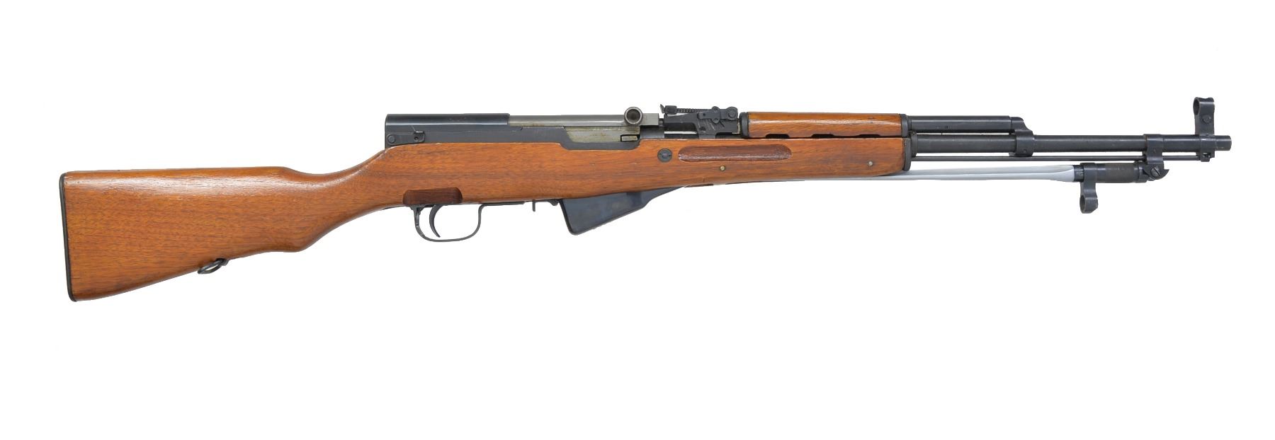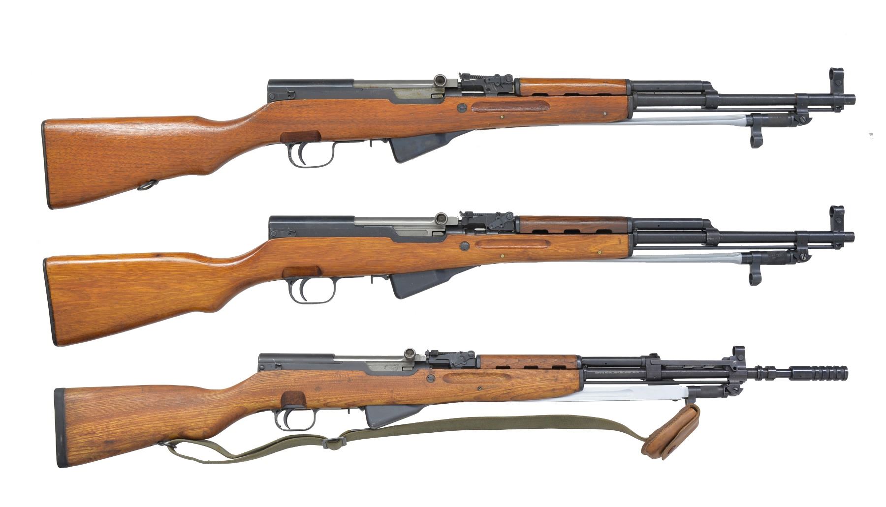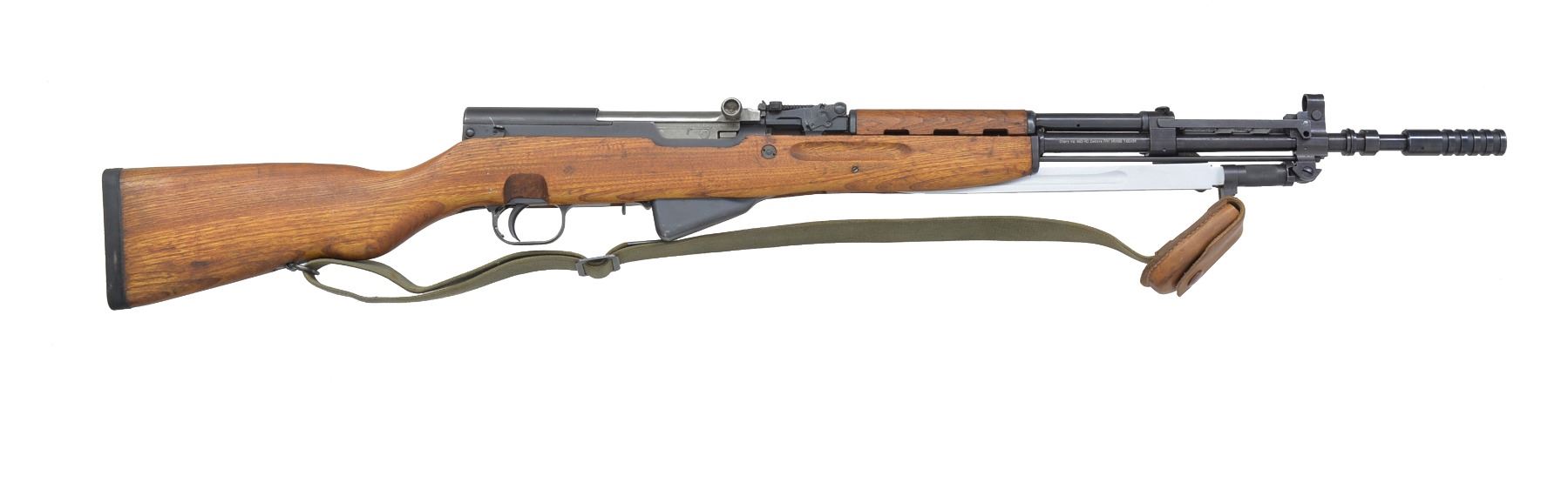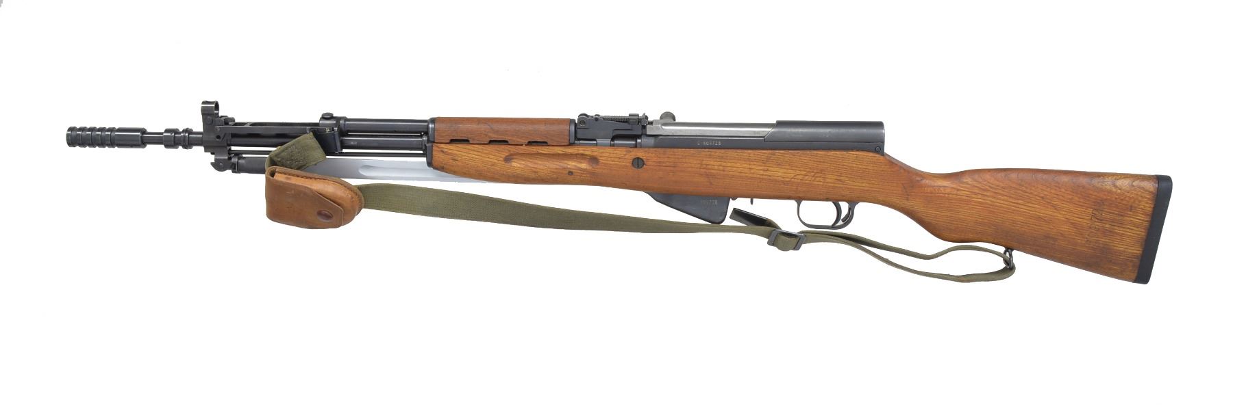 1) CHINESE. Cal. 7.62x39. S# 241296. Bbl. 20 1/2". All visible numbers match. Import marked on left side of receiver. Tangent rear sight graduated to 1,000 meters. Hooded post front sight. Cleaning rod present. 12 1/4" folding spike bayonet. Hardwood stock set w/ trap buttplate. UNATTACHED ACCESSORIES: cleaning kit in butt. CONDITION: stock set shows light wear & scattered handling marks. Metal retains 90% blue w/ light handling marks & scattered sm. scratches. Very good shiny bore. (20-1301/RW). MODERN. 2) CHINESE. Cal. 7.62x39. S# 10252386A. Bbl. 20 1/2". All visible numbers match. Import marked on left side of receiver. Tangent rear sight graduated to 1,000 meters. Hooded post front sight. Cleaning rod present. 12 1/4" folding spike bayonet. Hardwood stock set. Side swivel on left side of butt. UNATTACHED ACCESSORIES: green web sling. Cleaning kit in butt. Chest type 10 pouch bandolier w/ wood button closures. Bandolier has Chinese markings; good serviceable condition. CONDITION: stock set shows light wear, dents & scratches w/ notable dents in top of grip behind receiver. Metal retains 90% blue w/ light wear & scattered scratches. Very good shiny bore. (20-1302/RW). CURIO. 3) YUGOSLAVIAN MODEL 59/66. Cal. 7.62x39. S# 0-609728. Bbl. 24 1/4" over grenade launcher. All visible numbers match. Import marked on right side of bbl. Tangent rear sight graduated to 1,000 meters. Post front sight w/ protective hood. Folding tritium front night sight. Folding grenade launching sight. Non ported grenade launcher. Cleaning rod present. 11 3/8" Folding fullered blade bayonet. Hardwood stock set w/ butt trap & solid rubber butt pad. Green web sling. Sling has leather pouch attached which contains brass oiler. UNATTACHED ACCESSORIES: oiler. Unmarked cardboard shipping box. CONDITION: stock set has good original condition w/ light wear, staining & handling marks. Metal retains 80% original blue w/ thinning, light wear & scattered scratches. Very good shiny bore. (20-1303/RW). MODERN. $900-1,200.