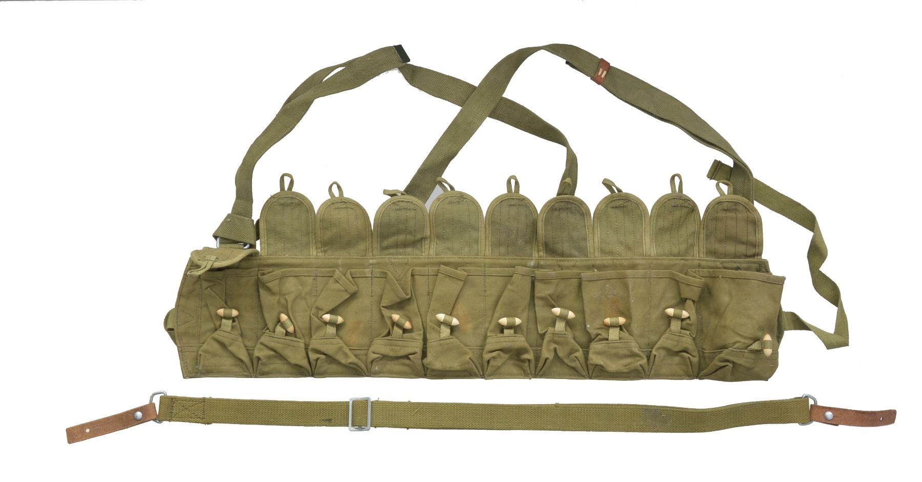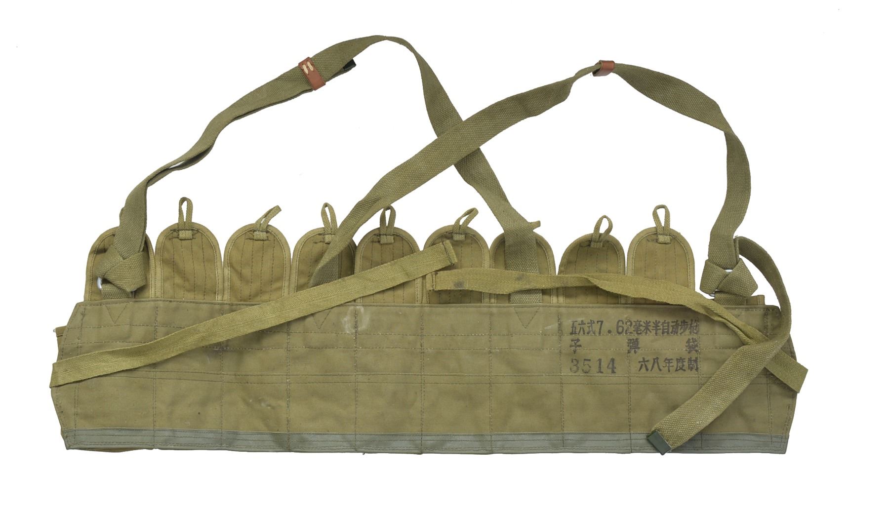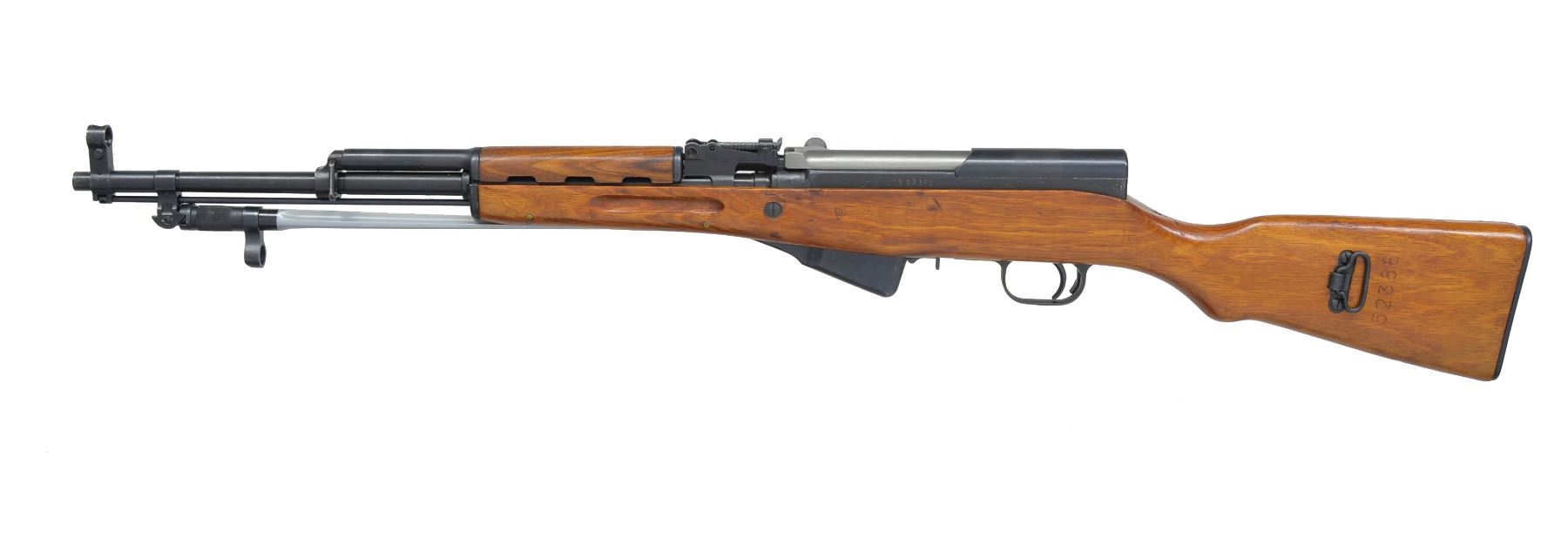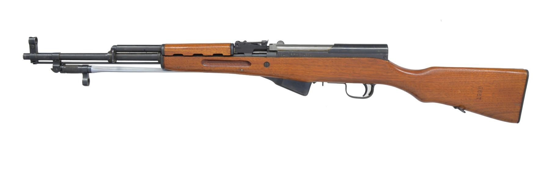 1) CHINESE. Cal. 7.62x39. S# 241296. Bbl. 20 1/2". All visible numbers match. Import marked on left side of receiver. Tangent rear sight graduated to 1,000 meters. Hooded post front sight. Cleaning rod present. 12 1/4" folding spike bayonet. Hardwood stock set w/ trap buttplate. UNATTACHED ACCESSORIES: cleaning kit in butt. CONDITION: stock set shows light wear & scattered handling marks. Metal retains 90% blue w/ light handling marks & scattered sm. scratches. Very good shiny bore. (20-1301/RW). MODERN. 2) CHINESE. Cal. 7.62x39. S# 10252386A. Bbl. 20 1/2". All visible numbers match. Import marked on left side of receiver. Tangent rear sight graduated to 1,000 meters. Hooded post front sight. Cleaning rod present. 12 1/4" folding spike bayonet. Hardwood stock set. Side swivel on left side of butt. UNATTACHED ACCESSORIES: green web sling. Cleaning kit in butt. Chest type 10 pouch bandolier w/ wood button closures. Bandolier has Chinese markings; good serviceable condition. CONDITION: stock set shows light wear, dents & scratches w/ notable dents in top of grip behind receiver. Metal retains 90% blue w/ light wear & scattered scratches. Very good shiny bore. (20-1302/RW). CURIO. 3) YUGOSLAVIAN MODEL 59/66. Cal. 7.62x39. S# 0-609728. Bbl. 24 1/4" over grenade launcher. All visible numbers match. Import marked on right side of bbl. Tangent rear sight graduated to 1,000 meters. Post front sight w/ protective hood. Folding tritium front night sight. Folding grenade launching sight. Non ported grenade launcher. Cleaning rod present. 11 3/8" Folding fullered blade bayonet. Hardwood stock set w/ butt trap & solid rubber butt pad. Green web sling. Sling has leather pouch attached which contains brass oiler. UNATTACHED ACCESSORIES: oiler. Unmarked cardboard shipping box. CONDITION: stock set has good original condition w/ light wear, staining & handling marks. Metal retains 80% original blue w/ thinning, light wear & scattered scratches. Very good shiny bore. (20-1303/RW). MODERN. $900-1,200.