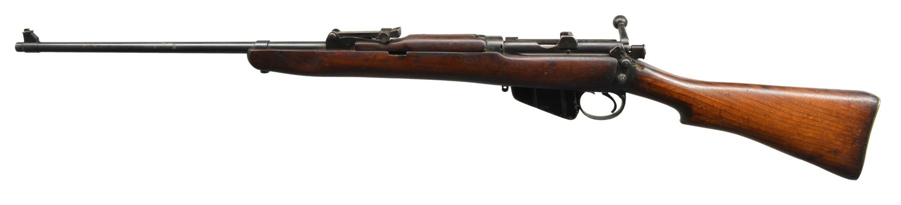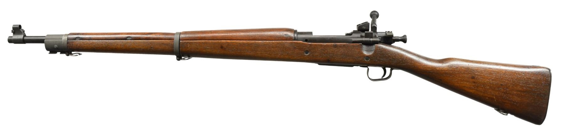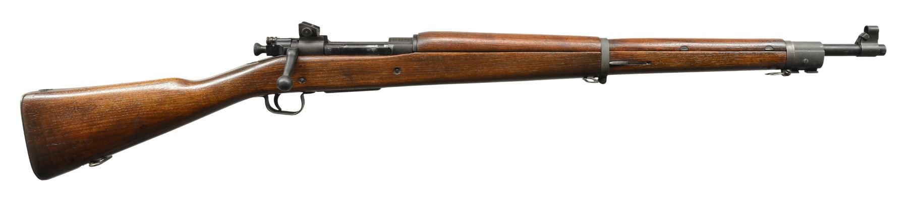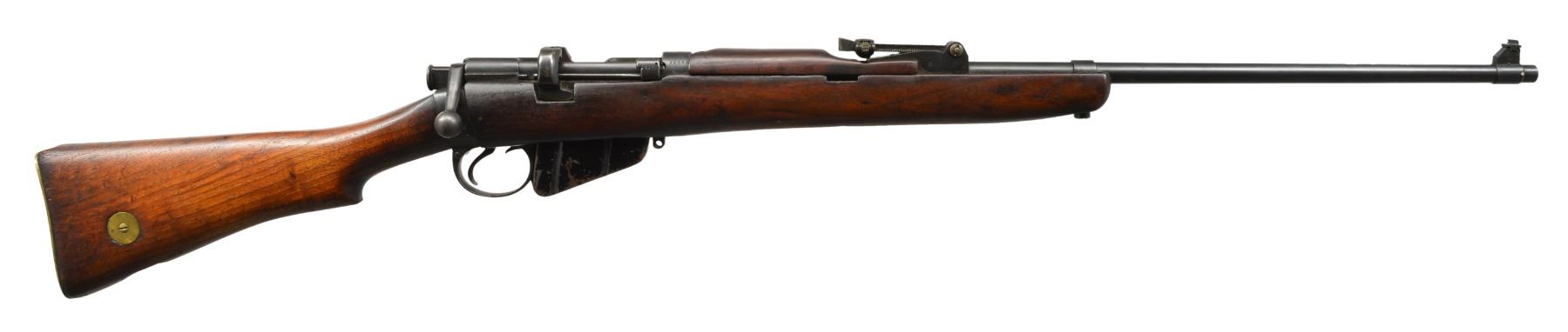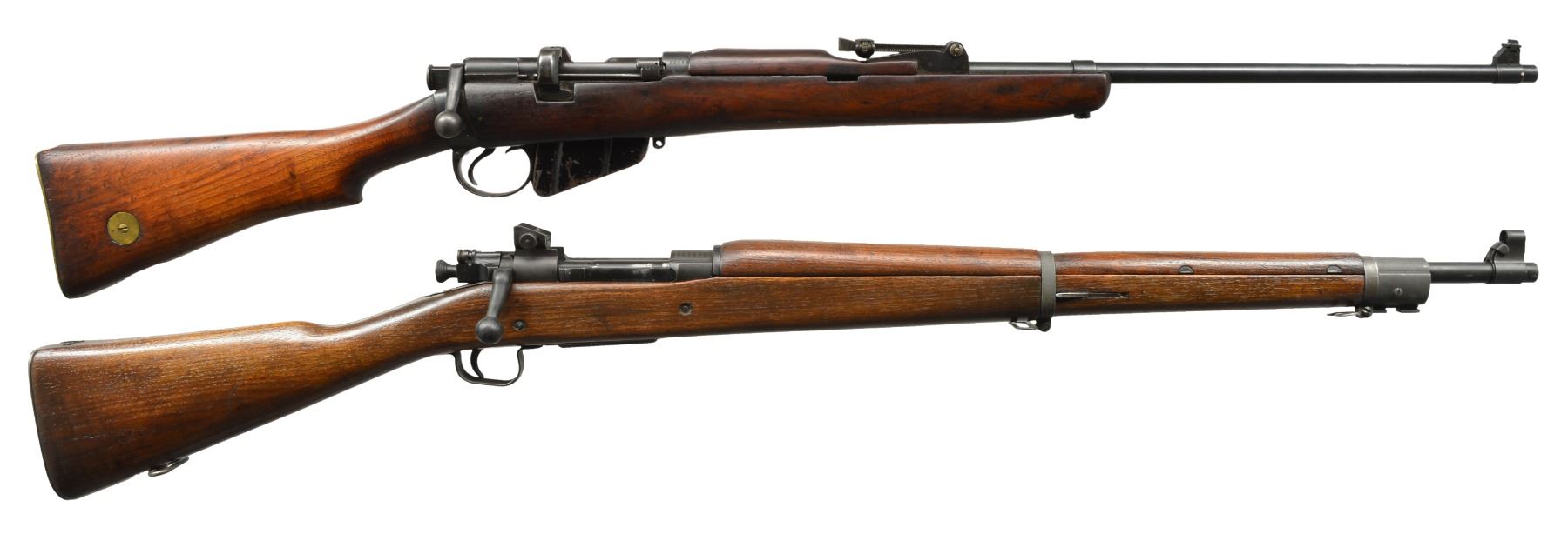1) BSA No. 1 SMLE MARK III*. Cal. 303 Brit. S# B22558. Bbl. 25" w/ ramp mounted blade front sight, graduated leaf Military rear sight. Forearm is shortened to sporter length, replacement handguard. MAGS: 1 detachable 10 rd. CONDITION: 70% dull lightly faded blue. Refinished stock is missing sling swivel. Forearm & handguard have dark worn appearance. Handguard has crack in front of action. Dark worn bore w/ rifling. (20-1387/DS). 2) SMITH CORONA 03-A3. Cal. 30-06. S# 3682994. Bbl. 24" marked "S C" over flaming bomb over "5 43" date. Hooded ramp front sight having flaming bomb over "U.S." on left side, adj. rear sight is mounted on rear receiver ring. Stamped trigger guard. Straight grip walnut stock w/ 2 recoil bolts, trapdoor buttplate & front sling swivel on bbl. band. Band fastened handguard. CONDITION: metal retains 80% parkerized finish showing wear & light fading. Refinished stock & handguard show dents & handling marks. Bore is bright w/ sound rifling. (20-1400/DS). BOTH CURIO. $600-900.