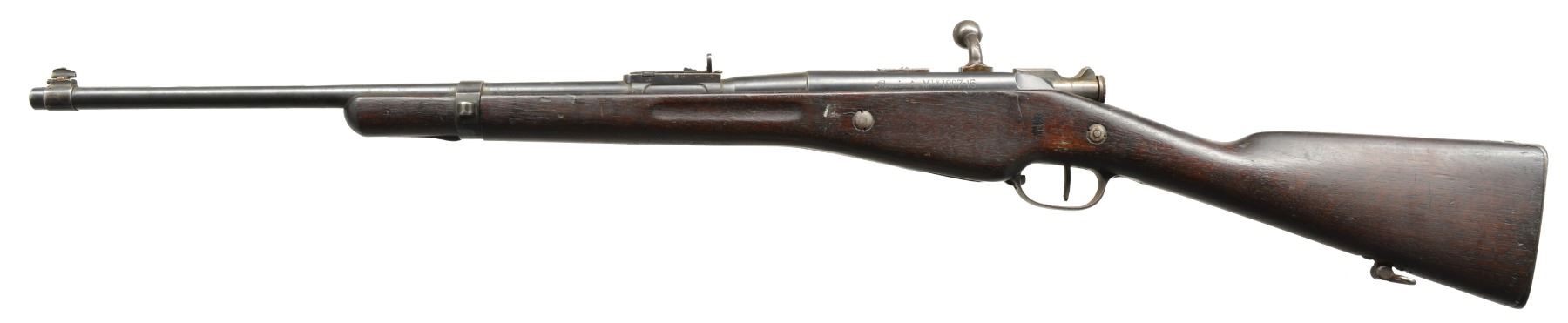 BOLT ACTION RIFLE. Cal. 8mm Lebel. NSN. Bbl. shortened to 22". Receiver marked "Remington Mle 1907-15". Bbl. marked "RAC 1907/15". Rear sight base has been modified to Marbles buckhorn rear sight. Has Bead sporting front sight fitted on bbl. w/ hobbyist gunsmith type workmanship. Straight grip walnut stock. Stock has lightly worn original finish w/ handling marks & scratches throughout. Retains traces of original blue w/ patina, oxidation & scattered fine pitting. Very good shiny bore. (20-1105/RW). MODERN. $100-150.