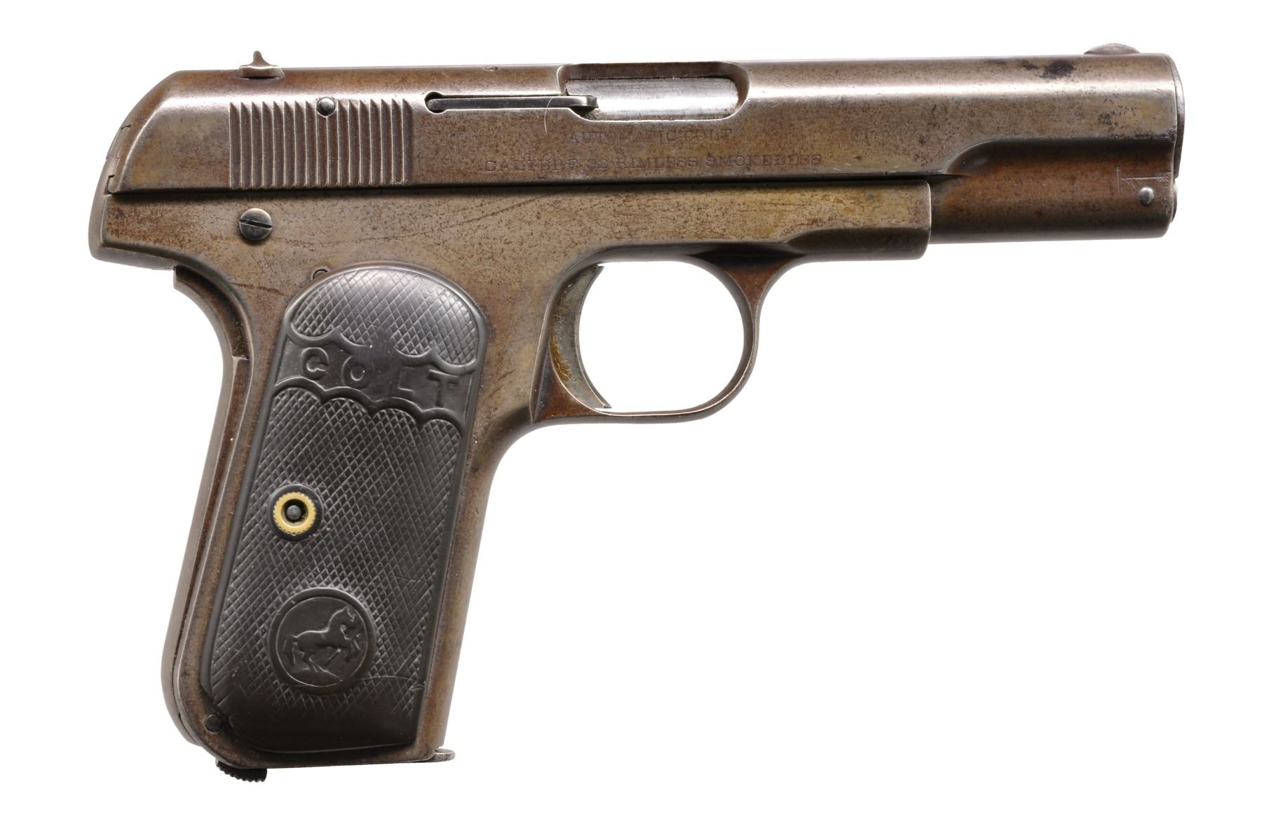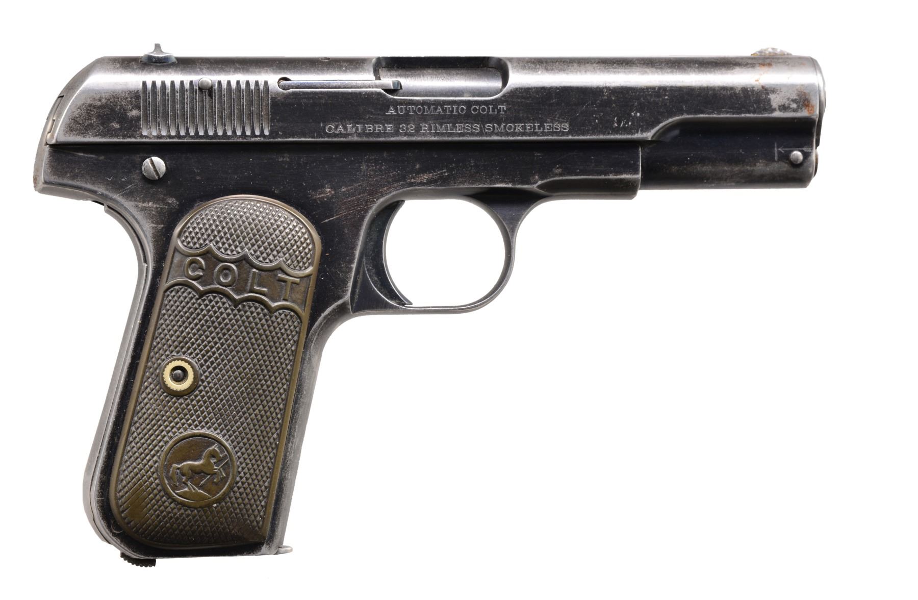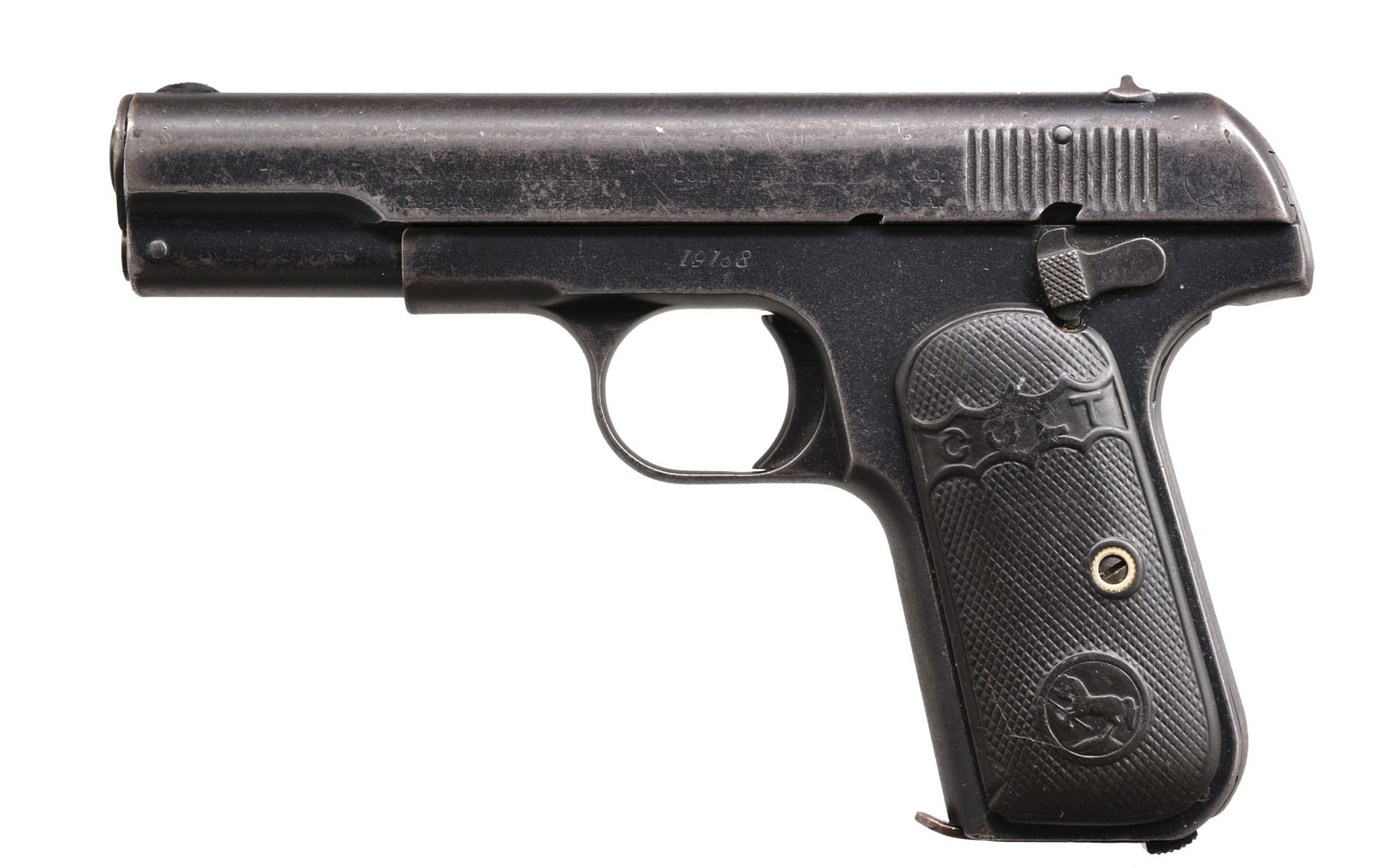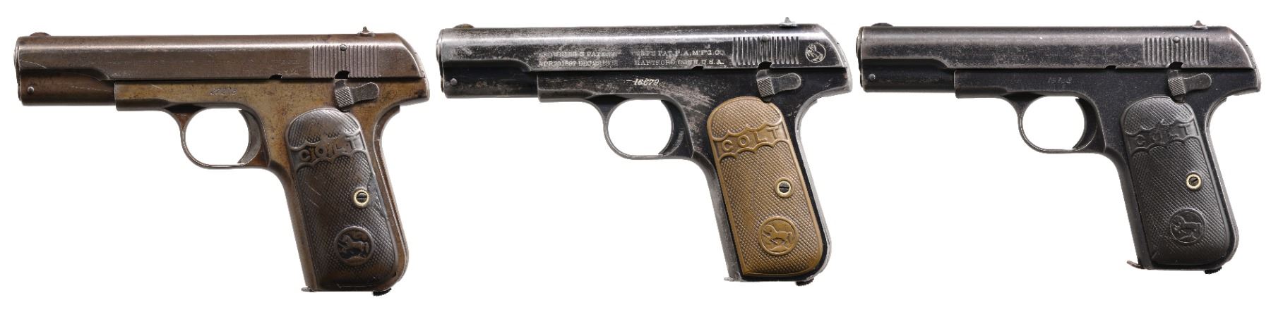 ALL: cal. 32 ACP. Bbl. 4". Type 1 w/ bbl. bushing & no mag. safety. Semi circular front sights w/ fixed U notch rear sights. Blue finish. 2 Piece checkered hard rubber grips. All there pistols mfg. 1905. MAGS: each pistol has 1 detachable 8 rd. mag. 1) S# 27213. CONDITION: metal has faded gray appearance from touch up finish over scattered spots of pitting & corrosion. Grips show heavy wear. Right panel has chip at butt. Left panel has repaired chip behind attachment screw. Bore has a lightly frosted appearance over intact rifling. (20-170/DS). 2) S# 16679. CONDITION: 60% dull fading blue blending w/ wear spots, handling marks & sm. spots of pitting. Grips show moderate wear. Bore has slightly darkened appearance over lightly worn rifling. (20-174/DS). 3) S# 19188. CONDITION: 70% dark worn reblued finish over weakened markings. Grips show heavy wear. Right panel is cracked from attachment screw through Rampant Colt to lower front corner w/ a 2nd crack along upper front edge. Left panel has hairline crack extending from front to Rampant Colt. Dark pitted bore retaining partially visible rifling. (20-176/DS). ALL CURIO. $800-1,200.