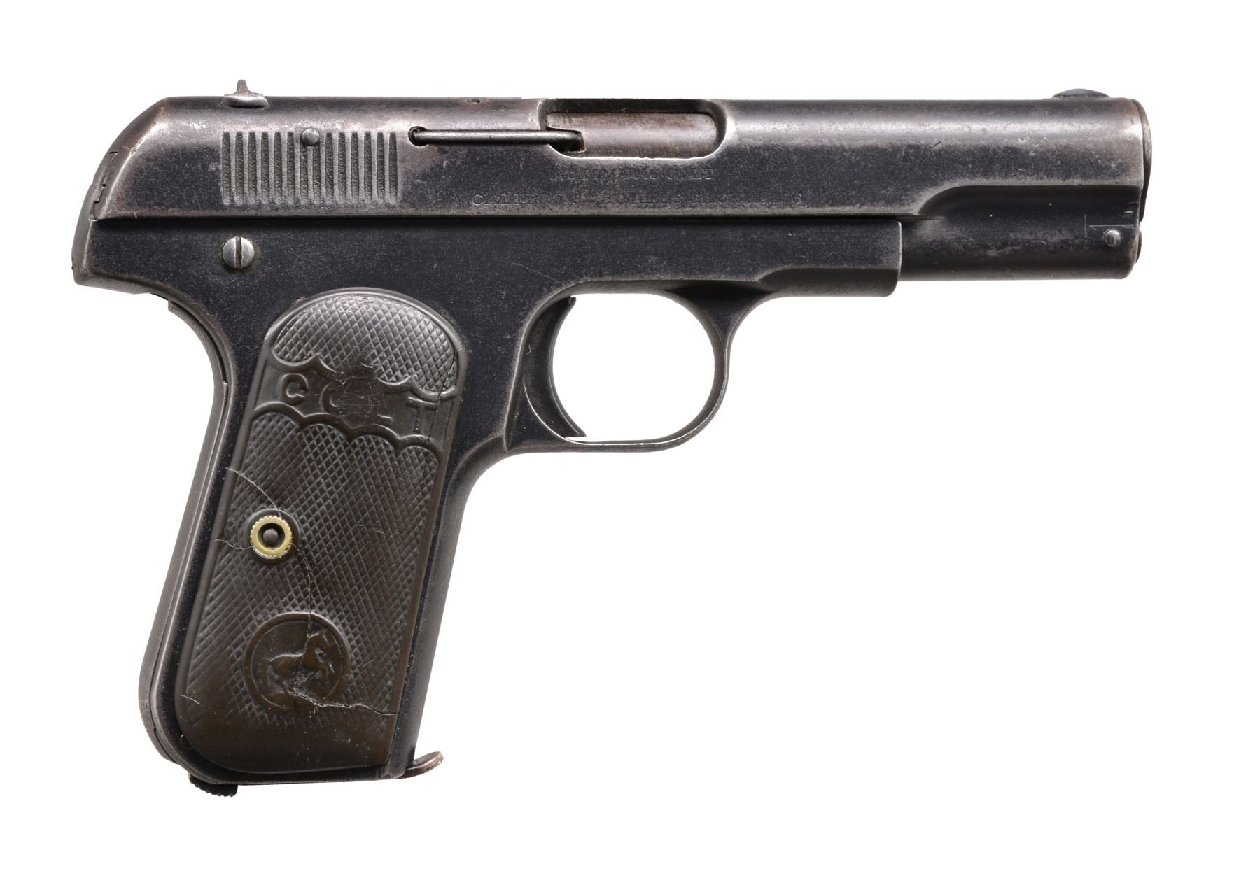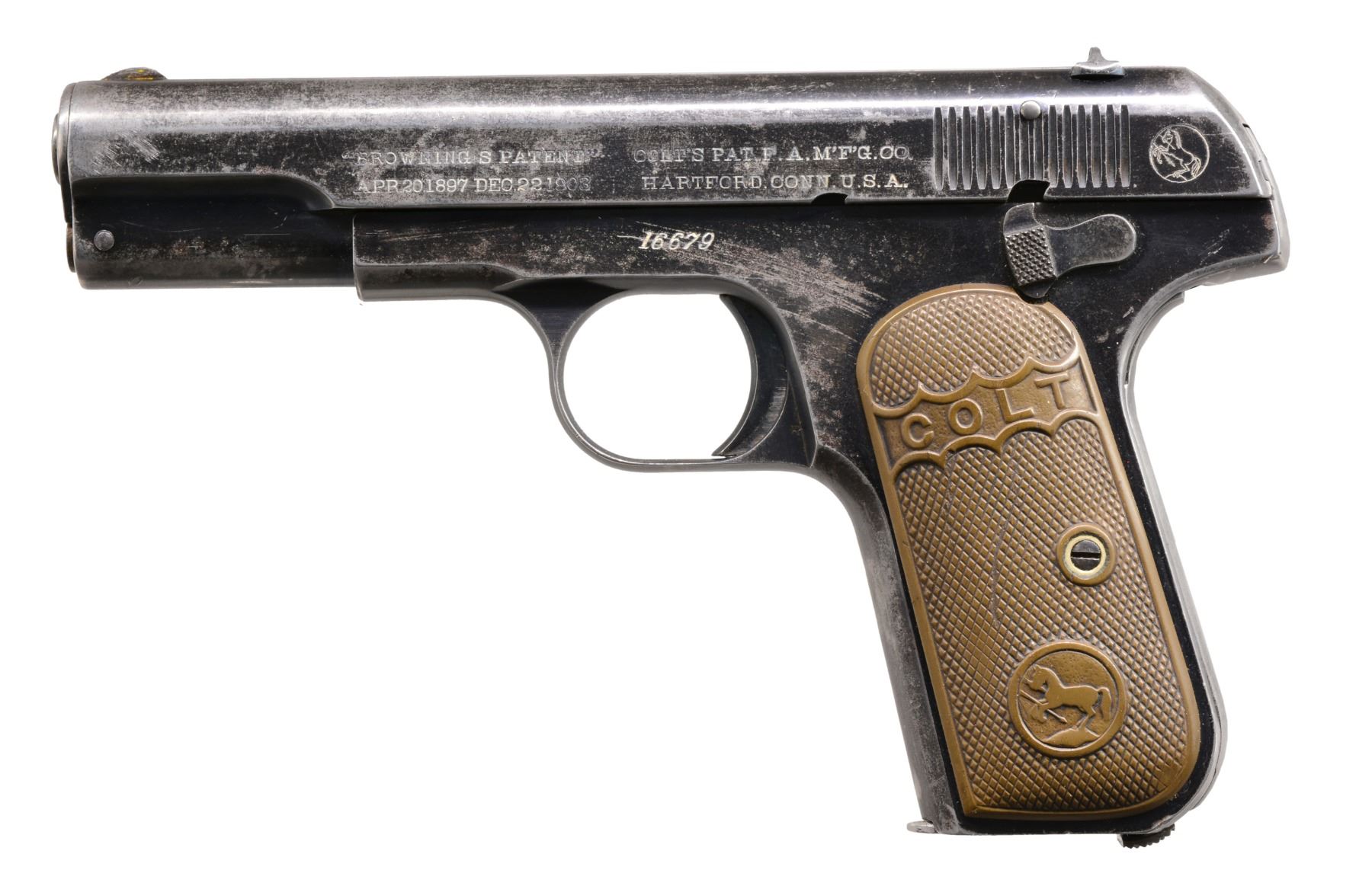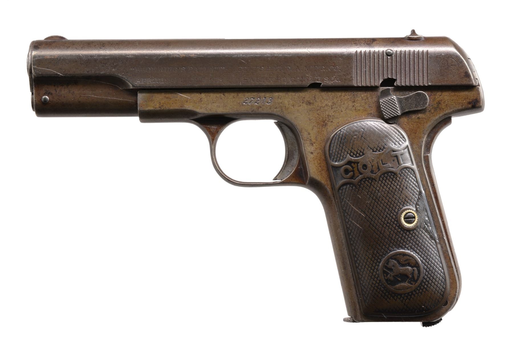 ALL: cal. 32 ACP. Bbl. 4". Type 1 w/ bbl. bushing & no mag. safety. Semi circular front sights w/ fixed U notch rear sights. Blue finish. 2 Piece checkered hard rubber grips. All there pistols mfg. 1905. MAGS: each pistol has 1 detachable 8 rd. mag. 1) S# 27213. CONDITION: metal has faded gray appearance from touch up finish over scattered spots of pitting & corrosion. Grips show heavy wear. Right panel has chip at butt. Left panel has repaired chip behind attachment screw. Bore has a lightly frosted appearance over intact rifling. (20-170/DS). 2) S# 16679. CONDITION: 60% dull fading blue blending w/ wear spots, handling marks & sm. spots of pitting. Grips show moderate wear. Bore has slightly darkened appearance over lightly worn rifling. (20-174/DS). 3) S# 19188. CONDITION: 70% dark worn reblued finish over weakened markings. Grips show heavy wear. Right panel is cracked from attachment screw through Rampant Colt to lower front corner w/ a 2nd crack along upper front edge. Left panel has hairline crack extending from front to Rampant Colt. Dark pitted bore retaining partially visible rifling. (20-176/DS). ALL CURIO. $800-1,200.