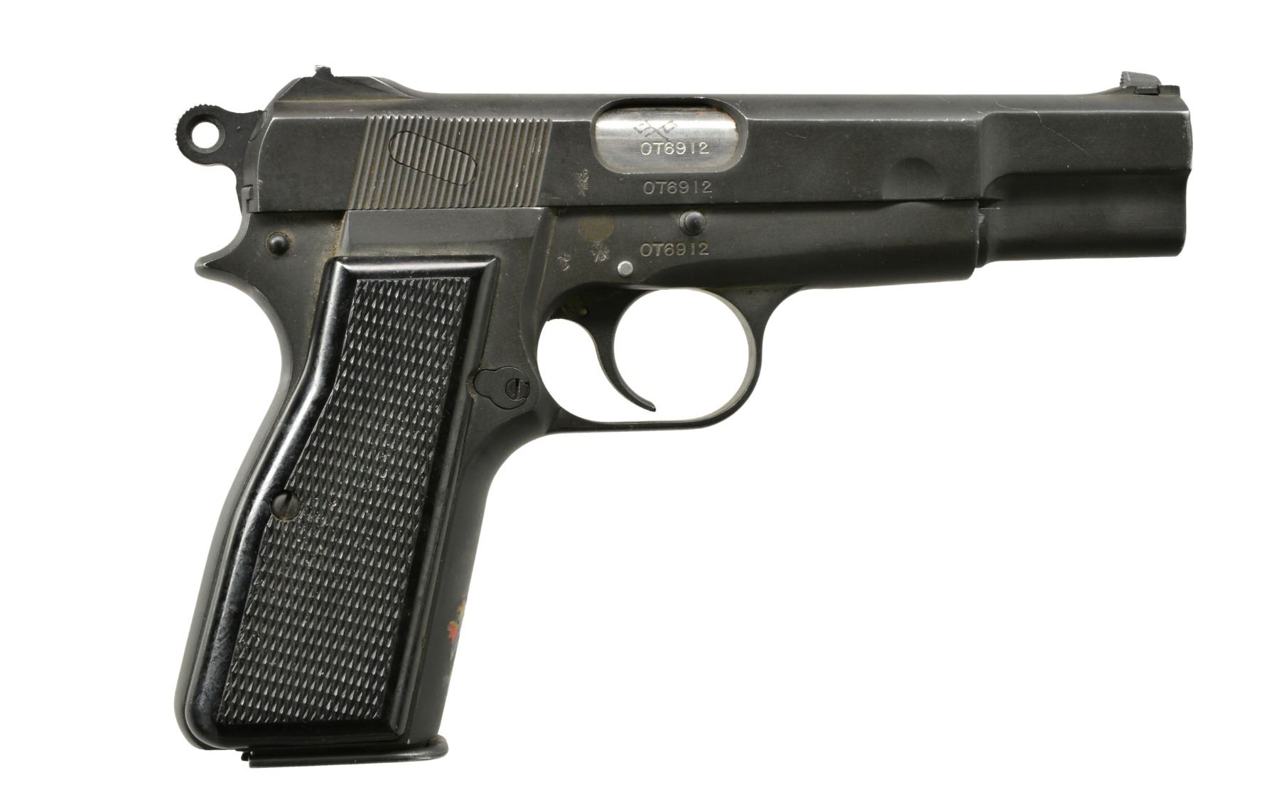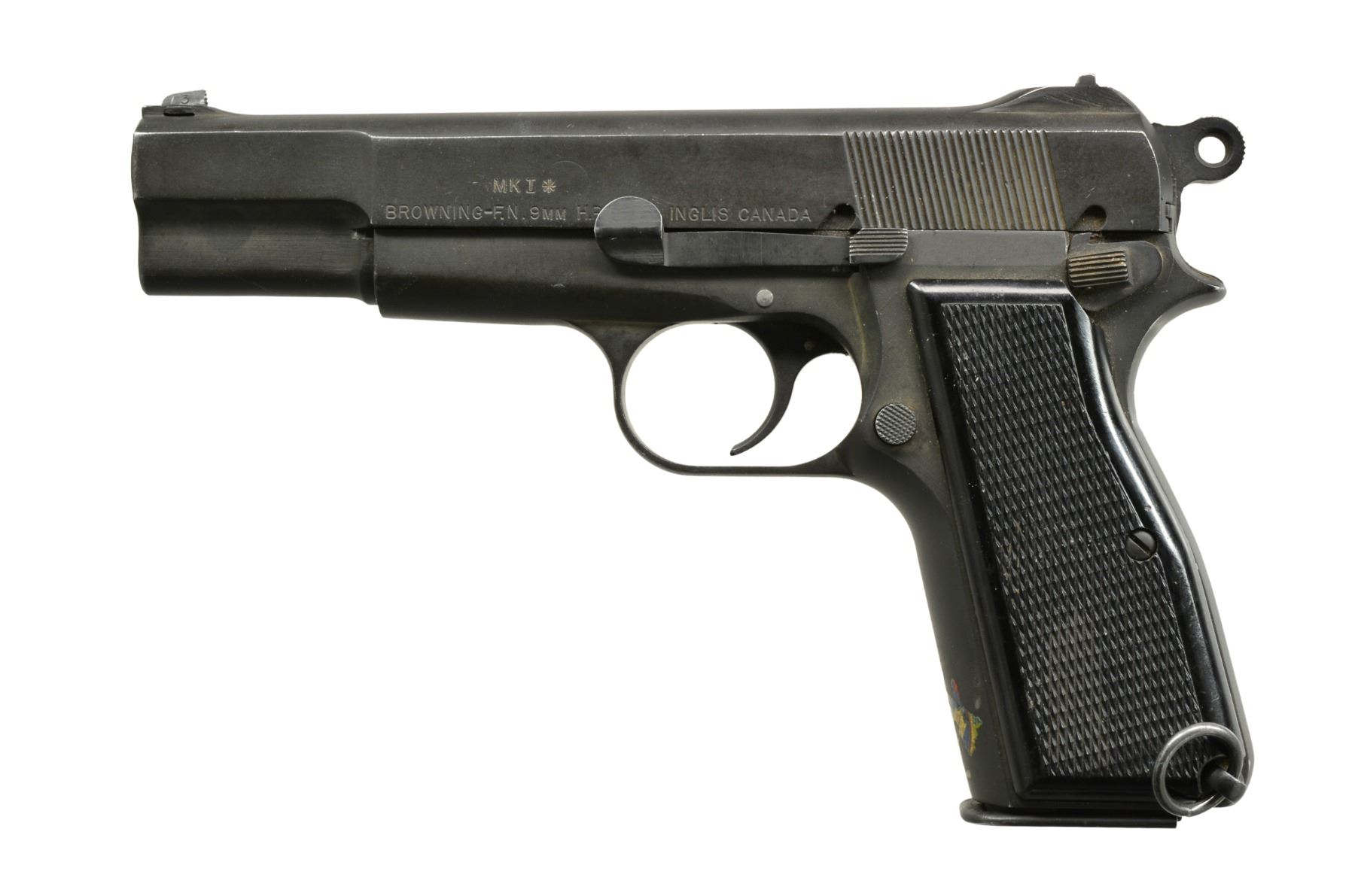 PISTOL. Cal. 9mm Luger. S# 0T6912. Bbl. 4 3/4". Mfg. late 1944 into mid 1945 w/ 0-9 prefix before T of S#. 0 prefix indicates earliest example created partially from Chinese contract leftovers. Left side of frame above trigger has Canadian broad arrow w/in C & Long Branch crossed pennant proof. Matte finished w/ matching numbered frame, slide & bbl. Bbl. at port above S# has electro engraved crossed pennants w/out letters. Grip frame properly not slotted & about 40% of original decal at base of front strap. Dovetailed front sight & fixed square notched rear. Has mag. safety, ring hammer & thumb print in slide to enhance takedown. Checkered black plastic grips & lanyard loop at lower left rear of butt. MAGS: 1 very good parkerized 13 rd. w/ aluminum follower & "JI" marked split base. CONDITION: good plus overall appearance w/ numerous light marks, slight areas of high point wear & functional wear. Trigger pivot & mag. safety pin in trigger are in the white. Very good grips. Good plus bore w/ occasional spot of faint cleaned pitting. (20-636/NW). CURIO. $750-1,000.