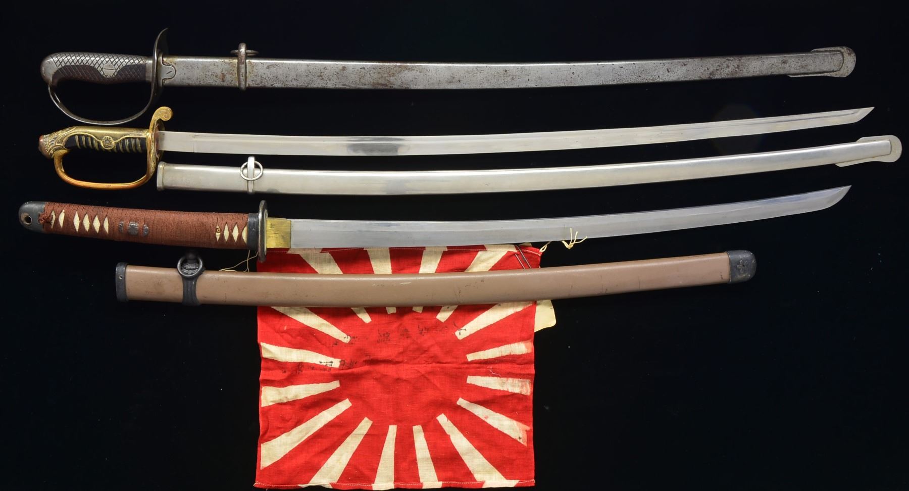 Lot 1413 3 JAPANESE SWORDS & JAPANESE RISING SUN FLAG.