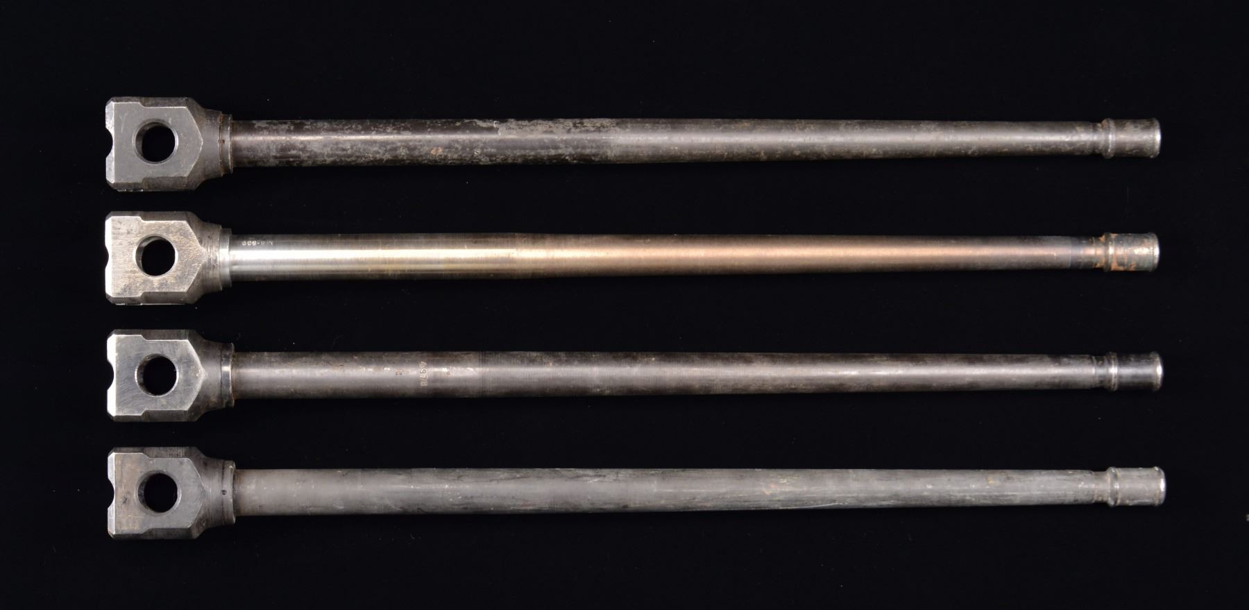 All 22 1/2" including extension. 2 Chambered in 8mm Mauser, 2 chambered in 7.62x51 NATO. Bbl. 1) marked "308-Win" in 2 places at chamber. Bbl. extension marked "BD" w/ waffen "189". Bbl. 2) externally blued & marked "4978" & "C" plus marking that resemble Steyr target logo, also marked "7.62x51 VCL140 2963". Bbl. extension markings include "dot" & "E8". Bbl. 3) externally parkerized. Marked "PO / 5 / "CYP / S 5886 / 2" & waffen "88". Bbl. extension marked "8s", "7.91" & "cs?". Bbl. 4) blued exterior w/ early patina. Marked "cnx" w/ illegible waffenampts plus "1/3" in circle. Bbl. extension marked "dot" w/ illegible waffenampt plus "d", "AB8" & "2". CONDITION: all have strong rifling. 1 Bbl. mostly devoid of exterior finish w/ patina around exterior of muzzle. (02-13467/JZ). $400-600