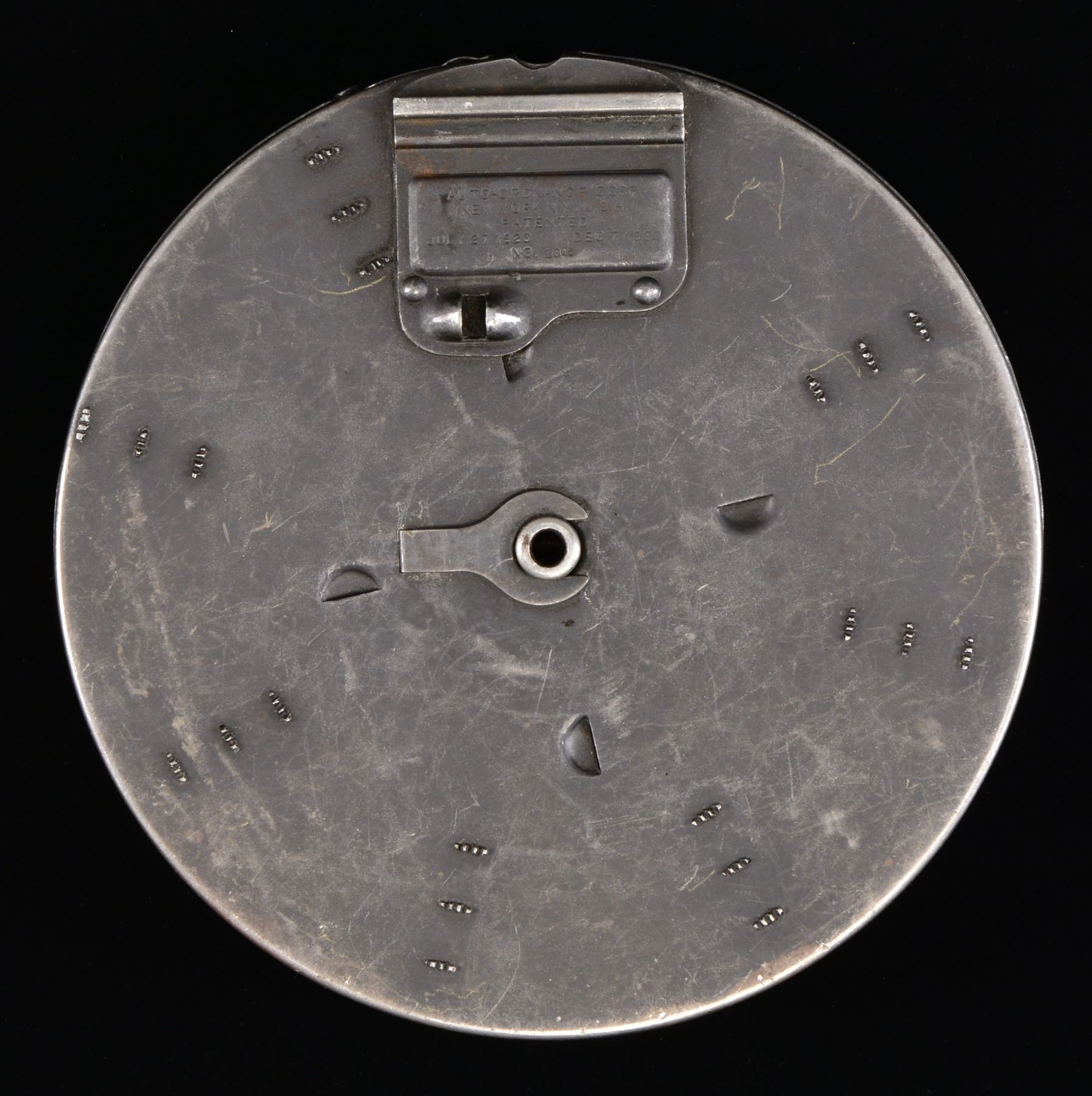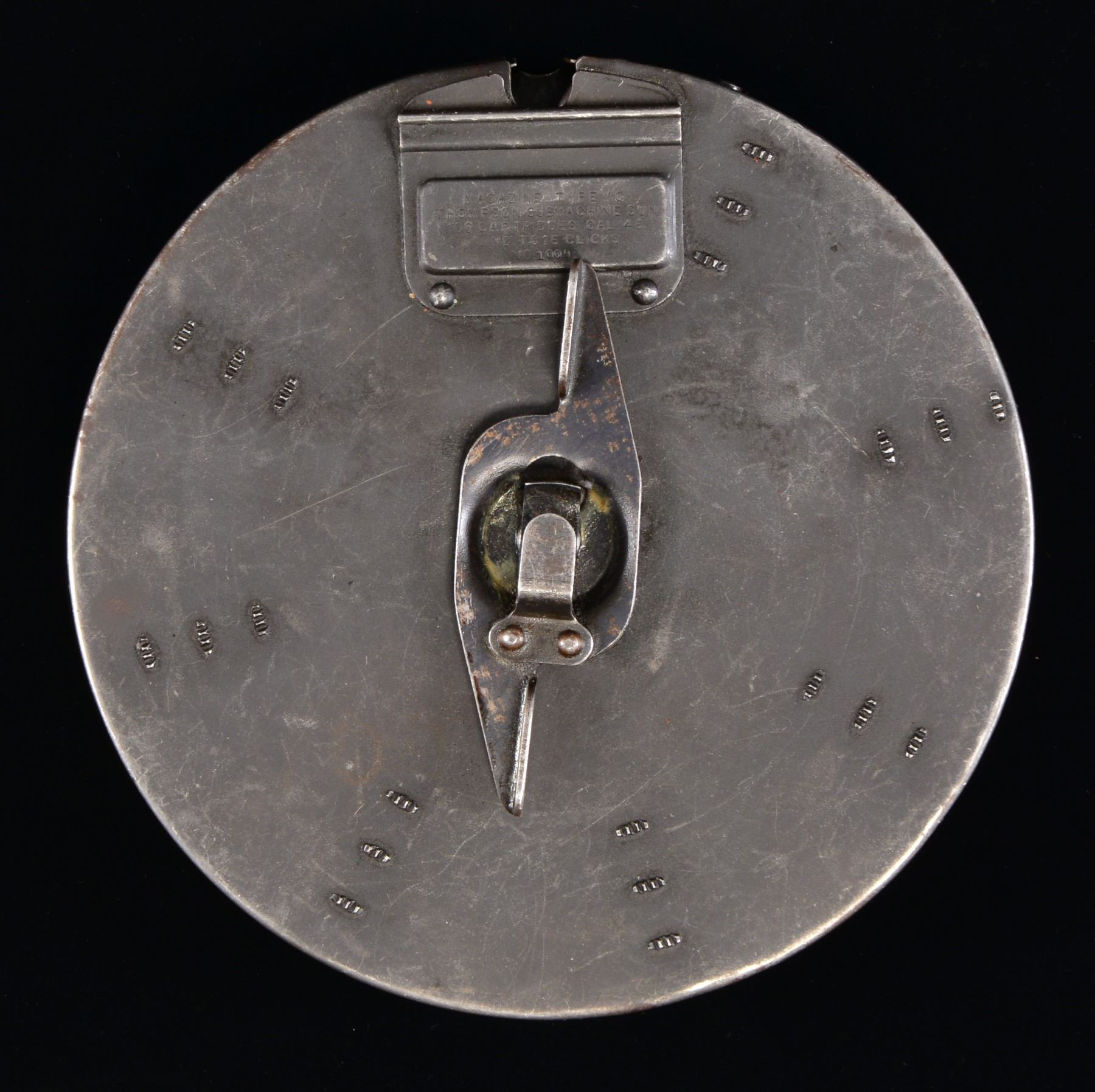 Desirable, black finished type C mag. for the classic Thompson SMG. The 100-rd. drum is the perfect accessory for "The Gun that made the 20"s Roar" or "Chicago Typewriter". Front data plate reads "MAGAZINE TYPE C / THOMPSON SUBMACHINE GUN / 100 CARTRIDGES CAL 45 / WIND TO 15 CLICKS / NO 1009", back cover reads "AUTO-ORDNANCE CORP / NEW YORK NY USA / PATENDED / JULY 27 1920 DEC 7 1920 / NO 1006". CONDITION: appears to be operational, though it hasn't been loaded; finish is uniform & thinning in some spots, w/o obvious major defect; this cataloger finds it interesting that the front & rear serial number would be non matching due to a single digit that could have been transposed during the marking process, its not uncommon to find non matching numbered parts, but to be so close & only have a single digit that could be flipped upside down different is quite interesting. (02-13612/JZ). $1,750-2,250.