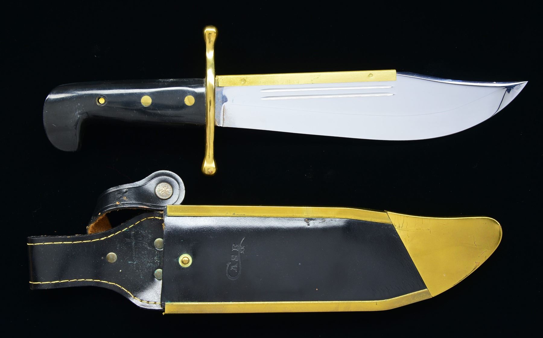 9 1/4" Blade Bowie style knife by Case. Knife marked on left ricasso "CASE XX USA 1836". Tip has etched portrait of frontiersman holding bowie knife. Blade has brass guard along back. Brass guard. Composite one piece bird's head type grip secured w/ 3 brass rivets. Leather sheath marked "CASE" w/ brass reinforced tip & edges. CONDITION: blade is in good condition w/ light handling marks. Grips have scattered scratches throughout. Rear rivet is missing head on right side. Scabbard has scattered scratches & handling marks, but in good serviceable condition. (02-13610/RW). $100-150.
