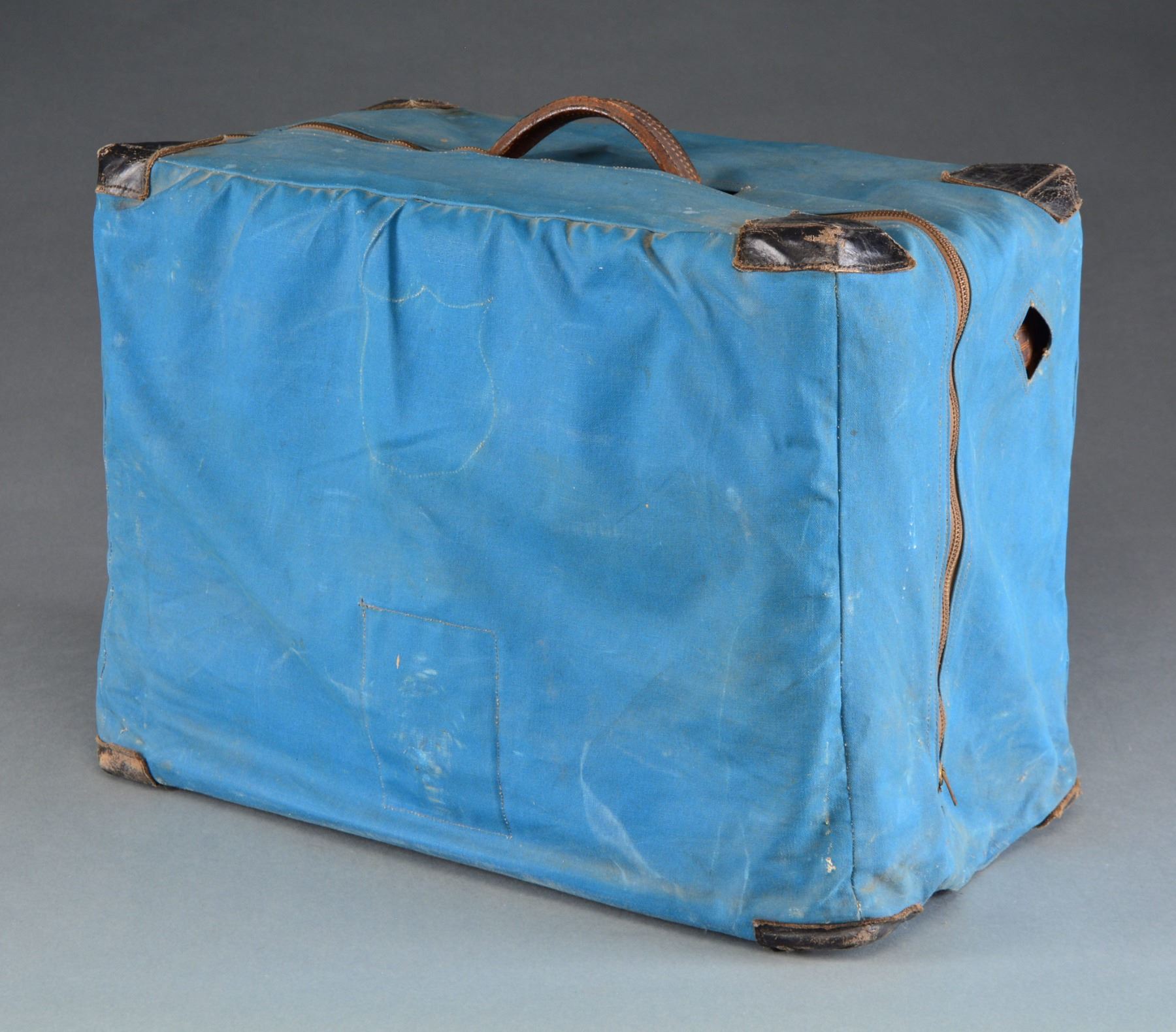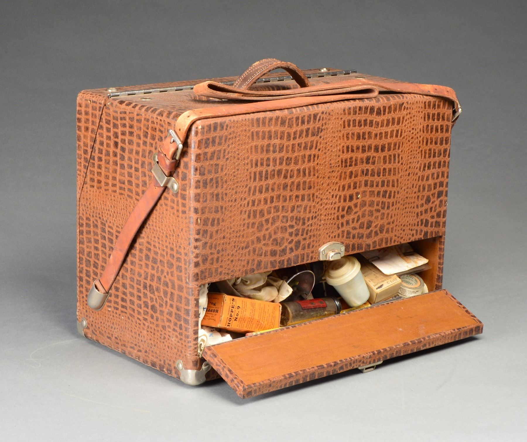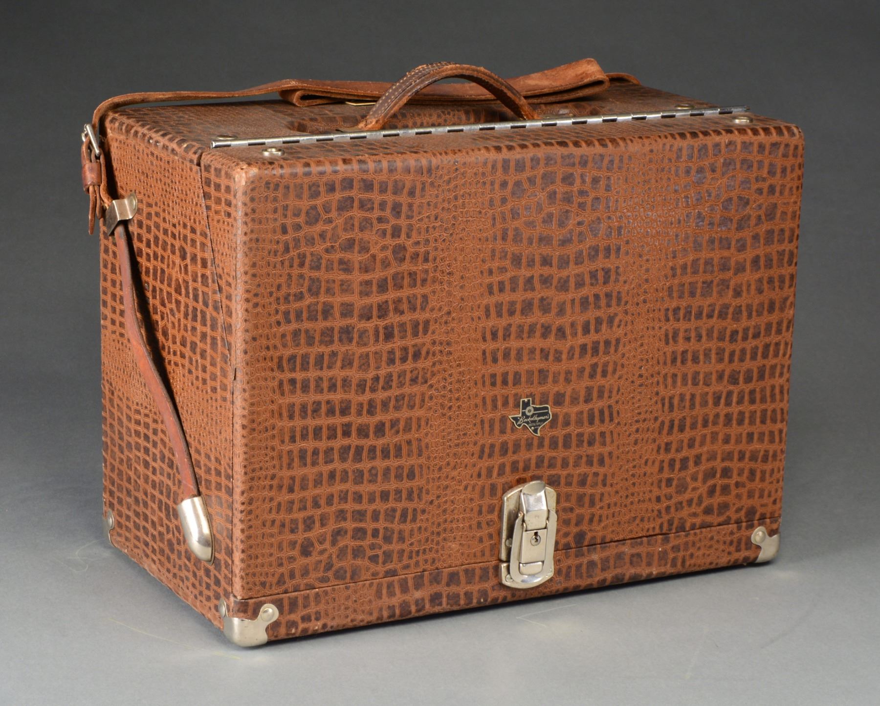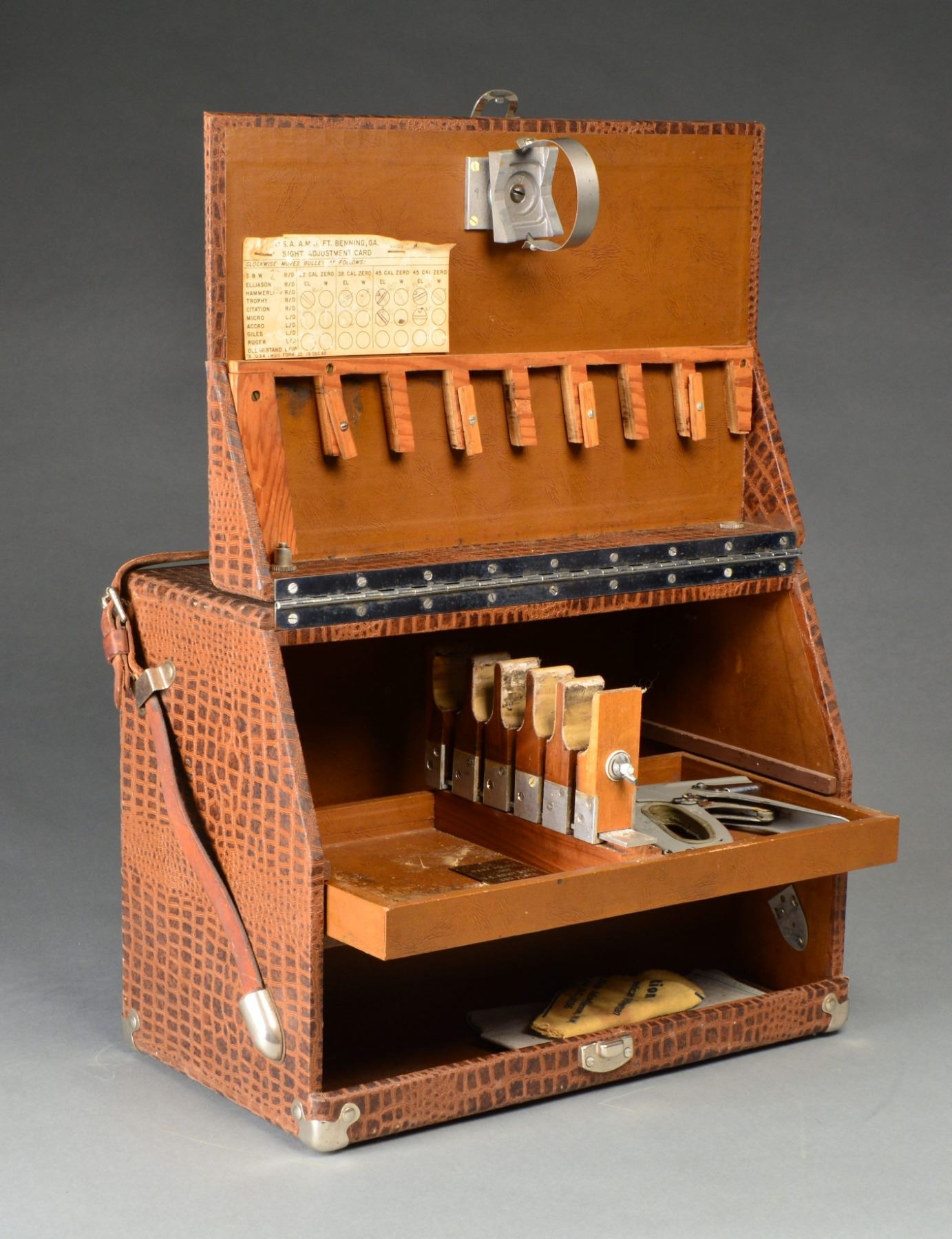Beckelhymer's Shooting Supplies 18" x 13" x 10" range box w/ simulated alligator hide covering, stitched leather handle & leather carrying strap. Top of box has name plate marked "BROPHY". Front compartment has sliding shelf w/ clamps to hold 5 handguns. Compartment contains a 4 1/2" x 1 7/8" brass plated marked "US / PARK POLICE / 1957 / U.S. ARMY GREY / 2ND PLACE / 1137-35X / .22 CAL. / LT COL W.A. HANCOCK / M/ SGT R.RATLIFF / M/ SGT R.A.STINEMAN / SFC J.R.EVERSOLE". Compartment also contains target stapler & cleaning clothes. Stapled to inside of lid is a sight adj. card marked "U.S.A. A.M.U. FT. BENNING. GA.". Rear compartment of case hold an eclectic assortment of shooters supplies & misc. accessories. Also includes blue plasticized cloth case cover. CONDITION: case is in generally good condition showing light wear. Case color is in poor condition w/ reinforced edges, tears & grime. PROVENANCE: From the collection of Lt. Col. William S. Brophy. (02-13242/DS). $200-300.