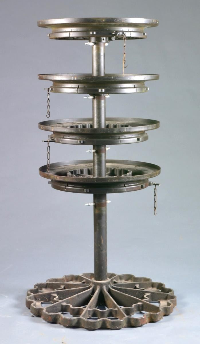Military appearing altered rack w/ 5 steel circles for storage. Base circle w/ 28" diameter allows for 20 rifle butts. Remaining circles w/ 22" diameter allow for bbls. but spacing is too close & too many circles, so upper tiers are used for handguns, most likely 1911s. Upper tier top has embossed the words "arm- rack" & "M1920". Also has a sliding device that will lock the trigger guards of pistols in place. First circle is 20" above base & others w/ 10" in between each tier. Total height of rack 51". Rack has space for 80 pistols total. CONDITION: very good. (02-13464/NW). $200-400.