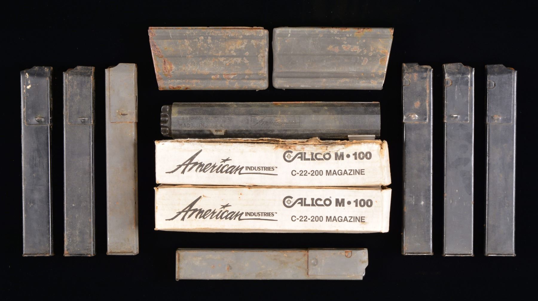 7 Unmarked 32 rd. STEN mags. / 2 Metric FAL 20 rd. mags. / 3 Calico M100 22 LR mags. w/ damaged original packaging. Mags. Marked "CALICO M100 22 LR". Box also marked "C-22-200 MAGAZINE". CONDITION: all mags. appear serviceable. STEN mags. have light wear, oxidation & fine pitting throughout. FAL mags. have dull phosphate type finish w/ light worn oxidized appearance. 1 M100 mag. has oxidized sheet metal. Remaining 2 mags. have scattered very light oxidation on sheet metal. (02-13542/RW). $150-225.