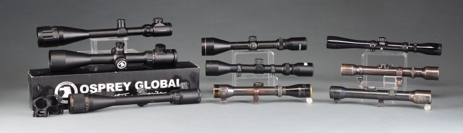 1) KAHLES WIEN H/4x60 w/ integral claw mts. German 3 post reticle w/ elevation adj. CONDITION: scope has 60% original finish w/ thinning, wear & notable lg. spot of missing finish on left side of ocular bell. Scope appears cloudy, elevation adj. is immovable. 2) PRAHA LOVEC MADE IN CZECHOSLOVAKIA 4x w/ integral claw mts. Adj. focus. German 3 post reticle. CONDITION: scope has wear, thinning turning gray w/ slightly cloudy but serviceable optics. 3) GERMAN SCOPE w/ claw mts. Marked "Hensoldt Wetzlar / 4x". Adj. focus. German 3 post reticle. Illegible German lettering on ocular bell. CONDITION: scope has flaking, scratched black anodized finish on bells. Balance of tube is blue turning patina w/ wear & light oxidation. Optics appear slightly cloudy, but serviceable. 4) BUSHNELL BANNER 6x32 SCOPE w/ duplex reticle. Includes scope rings for 1 piece set. CONDITION: scope has light wear & handling marks. Optics appear clear & serviceable. 5) BUSHNELL 3x-9x40 SCOPE. Fitted w/ rings for 1 piece scope base. CONDITION: scope has light wear & scratches. Optics appear slightly cloudy, but serviceable. Has spot of lint inside of scope. 6) TASCO 3x-9x50 SCOPE w/ fine duplex reticle. Made in China. CONDITION: scope has light wear & scratches. Optics appear clear & serviceable. 7) BUSHNELL WIDE ANGLE SCOPE w/ illuminated reticle 4x16 AO. CONDITION: reticle does not luminate. Scope has light wear & handling marks. Optics appear clear & serviceable. 8) IMPORTED SCOPE marked "6-24x50AOEG". Illuminated range finding reticle AO. CONDITION: scope in very good condition. Optics are clear & serviceable. 9) OSPREY GLOBAL SIGNATURE SERIES 4x16 50mm SCOPE made in China using Japanese components. AO. Scope has box, manuals, accessories. Set of 50mm rings for Weaver bases. Illuminated reticle. Finger tip adjustments. Also includes 3" sunshade. CONDITION: near new in box. (02-13547/RW). $300-600.