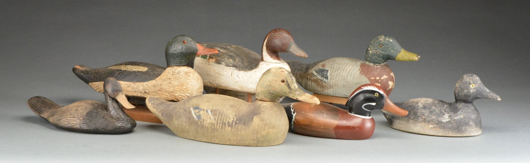 1) Unmarked Goldeneye w/ hand painted eyes & made in 1 piece. Keel is missing. 2) Mallard rough machine turned. Made w/out keel. 3) Wood Duck decoy w/ detailed maroon & black colors, glass eyes. 4) Pintail duck decoy made by Herters Decoy Company early 1940s. Balsa wood body w/ birch head. Glass eyes & keel. Faded worn original paint job. Head is loose. 5) Blue wing teal. 2 Piece construction w/ glass eyes, rough turned body. Fading colors & head is loose. 6) Unknown decoy w/ black head & back. 2 Piece construction w/ glass eyes. Has keel. Fading colors w/ staining & lg. chip missing from tail. 7) Ornamental duck resembling decoy w/ carved feathers & dull stained finish. Included are 3 wooden display stands w/ 4 posts. (02-12484-3/RW). $100-200.